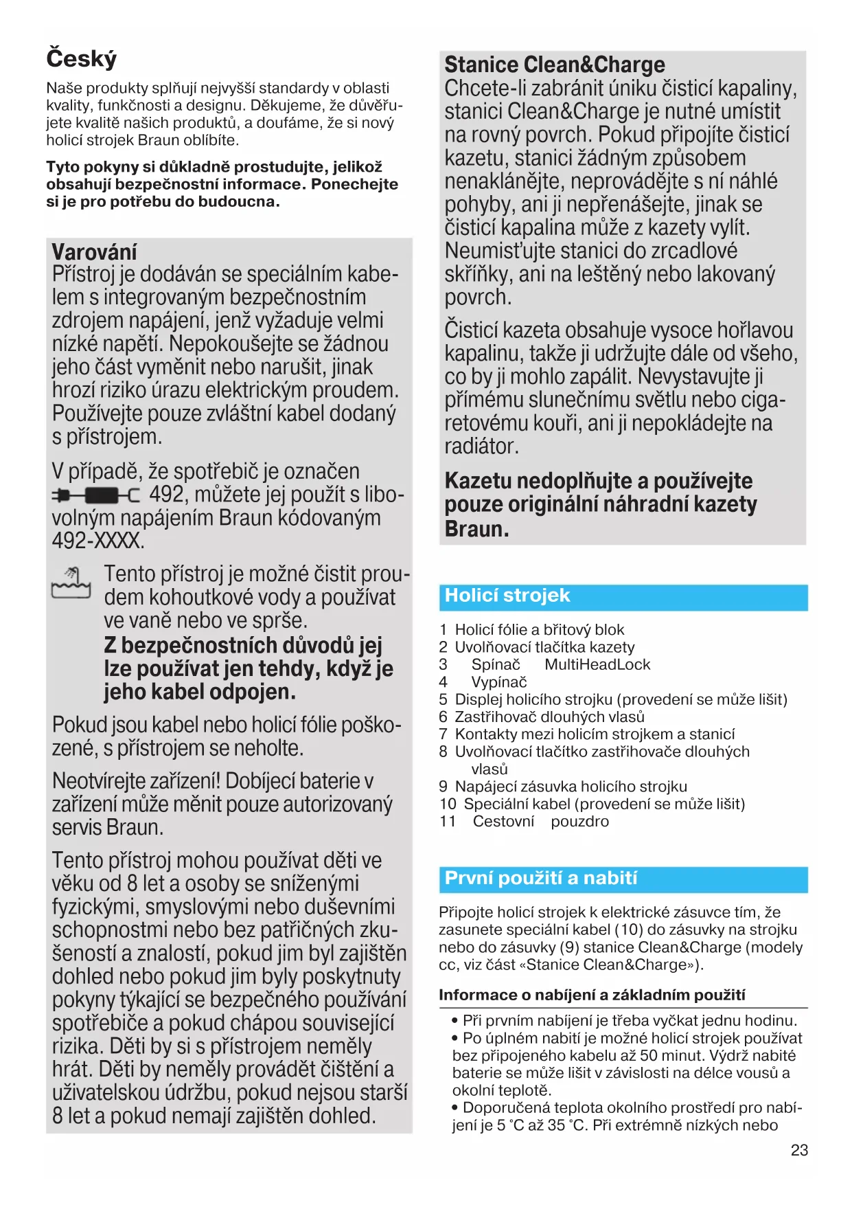 Zwiększone zużycie płynu do czyszczenia. Drenaż stacji czyszcząco- ładującej jest zatkany. – Wyczyścić drenaż drewnianą wykałaczką. – Regularnie przecierać wanienkę. 91845280_Series_9-2_CEEMEA_S6-96.indd 2291845280_Series_9-2_CEEMEA_S6-96.indd 22 06.04.18 10:0506.04.18 10:05 Business Use - P&G AUTHORIZED POA-00042214 Rev 001 Effective Date 2018-04-09 Printed 2018-07-25 Page 22 of 9623 Česk Naše produkty splňují nejvyšší standardy v oblasti kvality, funkčnosti a designu. Děkujeme, že důvěřu- jete kvalitě našich produktů, a doufáme, že si nový holicí strojek Braun oblíbíte. Tyto pokyny si důkladně prostudujte, jelikož obsahují bezpečnostní informace. Ponechejte si je pro potřebu do budoucna. Varování Přístroj je dodáván se speciálním kabe- lem s integrovaným bezpečnostním zdrojem napájení, jenž vyžaduje velmi nízké napětí. Nepokoušejte se žádnou jeho část vyměnit nebo narušit, jinak hrozí riziko úrazu elektrickým proudem. Používejte pouze zvláštní kabel dodaný s přístrojem. V případě, že spotřebič je označen 492, můžete jej použít s libo- volným napájením Braun kódovaným 492-XXXX. Tento přístroj je možné čistit prou- dem kohoutkové vody a používat ve vaně nebo ve sprše. Z bezpečnostních důvodů jej lze používat jen tehdy, když je jeho kabel odpojen. Pokud jsou kabel nebo holicí fólie poško- zené, s přístrojem se neholte. Neotvírejte zařízení! Dobíjecí baterie v zařízení může měnit pouze autorizovaný servis Braun. Tento přístroj mohou používat děti ve věku od 8 let a osoby se sníženými fyzickými, smyslovými nebo duševními schopnostmi nebo bez patřičných zku- šeností a znalostí, pokud jim byl zajištěn dohled nebo pokud jim byly poskytnuty pokyny týkající se bezpečného používání spotřebiče a pokud chápou související rizika. Děti by si s přístrojem neměly hrát. Děti by neměly provádět čištění a uživatelskou údržbu, pokud nejsou starší 8 let a pokud nemají zajištěn dohled. Stanice Clean&Charge Chcete-li zabránit úniku čisticí kapaliny, stanici Clean&Charge je nutné umístit na rovný povrch. Pokud připojíte čisticí kazetu, stanici žádným způsobem nenaklánějte, neprovádějte s ní náhlé pohyby, ani ji nepřenášejte, jinak se čisticí kapalina může z kazety vylít. Neumisťujte stanici do zrcadlové skříňky, ani na leštěný nebo lakovaný povrch. Čisticí kazeta obsahuje vysoce hořlavou kapalinu, takže ji udržujte dále od všeho, co by ji mohlo zapálit. Nevystavujte ji přímému slunečnímu světlu nebo ciga- retovému kouři, ani ji nepokládejte na radiátor. Kazetu nedoplňujte a používejte pouze originální náhradní kazety Braun. Holicí strojek 1 Holicí fólie a břitový blok 2 Uvolňovací tlačítka kazety 3 Spínač MultiHeadLock 4 Vypínač 5 Displej holicího strojku (provedení se může lišit) 6 Zastřihovač dlouhých vlasů 7 Kontakty mezi holicím strojkem a stanicí 8 Uvolňovací tlačítko zastřihovače dlouhých vlasů 9 Napájecí zásuvka holicího strojku 10 Speciální kabel (provedení se může lišit) 11 Cestovní pouzdro První použití a nabití Připojte holicí strojek k elektrické zásuvce tím, že zasunete speciální kabel (10) do zásuvky na strojku nebo do zásuvky (9) stanice Clean&Charge (modely cc, viz část «Stanice Clean&Charge»). Informace o nabíjení a základním použití