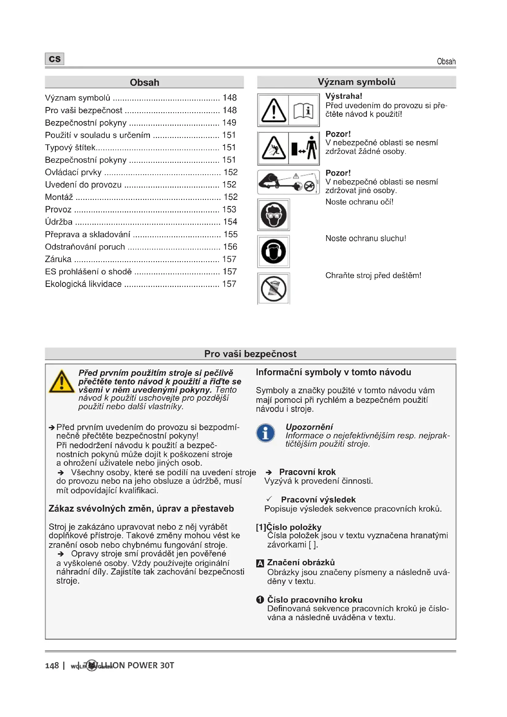 - Ekologická likvidace Provašibezpečnost Významsymbolů Výstraha! Před uvedením do provozu si pře- čtěte návod k použití! Pozor! V nebezpečné oblasti se nesmí zdržovat žádné osoby. 360° Pozor! V nebezpečné oblasti se nesmí zdržovat jiné osoby. Noste ochranu očí! Noste ochranu sluchu! Chraňte stroj před deštěm!Bezpečnostní pokyny p. 157