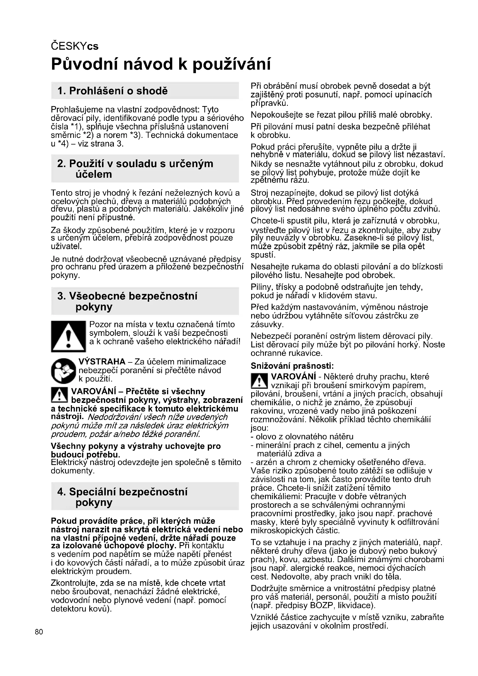 Původní návod k používání Prohlašujeme na vlastní zodpovědnost: Tyto děrovací pily, identifikované podle typu a sériového čísla *1), splňuje všechna příslušná ustanovení směrnic *2) a norem *3). Technická dokumentace u *4) – viz strana 3. Tento stroj je vhodný k řezání neželezných kovů a ocelových plechů, dřeva a materiálů podobných dřevu, plastů a podobných materiálů. Jakékoliv jiné použití není přípustné. Za škody způsobené použitím, které je v rozporu s určeným účelem, přebírá zodpovědnost pouze uživatel. Je nutné dodržovat všeobecně uznávané předpisy pro ochranu před úrazem a přiložené bezpečnostní pokyny. Pozor na místa v textu označená tímto symbolem, slouží k vaší bezpečnosti a k ochraně vašeho elektrického nářadí! VÝSTRAHA – Za účelem minimalizace nebezpečí poranění si přečtěte návod k použití. VAROVÁNÍ – Přečtěte si všechny bezpečnostní pokyny, výstrahy, zobrazení a technické specifikace k tomuto elektrickému nástroji. Nedodržování všech níže uvedených pokynů může mít za následek úraz elektrickým proudem, požár a/nebo těžké poranění. Všechny pokyny a výstrahy uchovejte pro budoucí potřebu. Elektrický nástroj odevzdejte jen společně s těmito dokumenty. Pokud provádíte práce, při kterých může nástroj narazit na skrytá elektrická vedení nebo na vlastní přípojné vedení, držte nářadí pouze za izolované úchopové plochy. Při kontaktu s vedením pod napětím se může napětí přenést i do kovových částí nářadí, a to může způsobit úraz elektrickým proudem. Zkontrolujte, zda se na místě, kde chcete vrtat nebo šroubovat, nenachází žádné elektrické, vodovodní nebo plynové vedení (např. pomocí detektoru kovů). Při obrábění musí obrobek pevně dosedat a být zajištěný proti posunutí, např. pomocí upínacích přípravků. Nepokoušejte se řezat pilou příliš malé obrobky. Při pilování musí patní deska bezpečně přiléhat k obrobku. Pokud práci přerušíte, vypněte pilu a držte ji nehybně v materiálu, dokud se pilový list nezastaví. Nikdy se nesnažte vytáhnout pilu z obrobku, dokud se pilový list pohybuje, protože může dojít ke zpětnému rázu. Stroj nezapínejte, dokud se pilový list dotýká obrobku. Před provedením řezu počkejte, dokud pilový list nedosáhne svého úplného počtu zdvihů. Chcete-li spustit pilu, která je zaříznutá v obrobku, vystřeďte pilový list v řezu a zkontrolujte, aby zuby pily neuvázly v obrobku. Zasekne-li se pilový list, může způsobit zpětný ráz, jakmile se pila opět spustí. Nesahejte rukama do oblasti pilování a do blízkosti pilového listu. Nesahejte pod obrobek. Piliny, třísky a podobně odstraňujte jen tehdy, pokud je nářadí v klidovém stavu. Před každým nastavováním, výměnou nástroje nebo údržbou vytáhněte síťovou zástrčku ze zásuvky. Nebezpečí poranění ostrým listem děrovací pily. List děrovací pily může být po pilování horký. Noste ochranné rukavice. Snižování prašnosti: VAROVÁNÍ - Některé druhy prachu, které vznikají při broušení smirkovým papírem, pilování, broušení, vrtání a jiných pracích, obsahují chemikálie, o nichž je známo, že způsobují rakovinu, vrozené vady nebo jiná poškození rozmnožování. Několik příklad těchto chemikálií jsou: - olovo z olovnatého nátěru - minerální prach z cihel, cementu a jiných materiálů zdiva a - arzén a chrom z chemicky ošetřeného dřeva. Vaše riziko způsobené touto zátěží se odlišuje v závislosti na tom, jak často provádíte tento druh práce. Chcete-li snížit zatížení těmito chemikáliemi: Pracujte v dobře větraných prostorech a se schválenými ochrannými pracovními prostředky, jako jsou např. prachové masky, které byly speciálně vyvinuty k odfiltrování mikroskopických částic. To se vztahuje i na prachy z jiných materiálů, např. některé druhy dřeva (jako je dubový nebo bukový prach), kovu, azbestu. Dalšími známými chorobami jsou např. alergické reakce, nemoci dýchacích cest. Nedovolte, aby prach vnikl do těla. Dodržujte směrnice a vnitrostátní předpisy platné pro váš materiál, personál, použití a místo použití (např. předpisy BOZP, likvidace). Vzniklé částice zachycujte v místě vzniku, zabraňte jejich usazování v okolním prostředí.