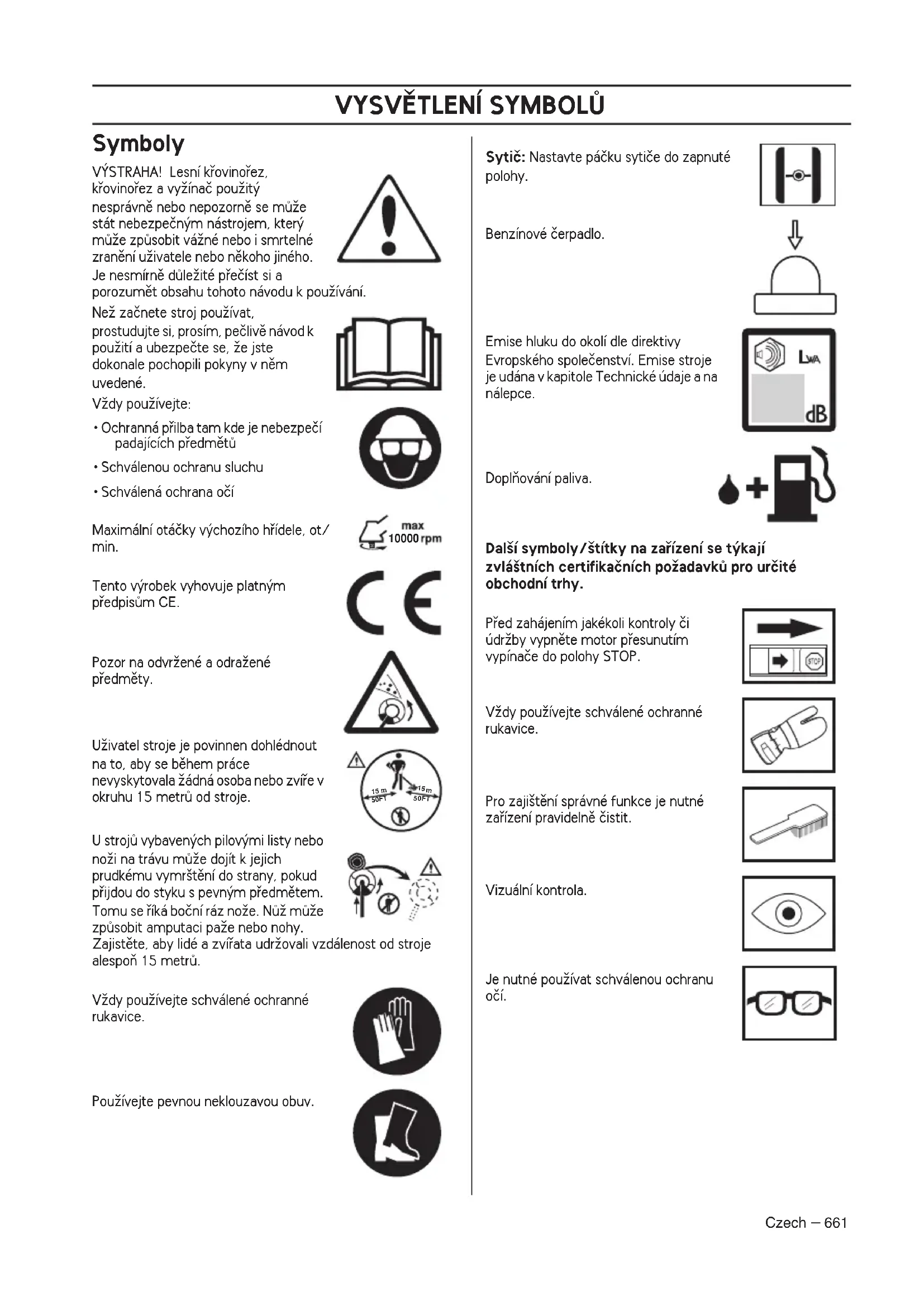 - Schválená ochrana oãí Maximální otáãky v˘chozího hfiídele, ot/ min. Tento v˘robek vyhovuje platn˘m pfiedpisÛm CE. Pozor na odvrÏené a odraÏené pfiedmûty. UÏivatel stroje je povinnen dohlédnout na to, aby se bûhem práce nevyskytovala Ïádná osoba nebo zvífie v okruhu 15 metrÛ od stroje. U strojÛ vybaven˘ch pilov˘mi listy nebo noÏi na trávu mÛÏe dojít k jejich prudkému vymr‰tûní do strany, pokud pfiijdou do styku s pevn˘m pfiedmûtem. Tomu se fiíká boãní ráz noÏe. NÛÏ mÛÏe zpÛsobit amputaci paÏe nebo nohy. Zajistûte, aby lidé a zvífiata udrÏovali vzdálenost od stroje alespoÀ 15 metrÛ. VÏdy pouÏívejte schválené ochranné rukavice. PouÏívejte pevnou neklouzavou obuv. Sytiã: Nastavte páãku sytiãe do zapnuté polohy. Benzínové ãerpadlo. Emise hluku do okolí dle direktivy Evropského spoleãenství. Emise stroje je udána v kapitole Technické údaje a na nálepce. DoplÀování paliva. Dal‰í symboly/‰títky na zafiízení se t˘kají zvlá‰tních certifikaãních poÏadavkÛ pro urãité obchodní trhy. Pfied zahájením jakékoli kontroly ãi údrÏby vypnûte motor pfiesunutím vypínaãe do polohy STOP. VÏdy pouÏívejte schválené ochranné rukavice. Pro zaji‰tûní správné funkce je nutné zafiízení pravidelnû ãistit. Vizuální kontrola. Je nutné pouÏívat schválenou ochranu oãí.