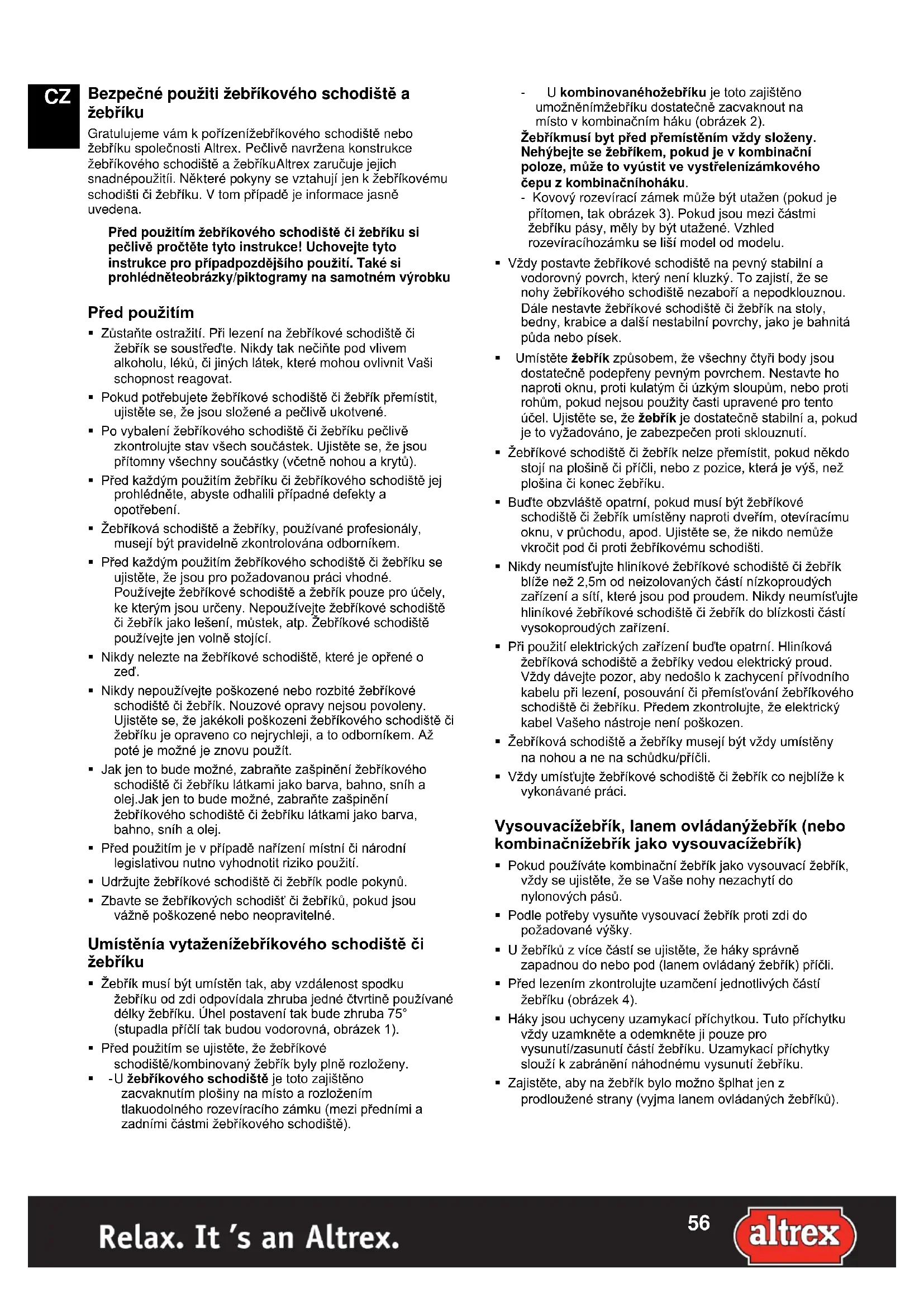 Bezpečné pouţiti ţebříkového schodiště a ţebříku Gratulujeme vám k pořízenížebříkového schodiště nebo žebříku společnosti Altrex. Pečlivě navržena konstrukce žebříkového schodiště a žebříkuAltrex zaručuje jejich snadnépoužitíi. Některé pokyny se vztahují jen k žebříkovému schodišti či žebříku. V tom případě je informace jasně uvedena. Před pouţitím ţebříkového schodiště či ţebříku si pečlivě pročtěte tyto instrukce! Uchovejte tyto instrukce pro případpozdějšího pouţití. Také si prohlédněteobrázky/piktogramy na samotném výrobku Před pouţitím Zůstaňte ostražití. Při lezení na žebříkové schodiště či žebřík se soustřeďte. Nikdy tak nečiňte pod vlivem alkoholu, léků, či jiných látek, které mohou ovlivnit Vaši schopnost reagovat. Pokud potřebujete žebříkové schodiště či žebřík přemístit, ujistěte se, že jsou složené a pečlivě ukotvené. Po vybalení žebříkového schodiště či žebříku pečlivě zkontrolujte stav všech součástek. Ujistěte se, že jsou přítomny všechny součástky (včetně nohou a krytů). Před každým použitím žebříku či žebříkového schodiště jej prohlédněte, abyste odhalili případné defekty a opotřebení. Žebříková schodiště a žebříky, používané profesionály, musejí být pravidelně zkontrolována odborníkem. Před každým použitím žebříkového schodiště či žebříku se ujistěte, že jsou pro požadovanou práci vhodné. Používejte žebříkové schodiště a žebřík pouze pro účely, ke kterým jsou určeny. Nepoužívejte žebříkové schodiště či žebřík jako lešení, můstek, atp. Žebříkové schodiště používejte jen volně stojící. Nikdy nelezte na žebříkové schodiště, které je opřené o zeď. Nikdy nepoužívejte poškozené nebo rozbité žebříkové schodiště či žebřík. Nouzové opravy nejsou povoleny. Ujistěte se, že jakékoli poškozeni žebříkového schodiště či žebříku je opraveno co nejrychleji, a to odborníkem. Až poté je možné je znovu použít. Jak jen to bude možné, zabraňte zašpinění žebříkového schodiště či žebříku látkami jako barva, bahno, sníh a olej.Jak jen to bude možné, zabraňte zašpinění žebříkového schodiště či žebříku látkami jako barva, bahno, sníh a olej. Před použitím je v případě nařízení místní či národní legislativou nutno vyhodnotit riziko použití. Udržujte žebříkové schodiště či žebřík podle pokynů. Zbavte se žebříkových schodišť či žebříků, pokud jsou vážně poškozené nebo neopravitelné. Umístěnía vytaţeníţebříkového schodiště či ţebříku Žebřík musí být umístěn tak, aby vzdálenost spodku žebříku od zdi odpovídala zhruba jedné čtvrtině používané délky žebříku. Úhel postavení tak bude zhruba 75° (stupadla příčlí tak budou vodorovná, obrázek 1). Před použitím se ujistěte, že žebříkové schodiště/kombinovaný žebřík byly plně rozloženy. - U ţebříkového schodiště je toto zajištěno zacvaknutím plošiny na místo a rozložením tlakuodolného rozevíracího zámku (mezi předními a zadními částmi žebříkového schodiště).