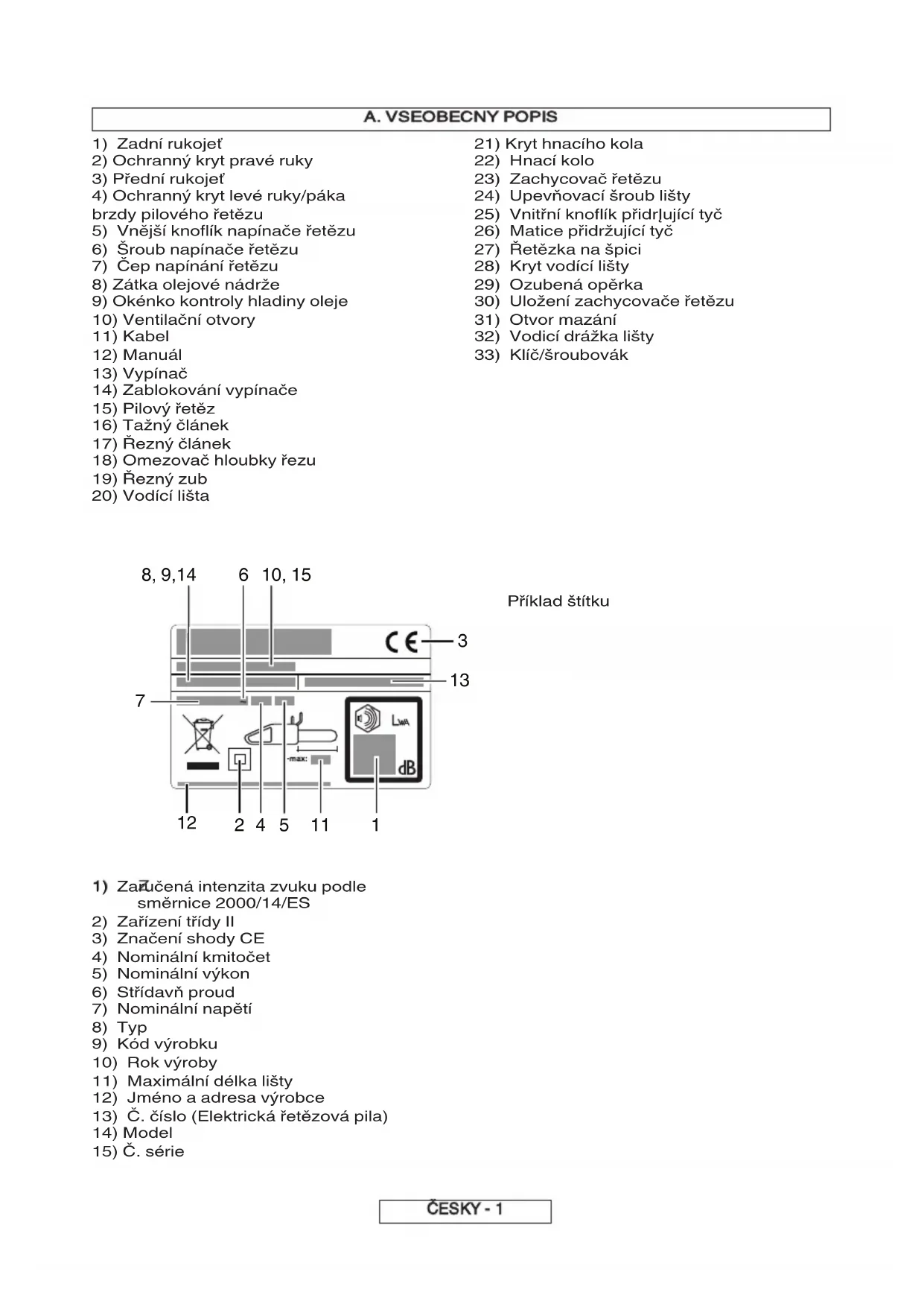 STROJE Operace plnění olejové nádrže musí být provedeny tak, aby řetězový olej neunikal do okolního prostředí . LIKVIDACE Nenechávejte v okolním prostředí nefungující stroj, ale odevzdejte ho firmě, která má povolení k likvidaci odpadků podle předpisů platných norem. Tento symbol na výrobku nebo na obalu znamená, že s výrobkem nelze nakládat jako s odpadem domácnosti. Výrobek je tøeba odnést do pøíslušného sběrného místa k recyklaci elektrických a elektronických zaøízení. Zajištěním øádné likvidace výrobku pomøžete pøedejít potenciálním záporným vlivøm na životní prostøedí a lidské zdraví, které by se mohly projevit v pøípadě likvidace tohoto výrobku nepatøičné zpøsobem. Podrobnější informace o recyklaci tohoto výrobku si vyžádejte na Vašem obecním úøadu, od firmy zabývající se likvidací domácího odpadu anebo v prodejně, kde jste výrobek zakoupili.