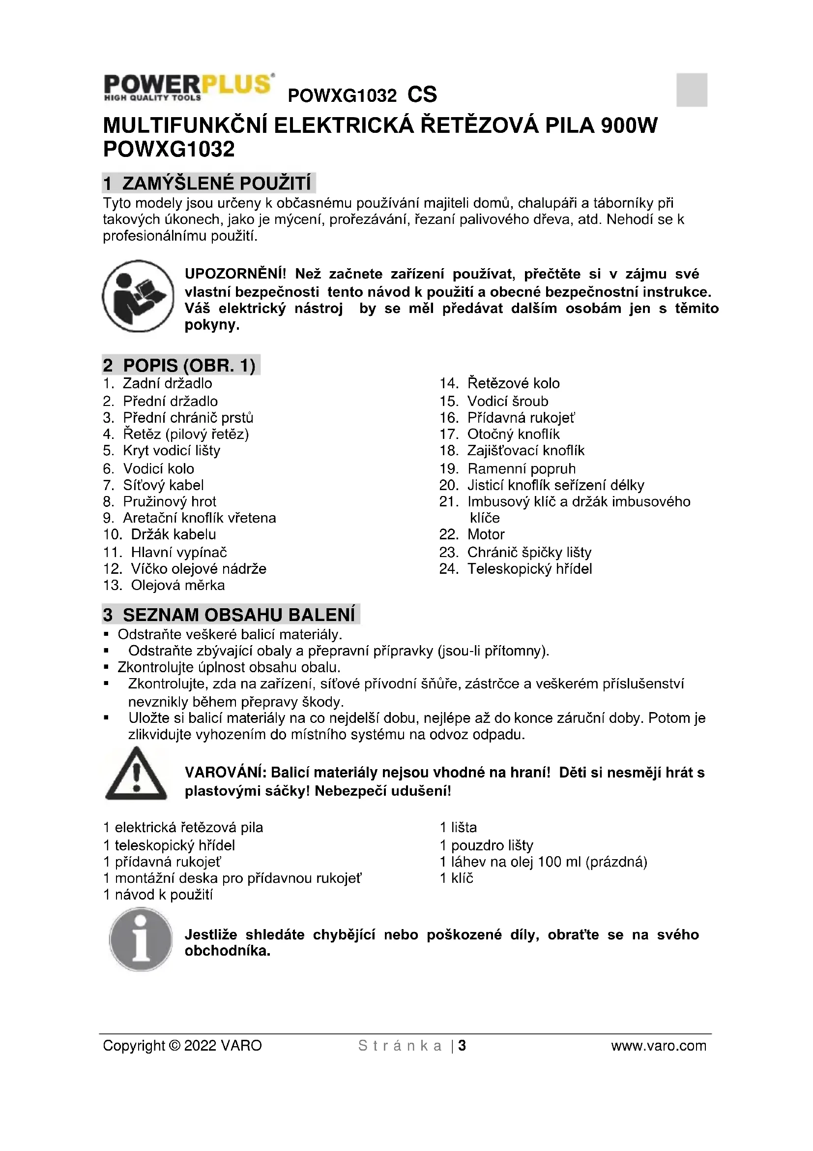 - Řetězovou pilu nesmějí provozovat děti a mladí lidé. Jedinou výjimkou z tohoto zákazu jsou mladé osoby ve věku 16 let a starší, kteří smějí používat řetězovou pilu pod dohledem jako součást výcviku. Půjčujte pilu pouze osobám, které jsou obeznámeny s tímto typem řetězové pily a vědí, jak s ní zacházet. Společně s motorovou pilou vždy předávejte i provozní pokyny.POWXG1032 CS Copyright © 2022 VARO S t r á n k a | 7 www.varo.com