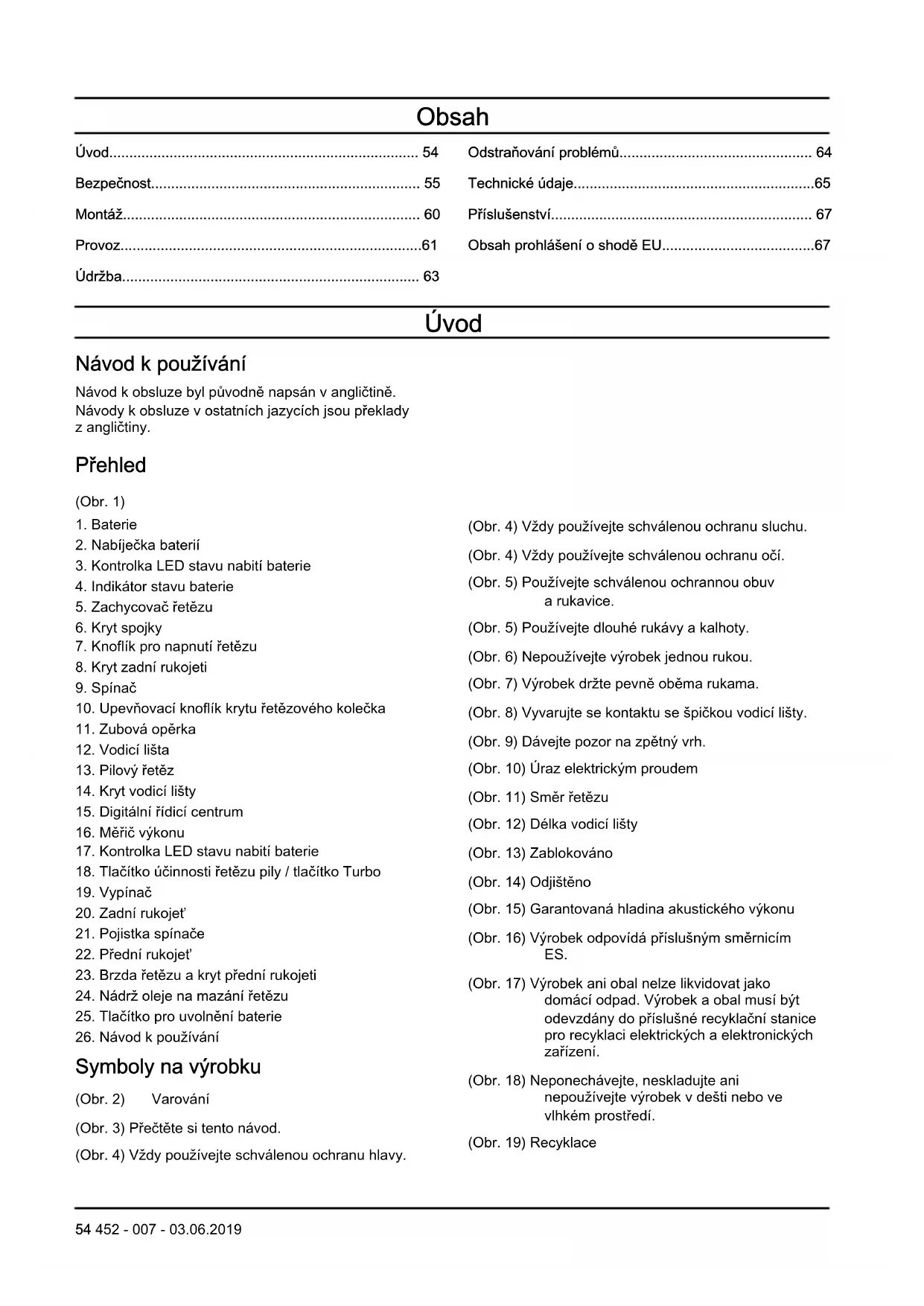 Symboly na výrobku (Obr. 2) Varování (Obr. 3) Přečtěte si tento návod. (Obr. 4) Vždy používejte schválenou ochranu hlavy. (Obr. 4) Vždy používejte schválenou ochranu sluchu. (Obr. 4) Vždy používejte schválenou ochranu očí. (Obr. 5) Používejte schválenou ochrannou obuv a rukavice. (Obr. 5) Používejte dlouhé rukávy a kalhoty. (Obr. 6) Nepoužívejte výrobek jednou rukou. (Obr. 7) Výrobek držte pevně oběma rukama. (Obr. 8) Vyvarujte se kontaktu se špičkou vodicí lišty. (Obr. 9) Dávejte pozor na zpětný vrh. (Obr. 10) Úraz elektrickým proudem (Obr. 11) Směr řetězu (Obr. 12) Délka vodicí lišty (Obr. 13) Zablokováno (Obr. 14) Odjištěno (Obr. 15) Garantovaná hladina akustického výkonu (Obr. 16) Výrobek odpovídá příslušným směrnicím ES. (Obr. 17) Výrobek ani obal nelze likvidovat jako domácí odpad. Výrobek a obal musí být odevzdány do příslušné recyklační stanice pro recyklaci elektrických a elektronických zařízení. (Obr. 18) Neponechávejte, neskladujte ani nepoužívejte výrobek v dešti nebo ve vlhkém prostředí. (Obr. 19) Recyklace 54 452 - 007 - 03.06.2019Povšimněte si: Další symboly/štítky na produktu se týkají certifikačních požadavků pro další komerční oblasti. Odpovědnost za výrobek Jak uvádí zákon o odpovědnosti za výrobek, neneseme odpovědnost za žádnou škodu způsobenou našim výrobkem, pokud: