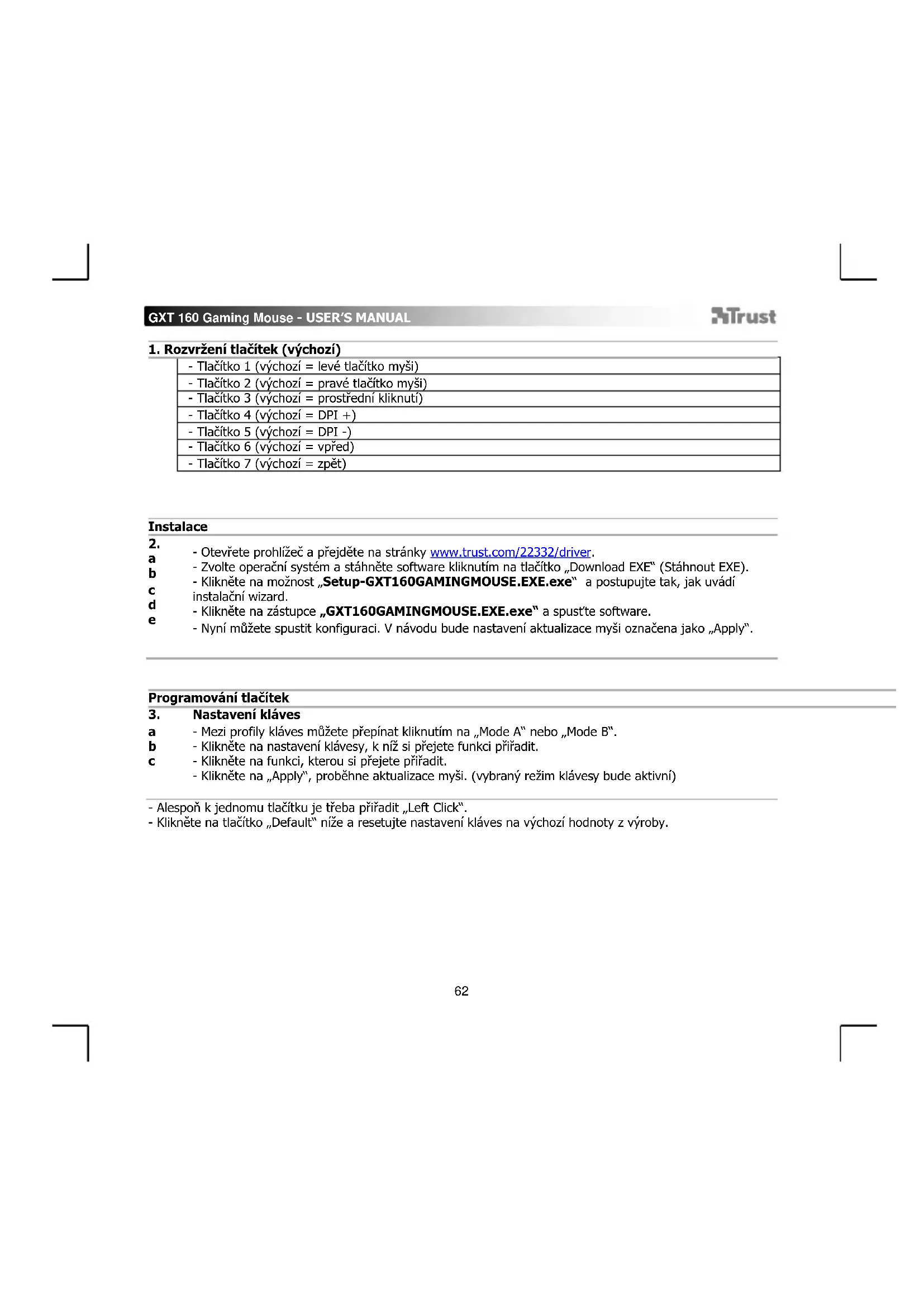 - Otevřete prohlížeč a přejděte na stránky www.trust.com/22332/driver. - Zvolte operační systém a stáhněte software kliknutím na tlačítko „Download EXE“ (Stáhnout EXE). - Klikněte na možnost „Setup-GXT160GAMINGMOUSE.EXE.exe“ a postupujte tak, jak uvádí instalační wizard. - Klikněte na zástupce „GXT160GAMINGMOUSE.EXE.exe“ a spusťte software. - Nyní můžete spustit konfiguraci. V návodu bude nastavení aktualizace myši označena jako „Apply“.