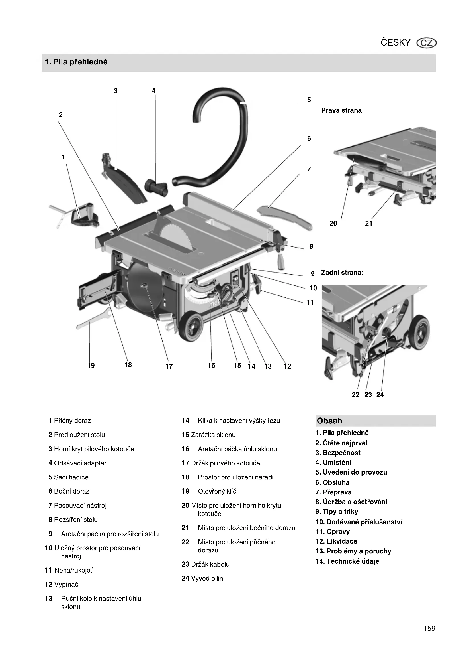 1 Příčný doraz 2 Prodloužení stolu 3 Horní kryt pilového kotouče 4 Odsávací adaptér 5 Sací hadice 6 Boční doraz 7 Posouvací nástroj 8 Rozšíření stolu 9 Aretační páčka pro rozšíření stolu 10 Úložný prostor pro posouvací nástroj 11 Noha/rukojeť 12 Vypínač 13 Ruční kolo k nastavení úhlu sklonu 14 Klika k nastavení výšky řezu 15 Zarážka sklonu 16 Aretační páčka úhlu sklonu 17 Držák pilového kotouče 18 Prostor pro uložení nářadí 19 Otevřený klíč 20 Místo pro uložení horního krytu kotouče 21 Místo pro uložení bočního dorazu 22 Místo pro uložení příčného dorazu 23 Držák kabelu 24 Vývod pilin Obsah 17028992_10_TS254_CS.fm Originální návod k použití ČESKYČESKY