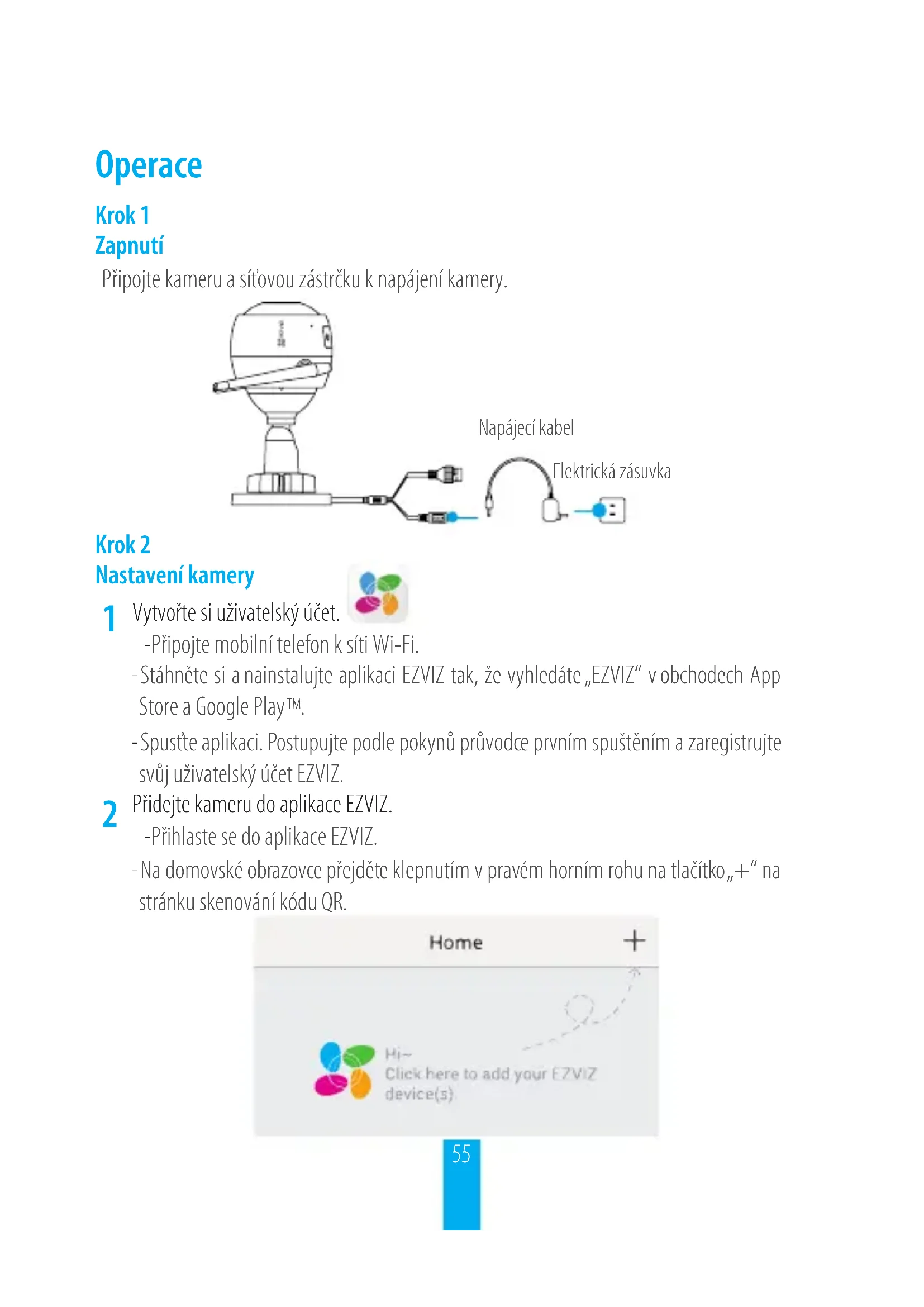Přidejte kameru do aplikace EZVIZ. -Přihlaste se do aplikace EZVIZ. -Na domovské obrazovce přejděte klepnutím v pravém horním rohu na tlačítko „+“ na stránku skenování kódu QR.56 -Naskenujte kód QR na těle kamery.