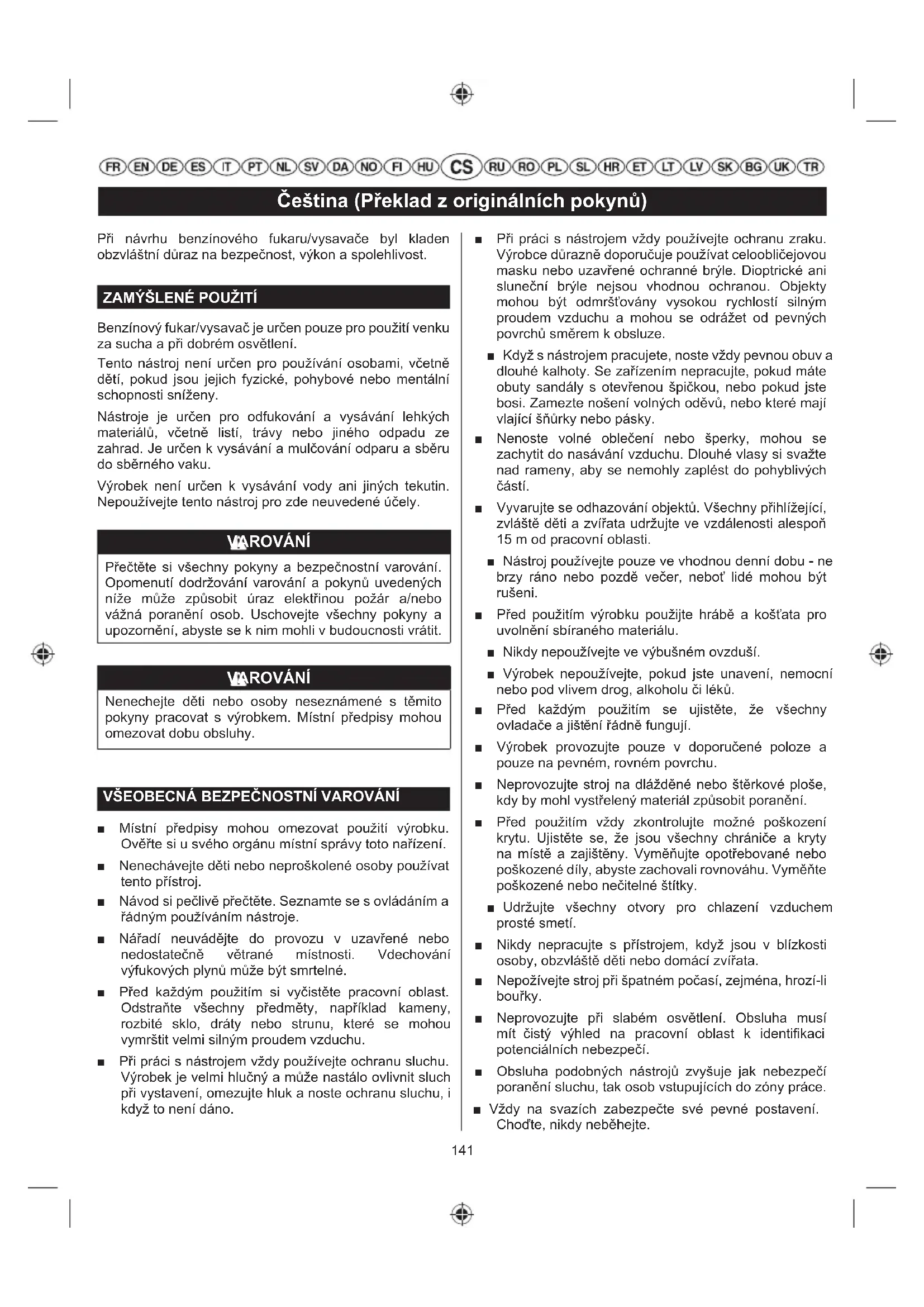 ■ Místní předpisy mohou omezovat použití výrobku. Ověřte si u svého orgánu místní správy toto nařízení. ■ Nenechávejte děti nebo neproškolené osoby používat tento přístroj. ■ Návod si pečlivě přečtěte. Seznamte se s ovládáním a řádným používáním nástroje. ■ Nářadí neuvádějte do provozu v uzavřené nebo nedostatečně větrané místnosti. Vdechování výfukových plynů může být smrtelné. ■ Před každým použitím si vyčistěte pracovní oblast. Odstraňte všechny předměty, například kameny, rozbité sklo, dráty nebo strunu, které se mohou vymrštit velmi silným proudem vzduchu. ■ Při práci s nástrojem vždy používejte ochranu sluchu. Výrobek je velmi hlučný a může nastálo ovlivnit sluch při vystavení, omezujte hluk a noste ochranu sluchu, i když to není dáno. ■ Při práci s nástrojem vždy používejte ochranu zraku. Výrobce důrazně doporučuje používat celoobličejovou masku nebo uzavřené ochranné brýle. Dioptrické ani sluneční brýle nejsou vhodnou ochranou. Objekty mohou být odmršťovány vysokou rychlostí silným proudem vzduchu a mohou se odrážet od pevných povrchů směrem k obsluze. ■ Když s nástrojem pracujete, noste vždy pevnou obuv a dlouhé kalhoty. Se zařízením nepracujte, pokud máte obuty sandály s otevřenou špičkou, nebo pokud jste bosi. Zamezte nošení volných oděvů, nebo které mají vlající šňůrky nebo pásky. ■ Nenoste volné oblečení nebo šperky, mohou se zachytit do nasávání vzduchu. Dlouhé vlasy si svažte nad rameny, aby se nemohly zaplést do pohyblivých částí. ■ Vyvarujte se odhazování objektů. Všechny přihlížející, zvláště děti a zvířata udržujte ve vzdálenosti alespoň 15 m od pracovní oblasti. ■ Nástroj používejte pouze ve vhodnou denní dobu - ne brzy ráno nebo pozdě večer, neboť lidé mohou být rušeni. ■ Před použitím výrobku použijte hrábě a košťata pro uvolnění sbíraného materiálu. ■ Nikdy nepoužívejte ve výbušném ovzduší. ■ Výrobek nepoužívejte, pokud jste unavení, nemocní nebo pod vlivem drog, alkoholu či léků. ■ Před každým použitím se ujistěte, že všechny ovladače a jišt ění řádně fungují. ■ Výrobek provozujte pouze v doporučené poloze a pouze na pevném, rovném povrchu. ■ Neprovozujte stroj na dlážděné nebo štěrkové ploše, kdy by mohl vystřelený materiál způsobit poranění. ■ Před použitím vždy zkontrolujte možné poškození krytu. Ujistěte se, že jsou všechny chrániče a kryty na místě a zajištěny. Vyměňujte opotřebované nebo poškozené díly, abyste zachovali rovnováhu. Vyměňte poškozené nebo nečitelné štítky. ■ Udržujte všechny otvory pro chlazení vzduchem prosté smetí. ■ Nikdy nepracujte s přístrojem, když jsou v blízkosti osoby, obzvláště děti nebo domácí zvířata. ■ Nepožívejte stroj při špatném počasí, zejména, hrozí-li bouřky. ■ Neprovozujte při slabém osvětlení. Obsluha musí mít čistý výhled na pracovní oblast k identifikaci potenciálních nebezpečí. ■ Obsluha podobných nástrojů zvyšuje jak nebezpečí poranění sluchu, tak osob vstupujících do zóny práce. ■ Vždy na svazích zabezpečte své pevné postavení. Choďte, nikdy neběhejte.142 Čeština (Překlad z originálních pokynů) ■ Udržujte řádné postavení a rovnováhu po celou dobu práce. Nepřeceňujte se. Přeceňování může způsobit ztrátu rovnováhy. ■ Nenechávejte ruce nebo jakékoliv části těla nebo oděvu uvnitř vstupní komory, výsypného žlabu nebo v blízkosti pohyblivých částí. ■ Nikdy neprovozujte nástroj s poškozenými chrániči nebo štíty nebo bez bezpečnostních zařízení, například lapačem úlomků. ■ Nástroj nijak neupravujte nebo nepoužívejte příslušenství, jež nejsou doporučena výrobcem. VAROVÁNÍ Před použitím výrobku v režimu vysávání je nutné spojit horní a dolní vysávací trubice. To je nutné udělat pouze jednou. Nikdy nepoužívejte vysavač pouze s horní trubicí vysavače. Riziko zranění se významně zvyšuje, pokud nedodržíte toto varování. VAROVÁNÍ Pokud začne po pádu, silných nárazech nástroj nenormálně vibrovat, zastavte nástroj a ihned zjistěte příčinu vibrací a rozsah škod. Pokud je nějaká část poškozena, musí se nechat řádně opravit nebo vyměnit pověřeným servisním střediskem. ■ Nedotýkejte se oblasti kolem tlumiče nebo válce produktu, protože tyto součásti se při provozu zahřívají. ■ Před doplněním paliva motor zastavte a nechte výrobek vychladnout. ■ Pro doplňování a míchání paliva vyberte dobře větraný prostor mimo zdroje vznícení, jako jsou jiskry nebo plameny a hořlavý materiál. ■ Při míchání paliva a plnění palivové nádrže nekuřte. ■ Benzín míchejte a skladujte v nádobě určené ke skladování benzínu. Mějte nablízku hasicí přístroj pro hašení požárů paliv. ■ Před spuštěním motoru nezapomeňte pevně utáhnout víko palivové nádrže.