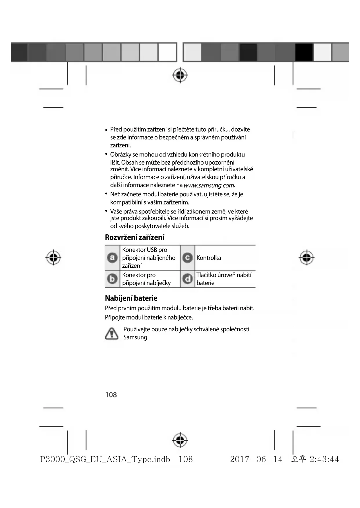 kabel USB od obou zařízení. V závislosti na univerzálním konektoru mobilního zařízení může být nutné použít konektor mikro USB. Bezpečnostní informace Před použitím zařízení si přečtěte všechny bezpečnostní informace, abyste zajistili jeho bezpečné a správné používání. Kompletní bezpečnostní informace naleznete na webových stránkách společnosti Samsung. Používejte baterie, nabíječky, příslušenství a potřeby schválené výrobcem. Nedotýkejte se zařízení mokrýma rukama. Neupouštějte nabíječku ani zařízení a nevystavujte je nárazům. Zařízení používejte na místech sokolní teplotou v rozsahu od 0 °C do 35 °C. Zařízení můžete skladovat na místech sokolní teplotou od -20 °C do 50 °C. Používání nebo skladování zařízení mimo doporučený rozsah teplot může vést k poškození zařízení nebo ke snížení životnosti baterie. P3000_QSG_EU_ASIA_Type.indb 110P3000_QSG_EU_ASIA_Type.indb 110 2017-06-14 오후 2:43:442017-06-14 오후 2:43:44111 Čeština Zabraňte kontaktu univerzálního konektoru a malé koncovky nabíječky s vodivými materiály, například kapalinami, prachem, kovovými prášky a tuhami. Nedovolte malým dětem nebo zvířatům zařízení žvýkat nebo cucat. Zařízení nerozebírejte, neupravujte anepokoušejte se ho opravit. Správná likvidace Toto označení na produktu, příslušenství nebo vdokumentaci značí, že produkt a elektronická příslušenství (např. nabíječka, sluchátka, kabel USB) by neměly být likvidovány sběžným domácím odpadem. Tato značka na baterii, návodu nebo obalu znamená, že baterie v tomto výrobku nesmí být na konci své životnosti likvidována společně s jiným domovním odpadem. Informace o závazcích společnosti Samsung voblasti ochrany životního prostředí a povinnostech plynoucích zpředpisů pro konkrétní výrobky, např. REACH, WEEE, směrnice pro baterie, naleznete na stránkách samsung.com/uk/aboutsamsung/samsungelectronics/ corporatecitizenship/data_corner.html P3000_QSG_EU_ASIA_Type.indb 111P3000_QSG_EU_ASIA_Type.indb 111 2017-06-14 오후 2:43:442017-06-14 오후 2:43:44112