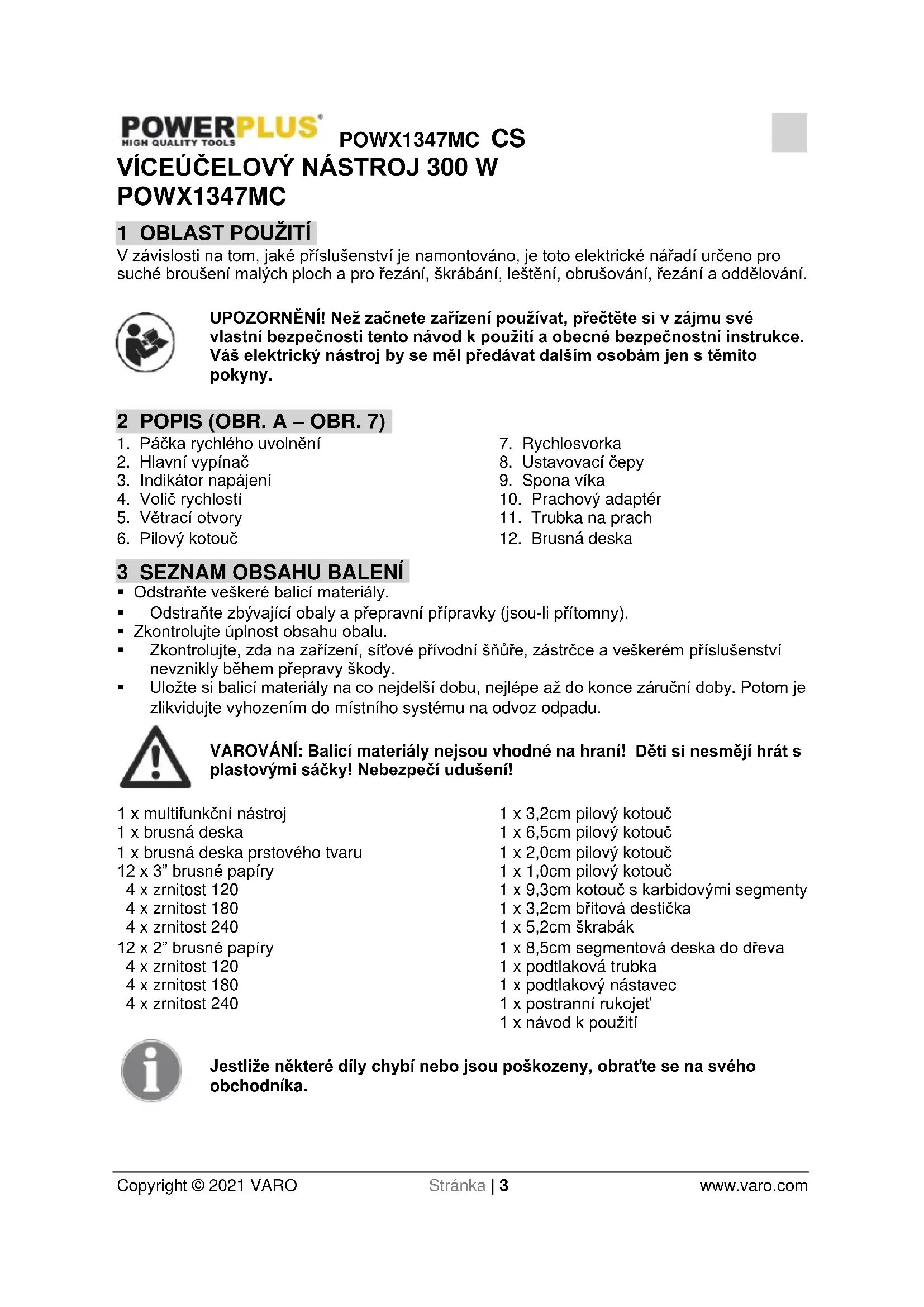 Odstraňte veškeré balicí materiály. Odstraňte zbývající obaly a přepravní přípravky (jsou-li přítomny). Zkontrolujte úplnost obsahu obalu. Zkontrolujte, zda na zařízení, síťové přívodní šňůře, zástrčce a veškerém příslušenství nevznikly během přepravy škody. Uložte si balicí materiály na co nejdelší dobu, nejlépe až do konce záruční doby. Potom je zlikvidujte vyhozením do místního systému na odvoz odpadu. VAROVÁNÍ: Balicí materiály nejsou vhodné na hraní! Děti si nesmějí hrát s plastovými sáčky! Nebezpečí udušení! 1 x multifunkční nástroj 1 x brusná deska 1 x brusná deska prstového tvaru 12 x 3” brusné papíry 4 x zrnitost 120 4 x zrnitost 180 4 x zrnitost 240 12 x 2” brusné papíry 4 x zrnitost 120 4 x zrnitost 180 4 x zrnitost 240 1 x 3,2cm pilový kotouč 1 x 6,5cm pilový kotouč 1 x 2,0cm pilový kotouč 1 x 1,0cm pilový kotouč 1 x 9,3cm kotouč s karbidovými segmenty 1 x 3,2cm břitová destička 1 x 5,2cm škrabák 1 x 8,5cm segmentová deska do dřeva 1 x podtlaková trubka 1 x podtlakový nástavec 1 x postranní rukojeť 1 x návod k použití Jestliže některé díly chybí nebo jsou poškozeny, obraťte se na svého obchodníka.POWX1347MC CS Copyright © 2021 VARO Stránka | 4 www.varo.com 4 SYMBOLY V tomto návodu a u přístroje jsou používány následující symboly: