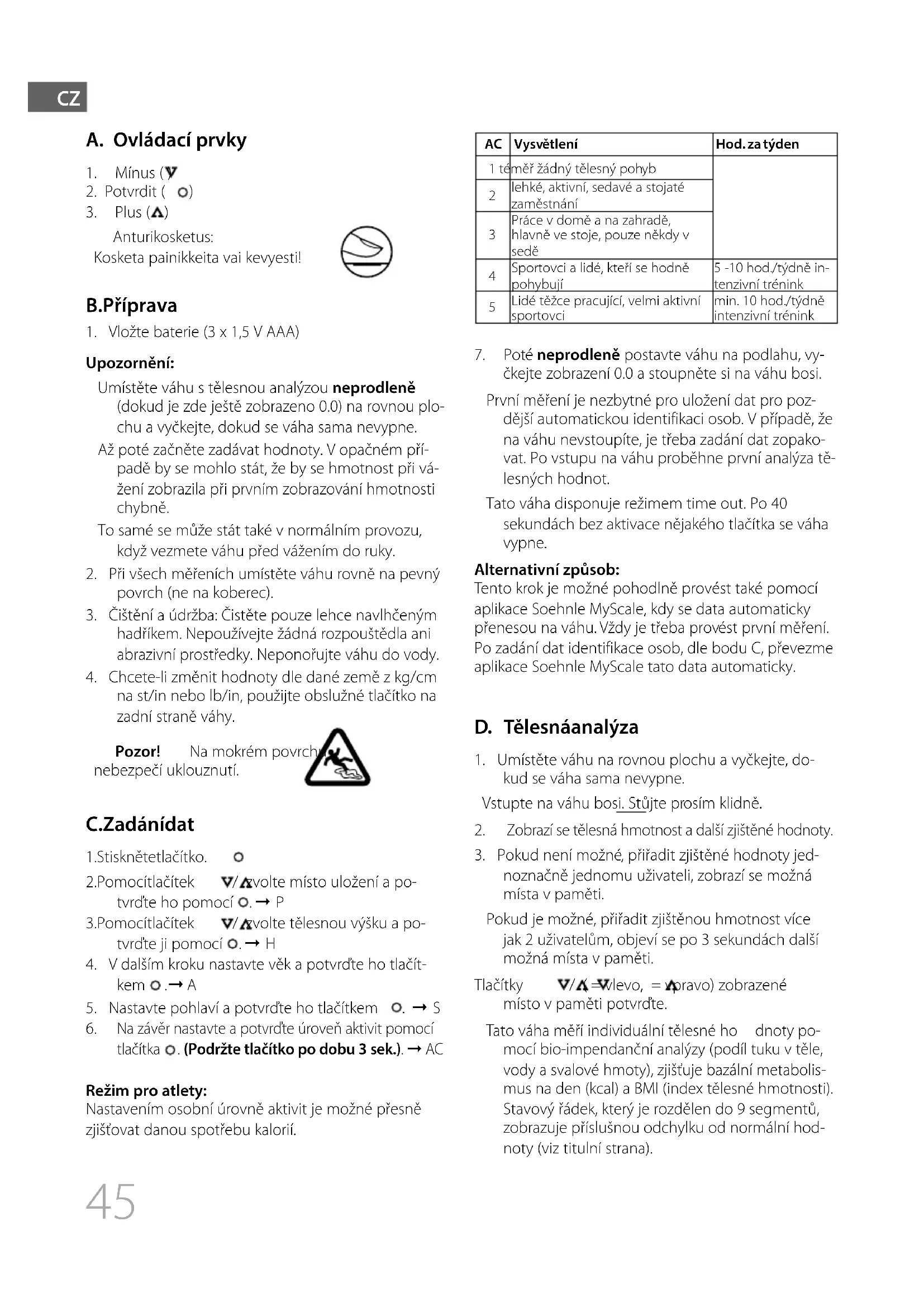 na st/in nebo lb/in, použijte obslužné tlačítko na zadní straně váhy. Pozor! Na mokrém povrchu nebezpečí uklouznutí. C. Zadání dat