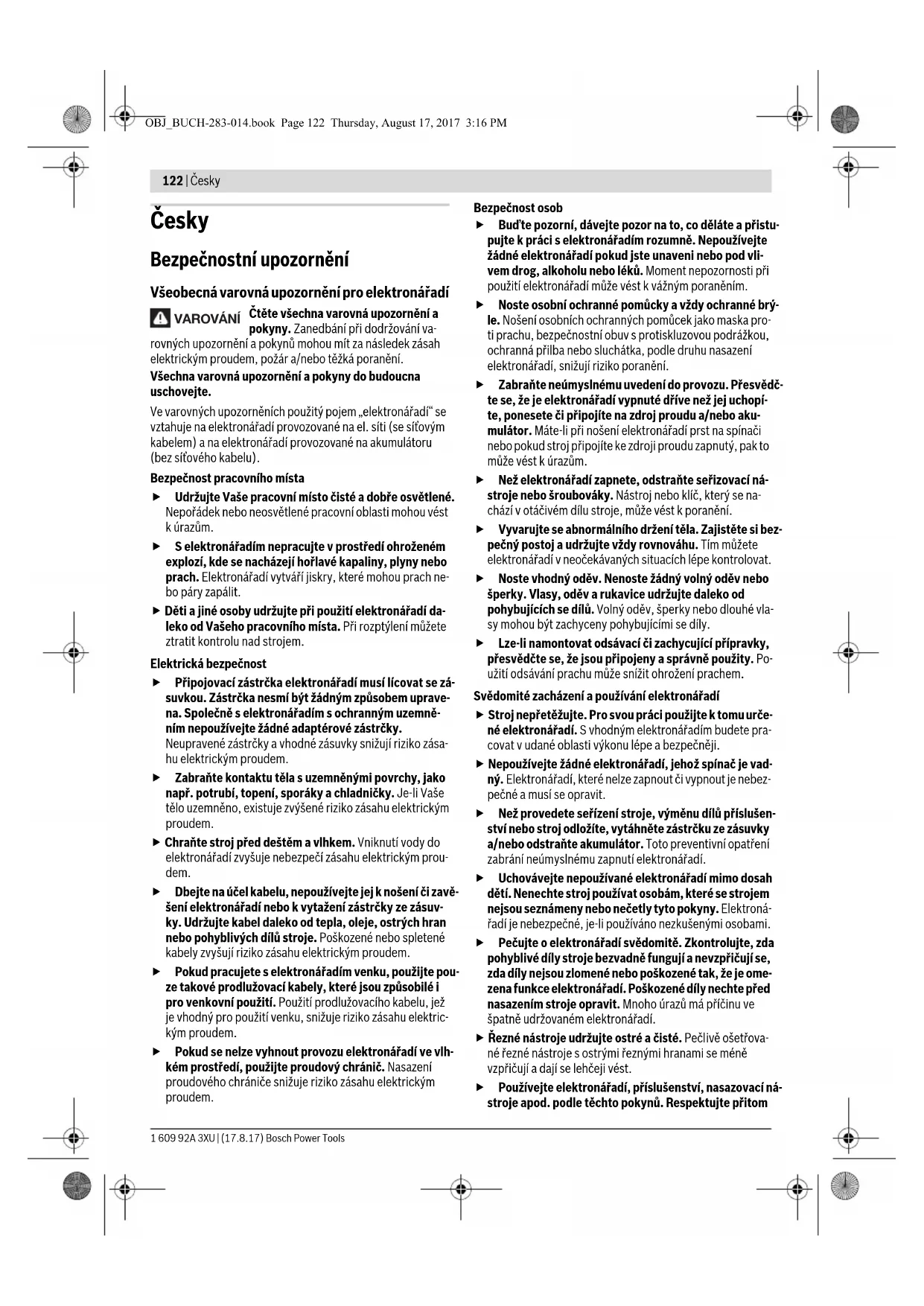 Akumulátory nabíjejte pouze v nabíječce, která je do- poručena výrobcem. Pro nabíječku, která je vhodná pro určitý druh akumulátorů, existuje nebezpečí požáru, je-li používána s jinými akumulátory. Do elektronářadí používejte pouze k tomu určené aku- mulátory. Použití jiných akumulátorů může vést k poraně- ním a požárům. Nepoužívaný akumulátor uchovávejte mimo kancelář- ské sponky, mince, klíče, hřebíky, šrouby nebo jiné drobné kovové předměty, které mohou způsobit pře- mostění kontaktů. Zkrat mezi kontakty akumulátoru může mít za následek opáleniny nebo požár. Při špatném použití může z akumulátoru vytéci kapali- na. Zabraňte kontaktu s ní. Při náhodném kontaktu opláchněte místo vodou. Pokud kapalina vnikne do očí, navštivte navíc i lékaře. Vytékající akumulátorová kapali- na může způsobit podráždění pokožky nebo popáleniny. Servis Nechte Vaše elektronářadí opravit pouze kvalifikova- ným odborným personálem a pouze s originálními ná- hradními díly. Tím bude zajištěno, že bezpečnost stroje zůstane zachována. Bezpečnostní upozornění pro kladiva Noste ochranu sluchu. Působení hluku může způsobit ztrátu sluchu. Používejte přídavné rukojeti, pokud jsou součástí do- dávky elektronářadí. Ztráta kontroly může vést ke zraně- ním. Pokud provádíte práce, při kterých může nasazovací nástroj zasáhnout skrytá elektrická vedení, pak držte elektronářadí na izolovaných plochách rukojeti. Kon- takt s vedením pod napětím může přivést napětí i na kovo- vé díly elektronářadí a vést k úderu elektrickým proudem. Použijte vhodná hledací zařízení k vyhledání skrytých rozvodných vedení nebo přizvěte místní dodavatel- skou společnost. Kontakt s elektrickým vedením může vést k požáru a elektrickému úderu. Poškození plynového vedení může vést k explozi. Proniknutí do vodovodního po- trubí způsobí věcné škody. Elektronářadí držte při práci pevně oběma rukama a za- jistěte si bezpečný postoj. Oběma rukama je elektronářa- dí vedeno bezpečněji. Zajistěte obrobek. Obrobek pevně uchycený upínacím přípravkem nebo svěrákem je držen bezpečněji než Vaší rukou. Než jej odložíte, počkejte až se elektronářadí zastaví. Nasazovací nástroj se může vzpříčit a vést ke ztrátě kontro- ly nad elektronářadím. Neotvírejte akumulátor. Existuje nebezpečí zkratu. Chraňte akumulátor před horkem, např. i před tr- valým slunečním zářením, ohněm, vodou a vlhkos- tí. Existuje nebezpečí výbuchu. Při poškození a nesprávném použití akumulátoru mo- hou vystupovat páry. Přivádějte čerstvý vzduch a při potížích vyhledejte lékaře. Páry mohou dráždit dýchací cesty. Používejte akumulátor pouze ve spojení s Vaším elek- tronářadím Bosch. Jen tak bude akumulátor chráněn před nebezpečným přetížením. Špičatými předměty, jako např. hřebíky nebo šroubo- váky, nebo působením vnější síly může dojít k poškození akumulátoru. Uvnitř může dojít ke zkratu a akumulátor může začít hořet, může z něj unikat kouř, mů- že vybouchnout nebo se přehřát. Popis výrobku a specifikací Čtěte všechna varovná upozornění a poky- ny. Zanedbání při dodržování varovných upo- zornění a pokynů mohou mít za následek úraz elektrickým proudem, požár a/nebo těžká po- ranění. Vyklopte prosím odklápěcí stranu se zobrazením stroje a ne- chte tuto stranu během čtení návodu k obsluze otevřenou. Určené použití Elektronářadí je určeno k příklepovému vrtání do betonu, ci- hel a kamene a též pro lehké sekací práce. Je rovněž vhodné pro vrtání bez příklepu do dřeva, kovu, keramiky a umělé hmoty. Elektronářadí s elektronickou regulací a chodem vpra- vo/vlevo je vhodné i k šroubování. Zobrazené komponenty Číslování zobrazených komponent se vztahuje na zobrazení elektronářadí na grafické straně. 1 Rychloupínací výměnné sklíčidlo (GBH 36 VF-LI Plus) 2 Výměnné sklíčidlo SDS-plus (GBH 36 VF-LI Plus) 3 Nástrojový držák SDS-plus 4 Ochranná protiprachová krytka 5 Uzamykací pouzdro 6 Uzamykací kroužek výměnného sklíčidla (GBH 36 VF-LI Plus) 7 Tlumení vibrací 8 Přepínač směru otáčení 9 Rukojeť (izolovaná plocha rukojeti) 10 Spínač 11 Akumulátor* 12 Odjišťovací tlačítko přepínače údery/zastavené otáčky 13 Přepínač údery/zastavené otáčky 14 Pracovní osvětlení 15 Tlačítko pro nastavení hloubkového dorazu 16 Přídavná rukojeť (izolovaná plocha rukojeti) 17 Hloubkový doraz 18 Odjišťovací tlačítko akumulátoru OBJ_BUCH-283-014.book Page 123 Thursday, August 17, 2017 3:16 PM124 | Česky 1 609 92A 3XU | (17.8.17) Bosch Power Tools 19 Ukazatel kontroly teploty 20 Ukazatel stavu nabití akumulátoru 21 Tlačítko ukazatele stavu nabití 22 Pojistný šroub pro ozubené sklíčidlo (GBH 36 VF-LI Plus)* 23 Ozubené sklíčidlo (GBH 36 VF-LI Plus)* 24 Upínací stopka SDS-plus pro sklíčidlo (GBH 36 VF-LI Plus)* 25 Upnutí sklíčidla(GBH 36 VF-LI Plus) 26 Identifikační drážky 27 Klička sklíčidla(GBH 36 VF-LI Plus) 28 Přední pouzdro rychloupínacího výměnného sklíčidla (GBH 36 VF-LI Plus) 29 Přidržovací kroužek rychloupínacího výměnného sklíči- dla (GBH 36 VF-LI Plus) 30 Spínač EPC (Electronic Precision Control) 31 Univerzální držák se stopkou SDS-plus* *Zobrazené nebo popsané příslušenství nepatří k standardnímu obsahu dodávky. Kompletní příslušenství naleznete v našem pro- gramu příslušenství. Technická data Informace o hluku a vibracích Hodnoty hlučnosti zjištěny podle EN 60745-2-6. Hodnocená hladina hluku A elektronářadí činí typicky: hladina akustického tlaku 90 dB(A); hladina akustického výkonu 101dB(A). Ne