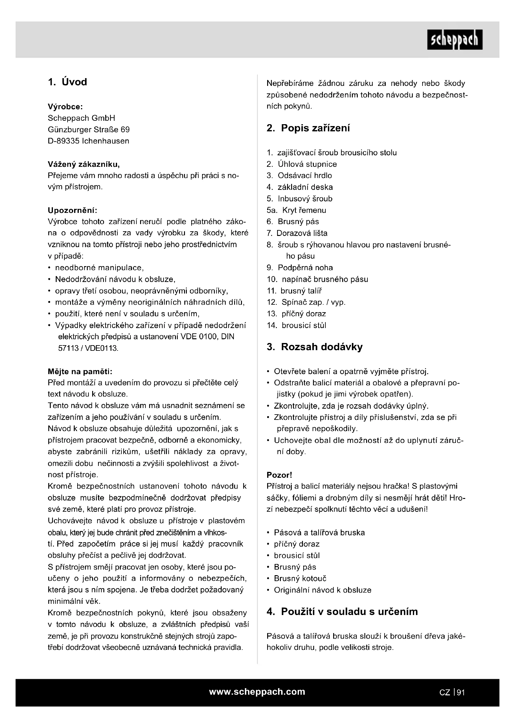 Výrobce: Scheppach GmbH Günzburger Straße 69 D-89335 Ichenhausen Vážený zákazníku, Přejeme vám mnoho radosti a úspěchu při práci s no- vým přístrojem. Upozornění: Výrobce tohoto zařízení neručí podle platného záko- na o odpovědnosti za vady výrobku za škody, které vzniknou na tomto přístroji nebo jeho prostřednictvím v případě: