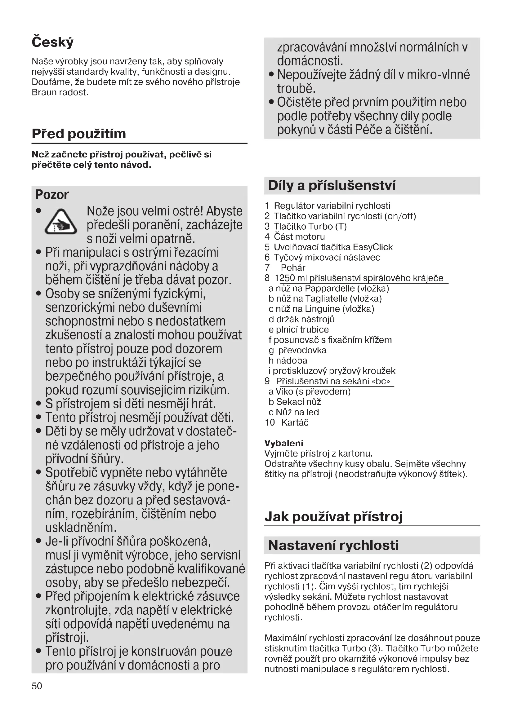 - Pokračujte v sekání dalších 1,5 sekundy. Používejte příslušenství na sekání «hc» (volitelné příslušenství je k dispozici v servisním středisku Braun; avšak ne v každé zemi). Péče a čištění (D)