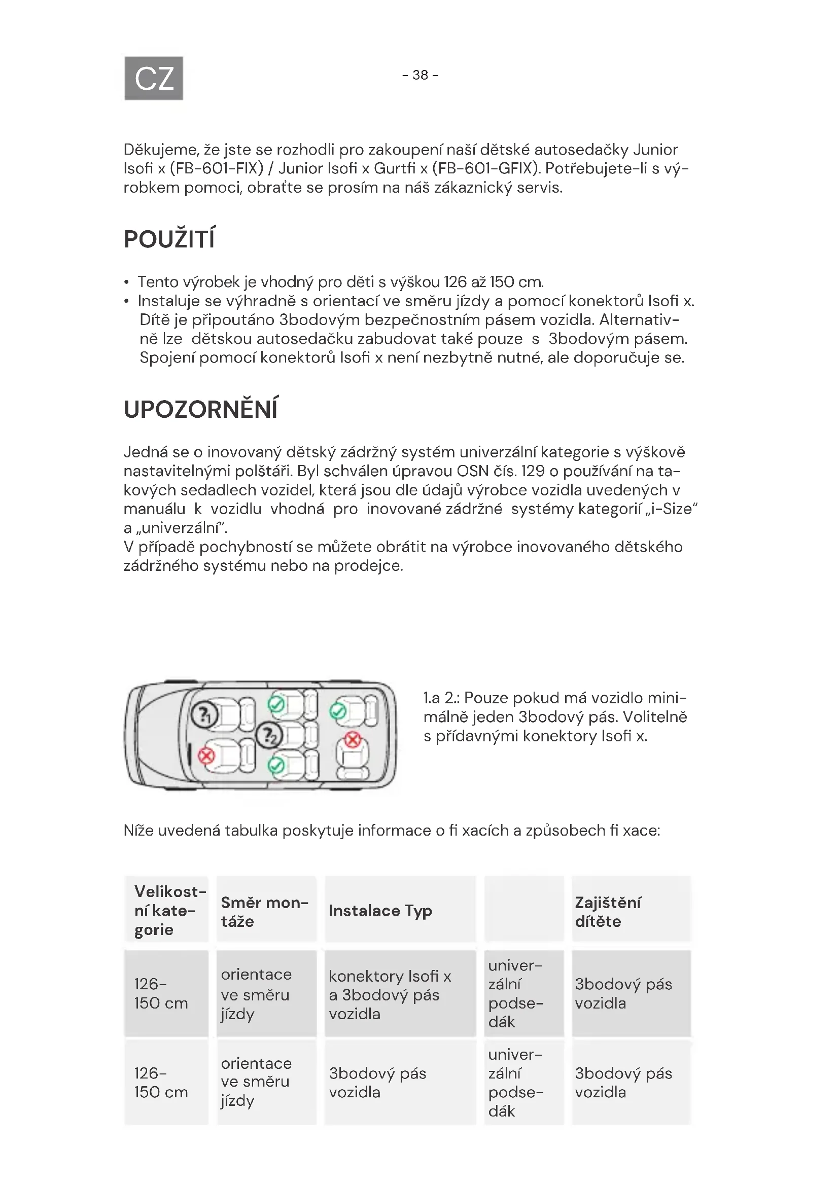 Děkujeme, že jste se rozhodli pro zakoupení naší dětské autosedačky Junior Isofi x (FB-601-FIX) / Junior Isofi x Gurtfi x (FB-601-GFIX). Potřebujete-li s vý- robkem pomoci, obraťte se prosím na náš zákaznický servis. POUŽITÍ