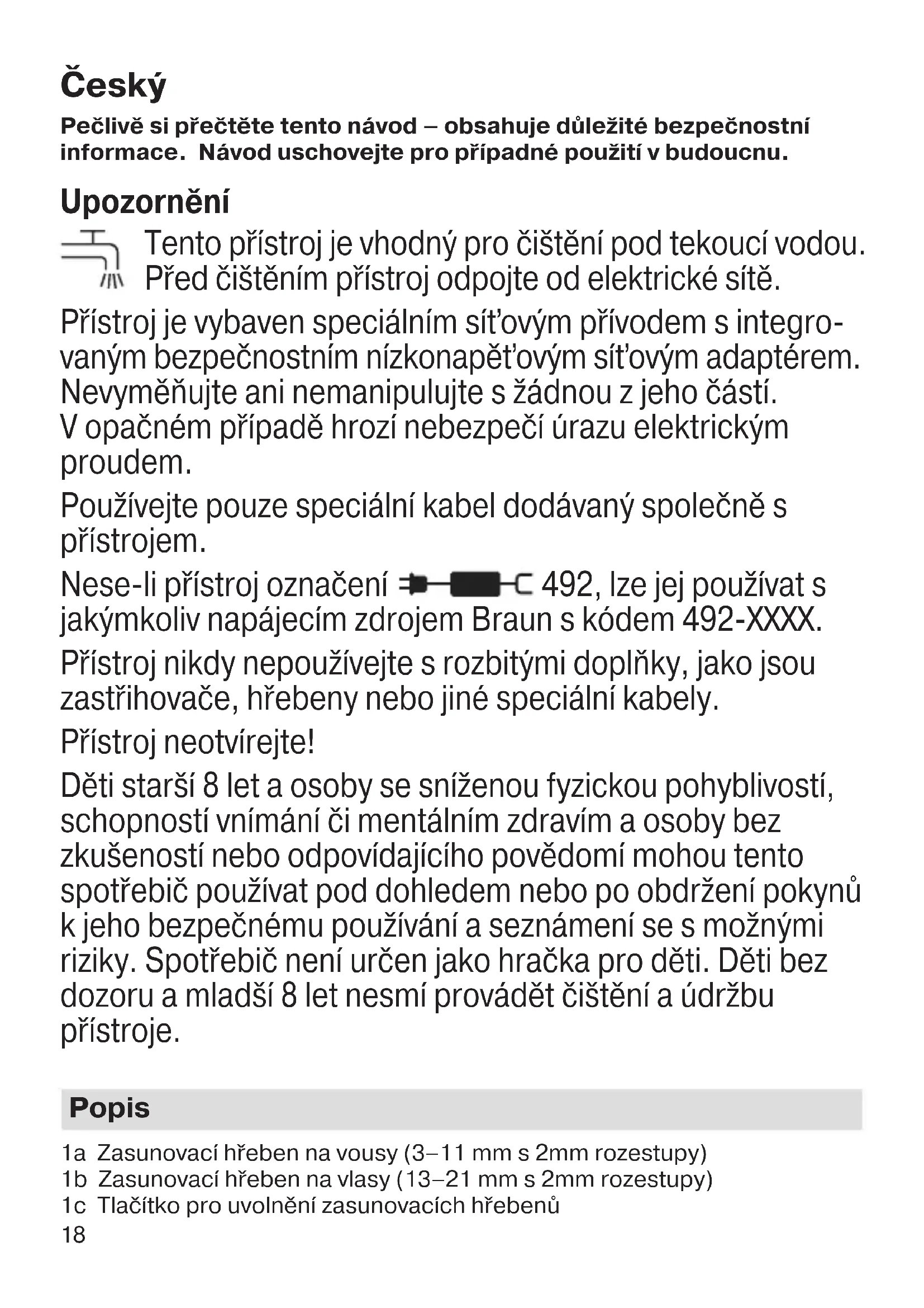nie ogranicza ani nie zawiesza uprawnień Kupującego wynikających z przepisów o rękojmi za wady rzeczy sprzedanej. 91941370_MGK5060_5045_CEEMEA.indd 1791941370_MGK5060_5045_CEEMEA.indd 17 17.08.18 09:0317.08.18 09:03 Business Use - P&G AUTHORIZED POA-00063615 Rev 001 Effective Date 2018-08-20 Printed 2019-02-27 Page 17 of 7618 Český Pečlivě si přečtěte tento návod – obsahuje důležité bezpečnostní informace. Návod uschovejte pro případné použití v budoucnu. Upozornění Tento přístroj je vhodný pro čištění pod tekoucí vodou. Před čištěním přístroj odpojte od elektrické sítě. Přístroj je vybaven speciálním síťovým přívodem s integro- vaným bezpečnostním nízkonapěťovým síťovým adaptérem. Nevyměňujte ani nemanipulujte s žádnou z jeho částí. V opačném případě hrozí nebezpečí úrazu elektrickým proudem. Používejte pouze speciální kabel dodávaný společně s přístrojem. Nese-li přístroj označení 492, lze jej používat s jakýmkoliv napájecím zdrojem Braun s kódem 492-XXXX. Přístroj nikdy nepoužívejte s rozbitými doplňky, jako jsou zastřihovače, hřebeny nebo jiné speciální kabely. Přístroj neotvírejte! Děti starší 8 let a osoby se sníženou fyzickou pohyblivostí, schopností vnímání či mentálním zdravím a osoby bez zkušeností nebo odpovídajícího povědomí mohou tento spotřebič používat pod dohledem nebo po obdržení pokynů k jeho bezpečnému používání a seznámení se s možnými riziky. Spotřebič není určen jako hračka pro děti. Děti bez dozoru a mladší 8 let nesmí provádět čištění a údržbu přístroje. Popis 1a Zasunovací hřeben na vousy (3–11 mm s 2mm rozestupy) 1b Zasunovací hřeben na vlasy (13–21 mm s 2mm rozestupy) 1c Tlačítko pro uvolnění zasunovacích hřebenů 91941370_MGK5060_5045_CEEMEA.indd 1891941370_MGK5060_5045_CEEMEA.indd 18 17.08.18 09:0317.08.18 09:03 Business Use - P&G AUTHORIZED POA-00063615 Rev 001 Effective Date 2018-08-20 Printed 2019-02-27 Page 18 of 7619 1d Pevný hřeben 1 (1 mm) 1e Pevný hřeben 2 (2 mm) 2a Hlava zastřihovače 2b Hlava zastřihovače chloupků v nose a uších* 2c Přesná hlava zastřihovače* 3 Vypínač (on/off) 4 Kontrolka nabíjení baterie 5 Napájecí zdířka 6 Speciální síťový přívod (design se může lišit)