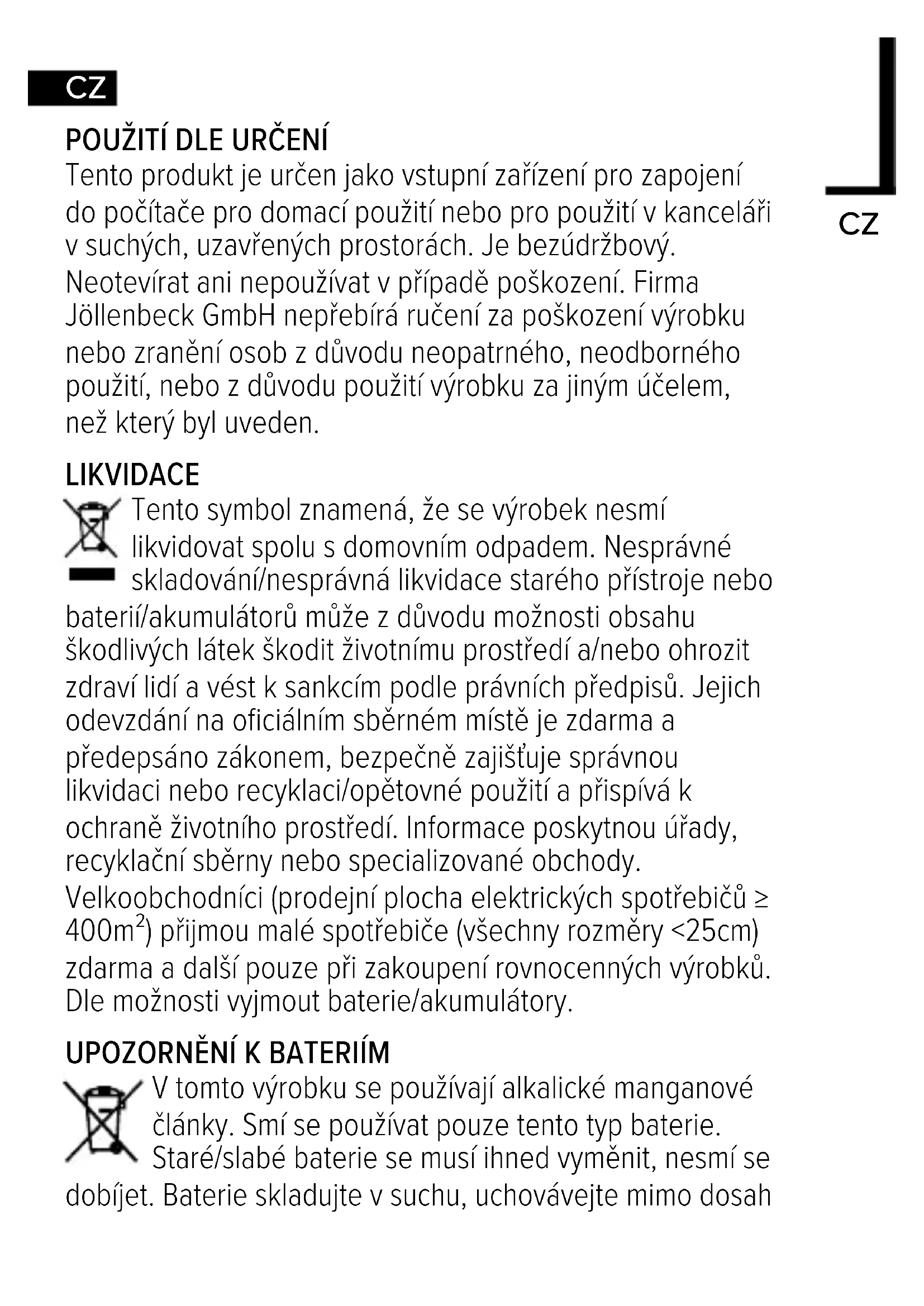 Tento produkt je určen jako vstupní zařízení pro zapojení do počítače pro domací použití nebo pro použití v kanceláři v suchých, uzavřených prostorách. Je bezúdržbový. Neotevírat ani nepoužívat v případě poškození. Firma Jöllenbeck GmbH nepřebírá ručení za poškození výrobku nebo zranění osob z důvodu neopatrného, neodborného použití, nebo z důvodu použití výrobku za jiným účelem, než který byl uveden. LIKVIDACE Tento symbol znamená, že se výrobek nesmí likvidovat spolu s domovním odpadem. Nesprávné skladování/nesprávná likvidace starého přístroje nebo baterií/akumulátorů může z důvodu možnosti obsahu škodlivých látek škodit životnímu prostředí a/nebo ohrozit zdraví lidí a vést k sankcím podle právních předpisů. Jejich odevzdání na oficiálním sběrném místě je zdarma a předepsáno zákonem, bezpečně zajišťuje správnou likvidaci nebo recyklaci/opětovné použití a přispívá k ochraně životního prostředí. Informace poskytnou úřady, recyklační sběrny nebo specializované obchody. Velkoobchodníci (prodejní plocha elektrických spotřebičů ≥ 400m²) přijmou malé spotřebiče (všechny rozměry <25cm) zdarma a další pouze při zakoupení rovnocenných výrobků. Dle možnosti vyjmout baterie/akumulátory.