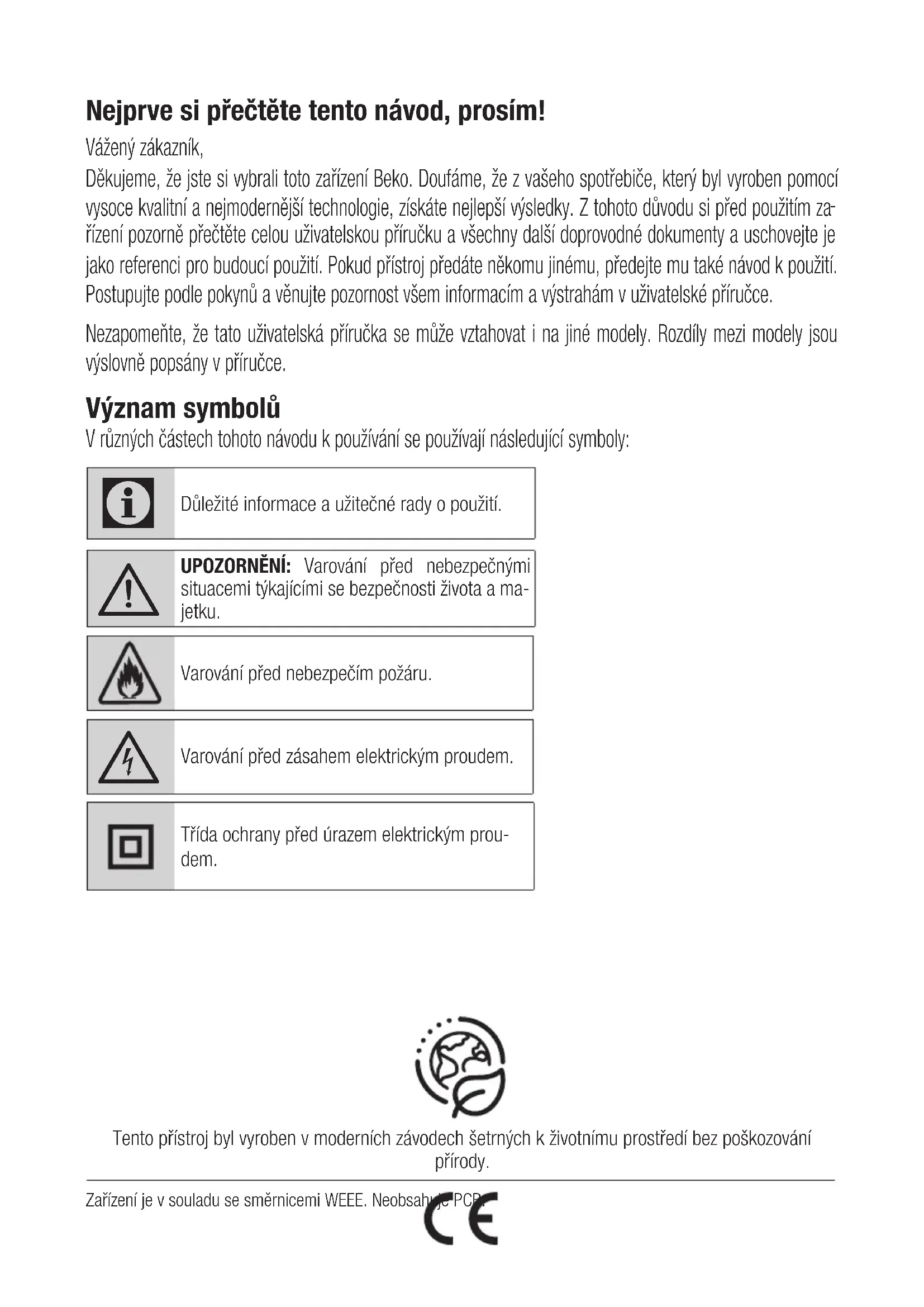 Varování před zásahem elektrickým proudem. Třída ochrany před úrazem elektrickým prou- dem. Zařízení je v souladu se směrnicemi WEEE. Neobsahuje PCB. Tento přístroj byl vyroben v moderních závodech šetrných k životnímu prostředí bez poškozování přírody.58 / CZ Digestoř / Uživatelská příručka