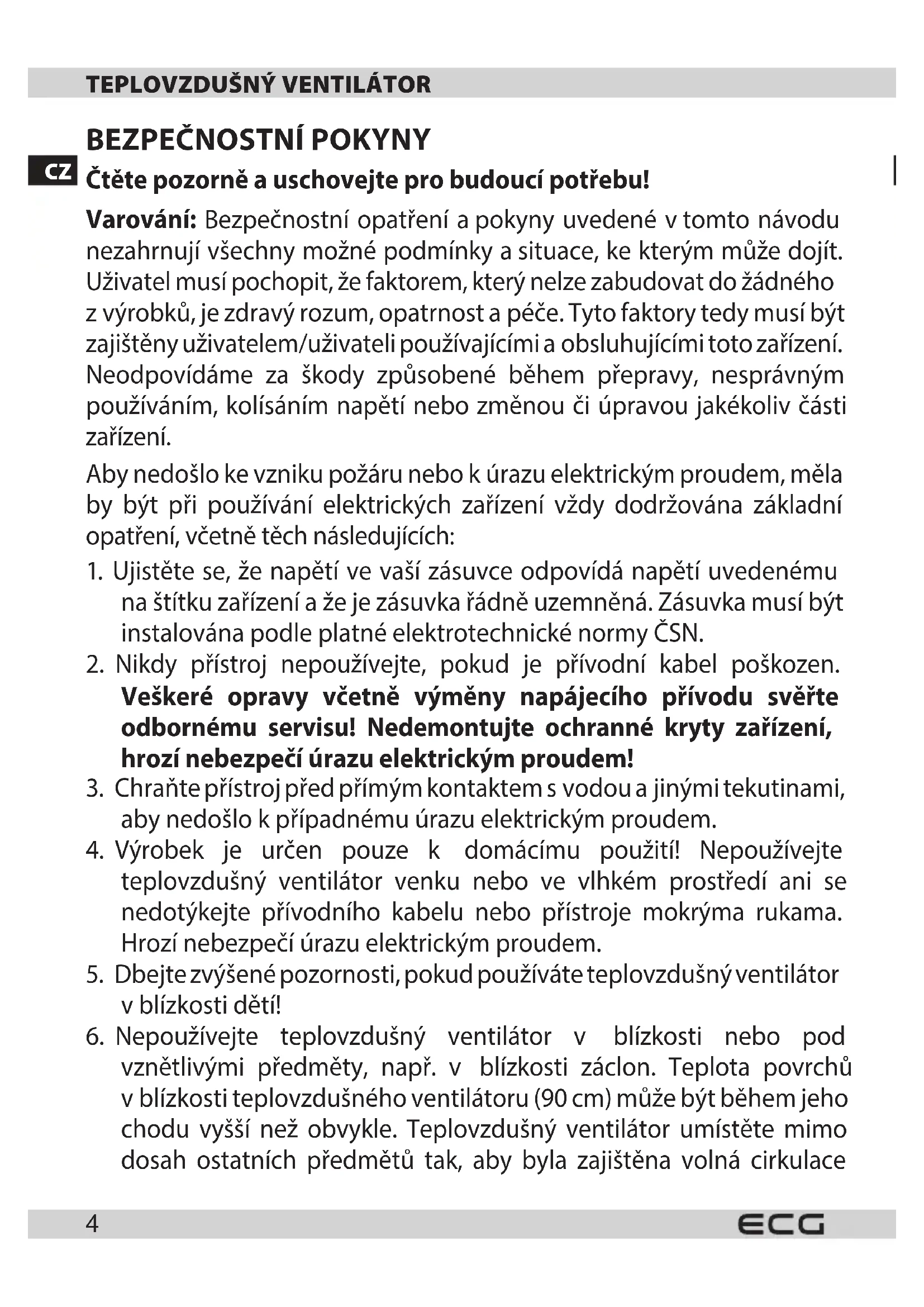 - Používejte teplovzdušné ventilátor pouze v souladu s poukyny uvedenými v tomto námodu. Vyrobce neodpovídá za škody způsobéné nasprávném použitím tohoto zařizení.