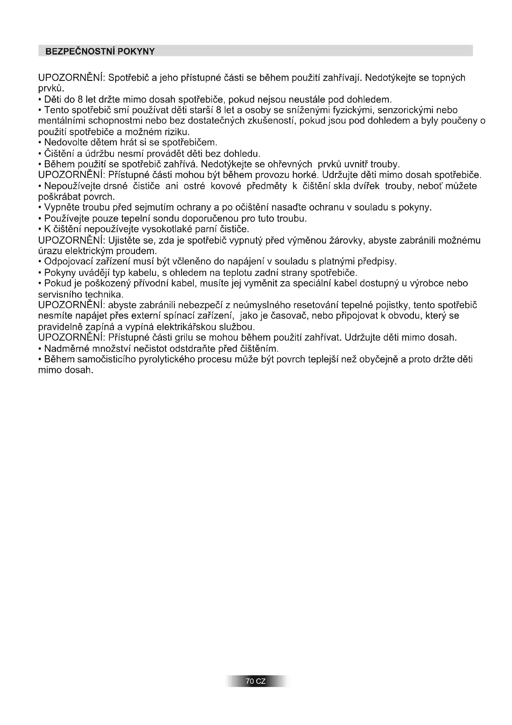 - Během použití se spotřebič zahřívá. Nedotýkejte se ohřevných prvků uvnitř trouby. UPOZORNĚNÍ: Přístupné části mohou být během provozu horké. Udržujte děti mimo dosah spotřebiče.