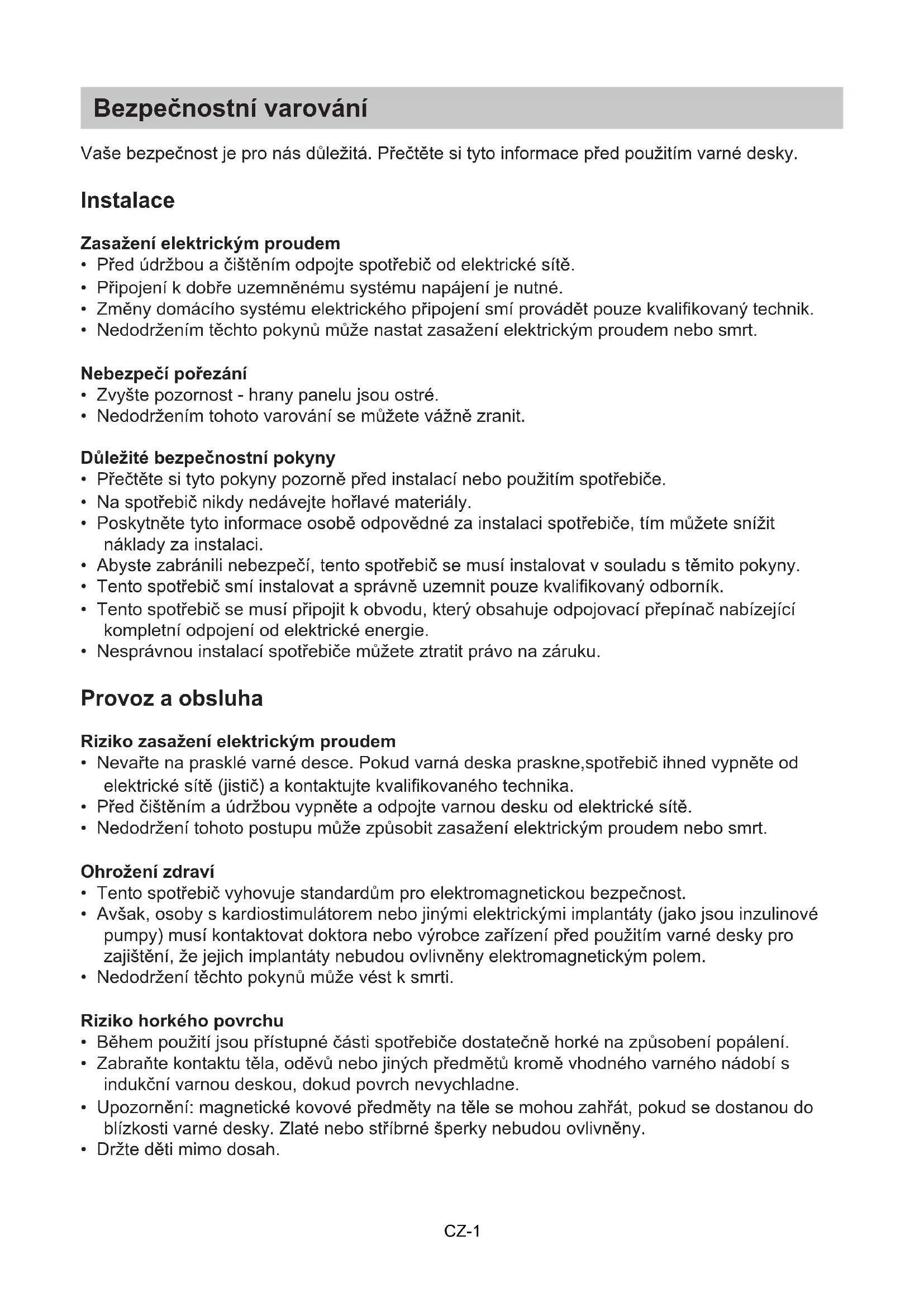 - Držte děti mimo dosah. CZ-1• Madla pánví mohou být horké na dotek. Zkontrolujte, zda madla pánví nepřekrývají jiné varné zóny, které jsou zapnuté. Držte madla mimo dosah dětí.