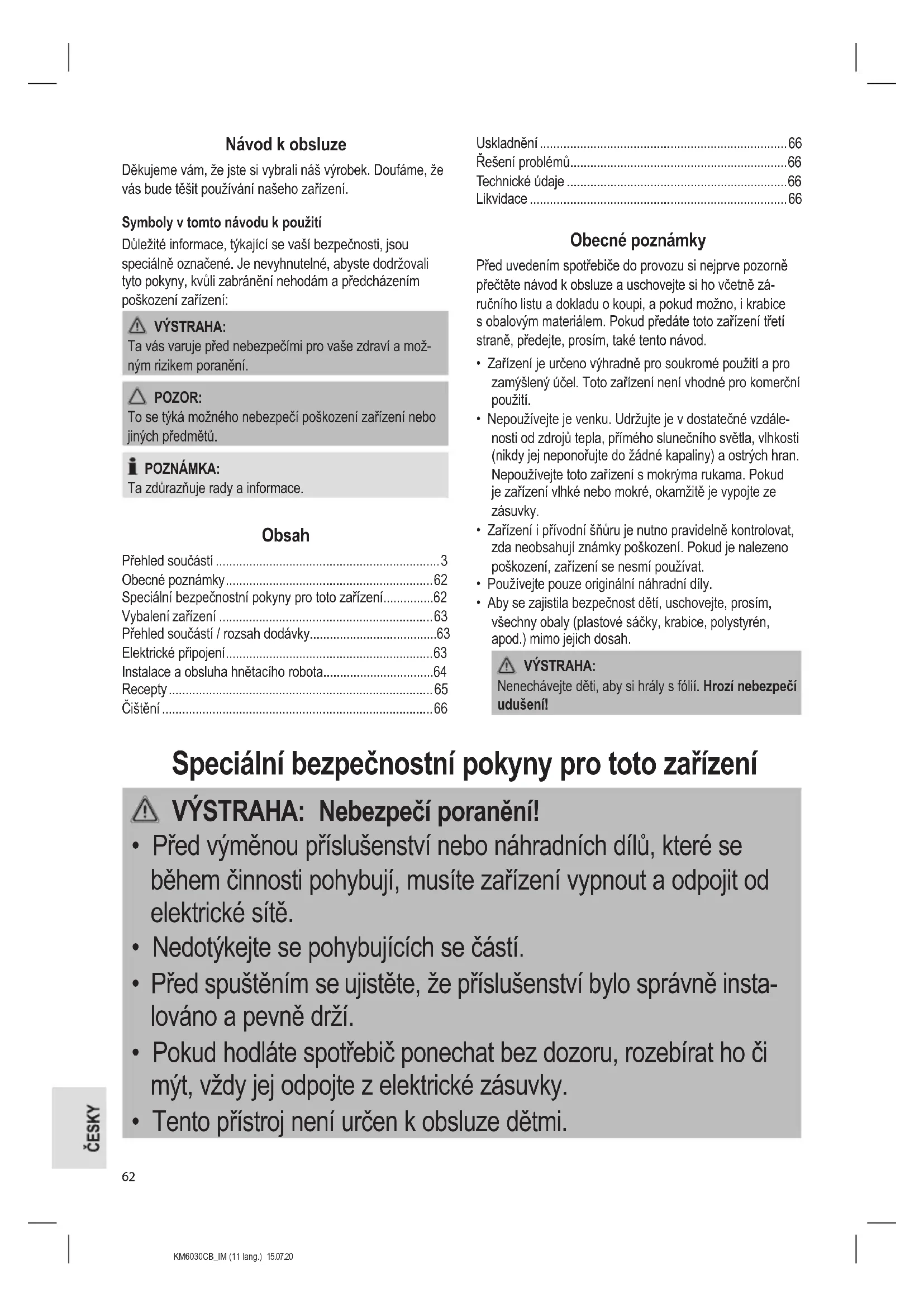 - Vždy zařízení uchovávejte mimo dosah dětí na suchém a dobře větraném místě. Řešení problémů Problém Možná příčina Opatření Přístroj nelze zapnout, nebo se vypíná. Zařízení není napájeno. Pomocí jiného zařízení vyzkoušejte zásuvku. Zasuňte správně síťovou zástrčku. Zkontrolujte pojistky. Otočné rameno nelze ve spodní pozici zacvaknout. Bezpečnostní vypí- nač brání v chodu přístroje. Současně stlačte páčku a otočné rameno, dokud nedojde k jeho zacvaknutí. Zařízení je poško- zené. Kontaktujte naše servisní centrum nebo odborníka. Technické údaje Model:.................................................................KM 6030 CB Napájení: .................................................. 220 - 240 V~, 50 Hz Příkon: ......................................................................... 1100 W Ochranná třída: .................................................................... Čistá hmotnost: .....................................................cca 3,85 kg Právo provádět v průběhu neustálého vývoje produktu tech- nické změny a změny designu zůstává i nadále vyhrazeno. Toto zařízení vyhovuje všem současným směrnicím CE, jako jsou elektromagnetická kompatibilita a směrnice o nízkém napětí, a je vyrobeno v souladu s nejnovějšími bezpečnostními nařízeními. Likvidace Význam symbolu „Přeškrtnutá popelnice“ Pečujte o naše životní prostředí, nelikvidujte elektrické přístroje společně s domácím odpa- dem. Vysloužilé nebo vadné elektrická zaří zení spotřebiče likvidujte prostřednictvím místních sběrných míst.KM6030CB_IM (11 lang.) 15.07.20