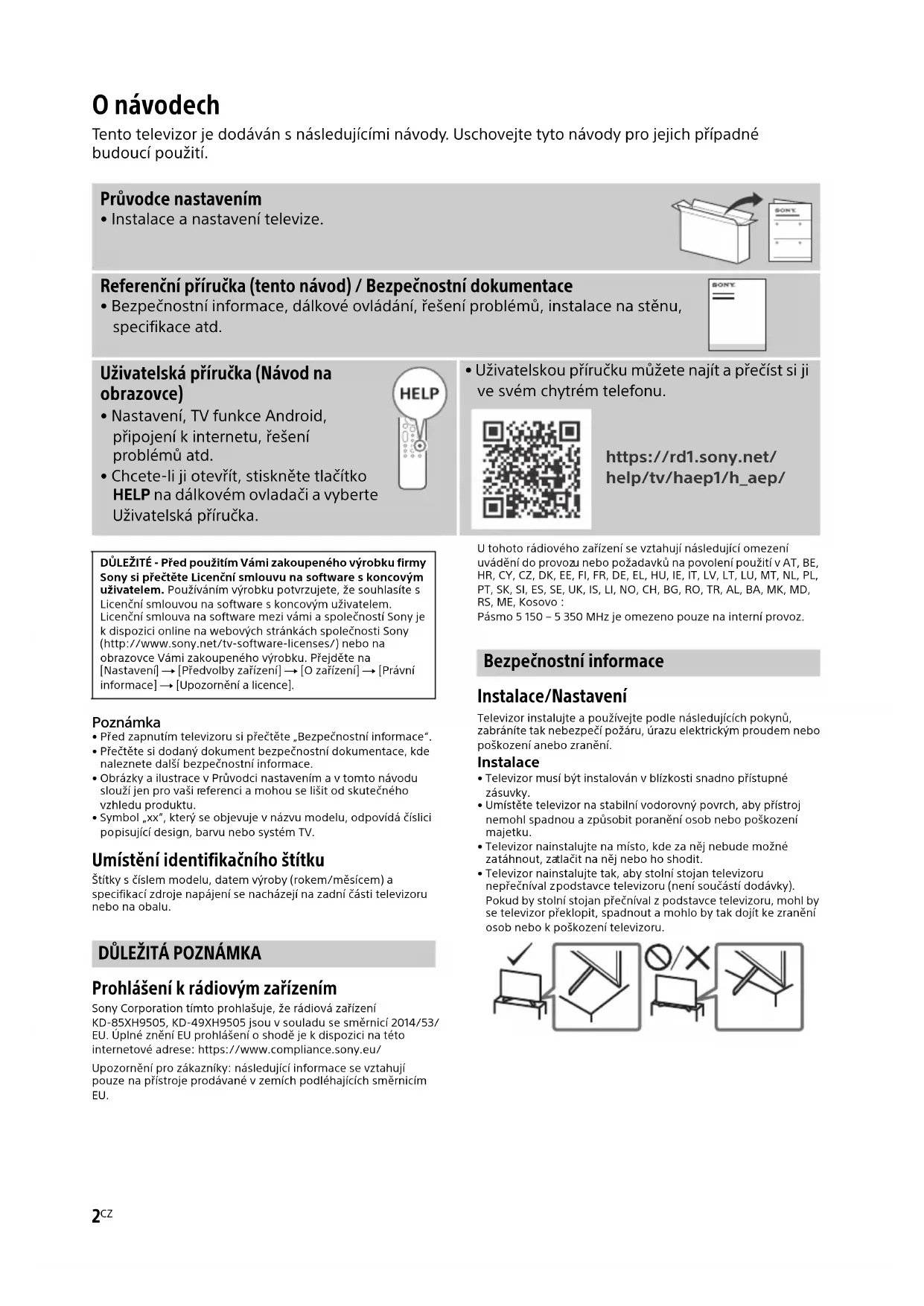 Prohlášení k rádiovým zařízením Sony Corporation tímto prohlašuje, že rádiová zařízení KD-85XH9505, KD-49XH9505 jsou v souladu se směrnicí 2014/53/EU. Úplné znění EU prohlášení o shodě je k dispozici na této internetové adrese: https://www.compliance.sony.eu/Upozornění pro zákazníky: následující informace se vztahují pouze na přístroje prodávané v zemích podléhajících směrnicím EU. U tohoto rádiového zařízení se vztahují následující omezení uvádění do provozu nebo požadavků na povolení použití v AT, BE, HR, CY, CZ, DK, EE, FI, FR, DE, EL, HU, IE, IT, LV, LT, LU, MT, NL, PL, PT, SK, SI, ES, SE, UK, IS, LI, NO, CH, BG, RO, TR, AL, BA, MK, MD, RS, ME, Kosovo :Pásmo 5 150 – 5 350 MHz je omezeno pouze na interní provoz. Bezpečnostní informace Instalace/Nastavení Televizor instalujte a používejte podle následujících pokynů, zabráníte tak nebezpečí požáru, úrazu elektrickým proudem nebo poškození anebo zranění. Instalace