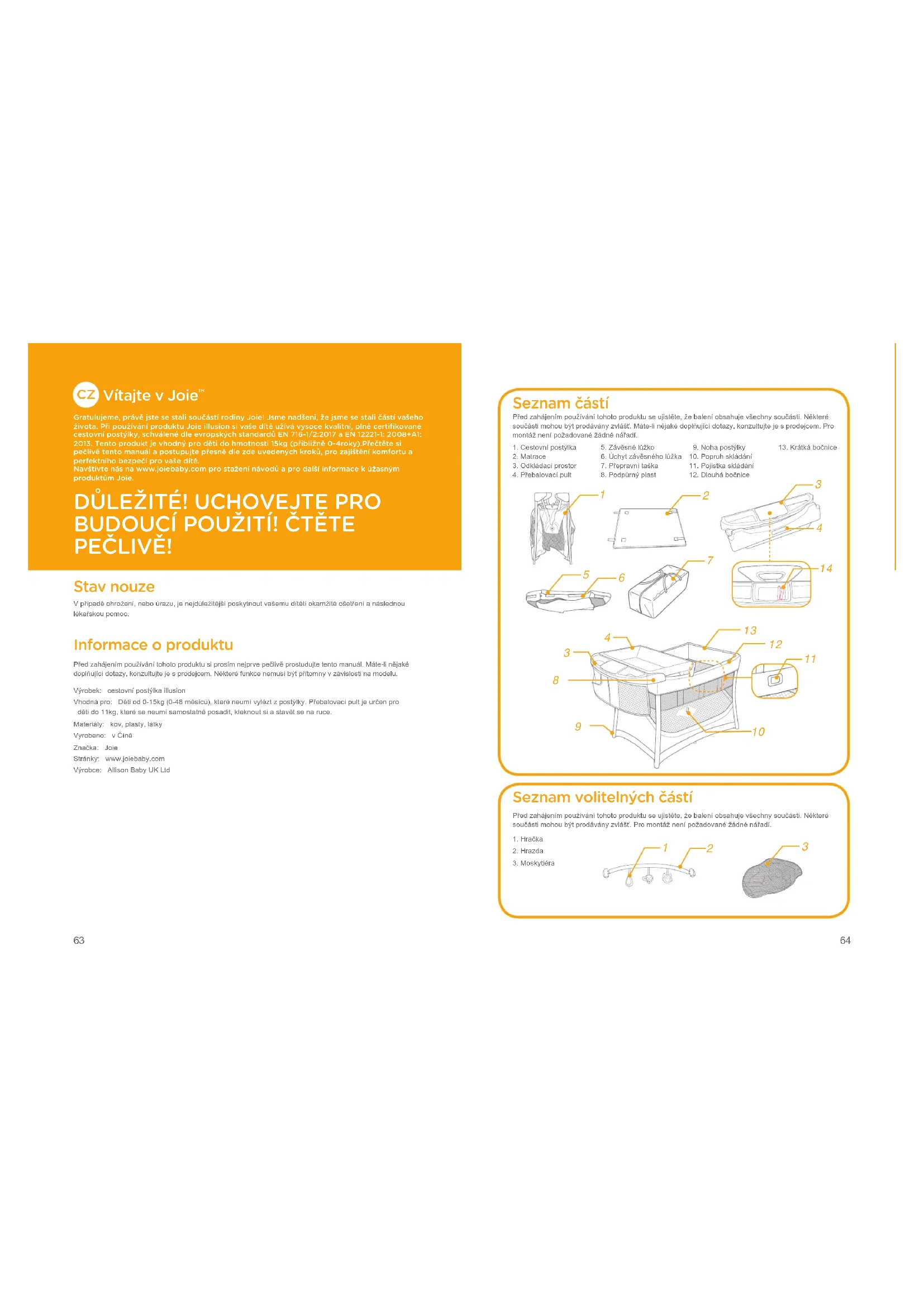 PEČLIVĚ! Stav nouze V případě ohrožení, nebo úrazu, je nejdůležitější poskytnout vašemu dítěti okamžité ošetření a následnou lékařskou pomoc. Informace o produktu Před zahájením používání tohoto produktu si prosím nejprve pečlivě prostudujte tento manuál. Máte-li nějaké doplňující dotazy, konzultujte je s prodejcem. Některé funkce nemusí být přítomny v závislosti na modelu.Výrobek: cestovní postýlka illusionVhodná pro: Děti od 0-15kg (0-48 měsíců), které neumí vylézt z postýlky. Přebalovací pult je určen pro děti do 11kg, které se neumí samostatně posadit, kleknout si a stavět se na ruce.Materiály: kov, plasty, látkyVyrobeno: v ČíněZnačka: JoieStránky: www.joiebaby.comVýrobce: Allison Baby UK Ltd1. Cestovní postýlka2. Matrace3. Odkládací prostor4. Přebalovací pult5. Závěsné lůžko6. Úchyt závěsného lůžka7. Přepravní taška8. Podpůrný plast 9. Noha postýlky10. Popruh skládání11. Pojistka skládání12. Dlouhá bočnice13. Krátká bočnice Seznam částí Před zahájením používání tohoto produktu se ujistěte, že balení obsahuje všechny součásti. Některé součásti mohou být prodávány zvlášť. Máte-li nějaké doplňující dotazy, konzultujte je s prodejcem. Pro montáž není požadované žádné nářadí.