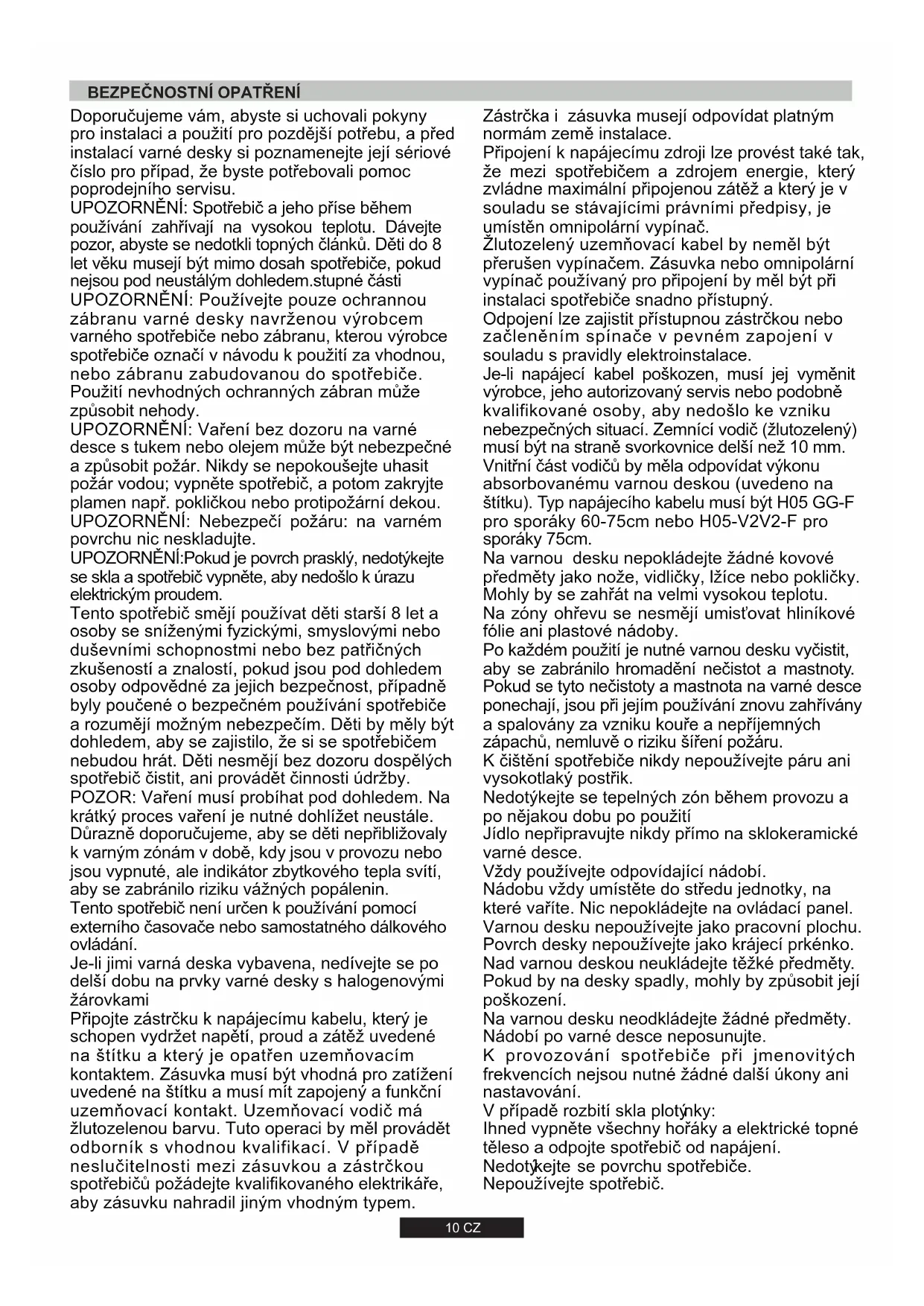 Zástrčka i zásuvka musejí odpovídat platným normám země instalace. Připojení k napájecímu zdroji lze provést také tak, že mezi spotřebičem a zdrojem energie, který zvládne maximální připojenou zátěž a který je v souladu se stávajícími právními předpisy, je umístěn omnipolární vypínač. Žlutozelený uzemňovací kabel by neměl být přerušen vypínačem. Zásuvka nebo omnipolární vypínač používaný pro připojení by měl být při instalaci spotřebiče snadno přístupný. Odpojení lze zajistit přístupnou zástrčkou nebo začleněním spínače v pevném zapojení v souladu s pravidly elektroinstalace. Je-li napájecí kabel poškozen, musí jej vyměnit výrobce, jeho autorizovaný servis nebo podobně kvalifikované osoby, aby nedošlo ke vzniku nebezpečných situací. Zemnící vodič (žlutozelený) musí být na straně svorkovnice delší než 10 mm. Vnitřní část vodičů by měla odpovídat výkonu absorbovanému varnou deskou (uvedeno na štítku). Typ napájecího kabelu musí být H05 GG-F pro sporáky 60-75cm nebo H05-V2V2-F pro sporáky 75cm. Po každém použití je nutné varnou desku vyčistit, aby se zabránilo hromadění nečistot a mastnoty. Pokud se tyto nečistoty a mastnota na varné desce ponechají, jsou při jejím používání znovu zahřívány a spalovány za vzniku kouře a nepříjemných zápachů, nemluvě o riziku šíření požáru. Nádobu vždy umístěte do středu jednotky, na které vaříte. Nic nepokládejte na ovládací panel. Na varnou desku neodkládejte žádné předměty. Jídlo nepřipravujte nikdy přímo na sklokeramické varné desce. Na varnou desku nepokládejte žádné kovové předměty jako nože, vidličky, lžíce nebo pokličky. Mohly by se zahřát na velmi vysokou teplotu. Varnou desku nepoužívejte jako pracovní plochu. K provozování spotřebče přjmenovtých frekvencích nejsou nutné žádné další úkony an nastavování. Nad varnou deskou neukládejte těžké předměty. Pokud by na desky spadly, mohly by způsobit její poškození. Na zóny ohřevu se nesmějí umisťovat hliníkové fólie ani plastové nádoby. Nedotýkejte se tepelných zón během provozu a po nějakou dobu po použití Ihned vypněte všechny hořáky a elektrcké topné těleso a odpojte spotřebč od napájení. Vždy používejte odpovídající nádobí. Nedotýkejte se povrchu spotřebče. Povrch desky nepoužívejte jako krájecí prkénko. V případě rozbtí skla plotýnky: K čištění spotřebiče nikdy nepoužívejte páru ani vysokotlaký postřik. Nepoužívejte spotřebč. Nádobí po varné desce neposunujte.Pokud je varná deska připevněná k nábytku na kterékoli straně, vzdálenost mezi varnou deskou a nábytkem musí být nejméně 17 cm (60 cm) nebo 25 cm (75 cm) ; zatímco vzdálenost mezi varnou deskou a zadní stěnou musí být nejméně 70 mm. (viz obrázek 2) Varnou desku lze instalovat do pracovní desky, která je z teplu odolného materiálu do 100°C a má tloušťku 25-45 mm. Rozměry výřezu v pracovní desce jsou na .obrázku 2 Pokud není volný prostor mezi varnou deskou a skříňkou pod ní, je nutné instalovat vhodné mezidno (dřevěné nebo z podobného materiálu) .(obrázek 3) Kovové předměty v zásuvce mohou v důsledku recirkulace vzduchu dosáhnout vysokých teplot. Vzdálenost mezi varnou deskou a spotřebičem nad ní (např. odsavač par) musí být nejméně 70 cm .(obrázek 4) Doporučuje se proto použít .dřevěnou vložku Důležité - Obrázek 1 znázorňuje aplikaci těsnění. Varná deska se upevňuje pomocí dodaných upevňovacích svorek, pomocí otvorů ve spodní části spotřebiče. Pokud je 60 cm alebo 75 cm varná deska nad troubou, musí být přidán chladicí Ventilátor. 11 CZ