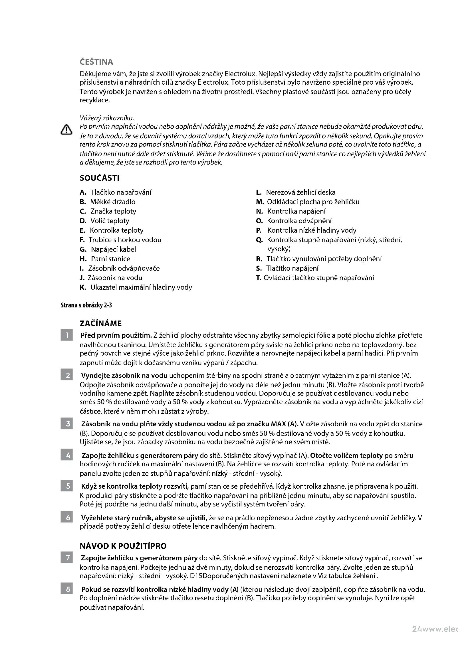 Dekujeme vam, ze jste si zvolili vyrobek značky Electrolux. Nejlepši yvsledky vždy zajisté použitím originániho príslušenstvi a nahradních dílu značky Electrolux. Toto príslušenstvi bylo navrženo SPECIALNe pro vás vyrobek. Tento vyrobek je navržen s ohledem naživotné prostředí. Vsechny plastové současti jsou označeny pro učěly recyklace.