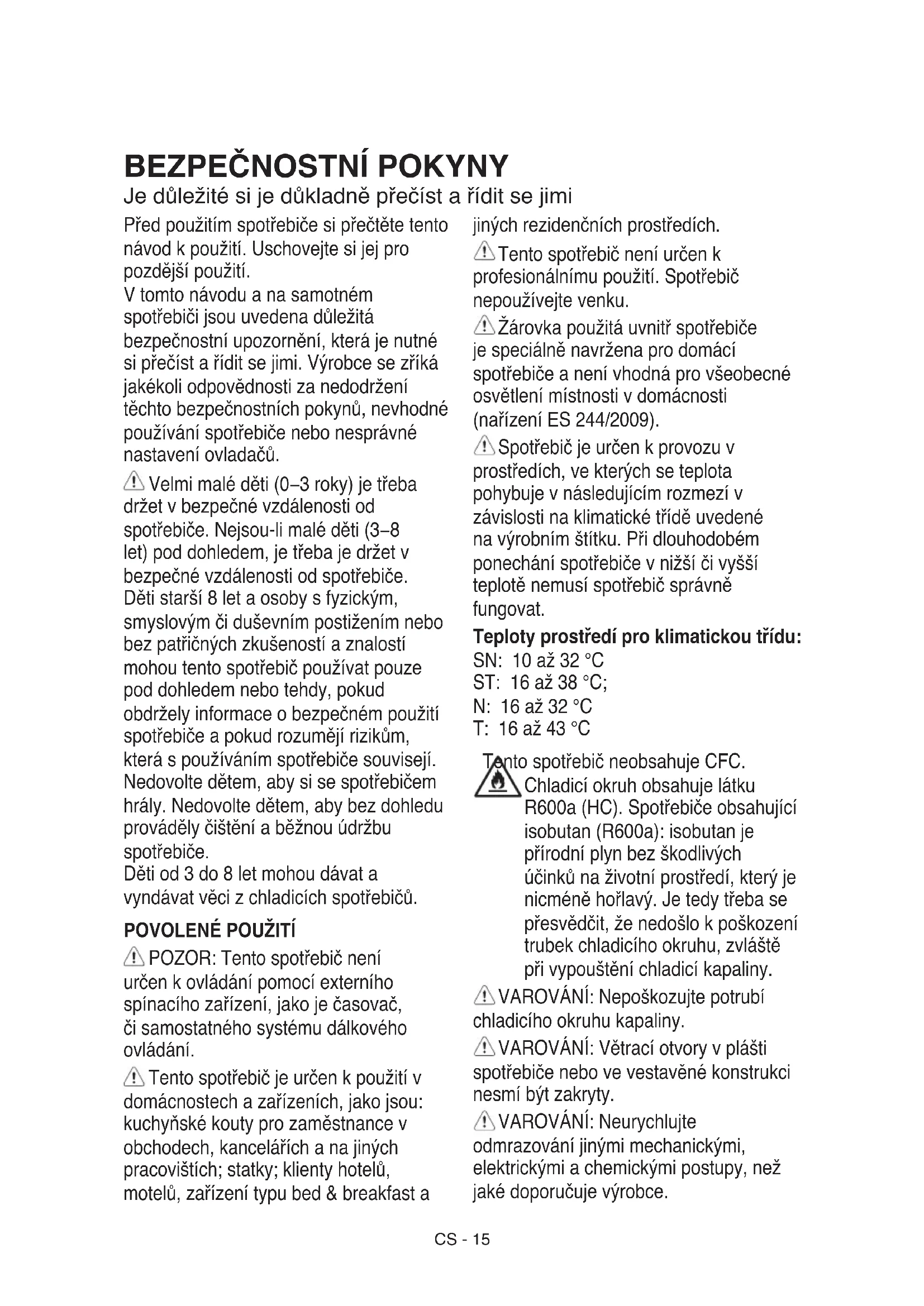 Je důležité si je důkladně přečíst a řídit se jimi Před použitím spotřebiče si přečtěte tento návod k použití. Uschovejte si jej pro pozdější použití. V tomto návodu a na samotném spotřebiči jsou uvedena důležitá bezpečnostní upozornění, která je nutné si přečíst a řídit se jimi. Výrobce se zříká jakékoli odpovědnosti za nedodržení těchto bezpečnostních pokynů, nevhodné používání spotřebiče nebo nesprávné nastavení ovladačů. Velmi malé děti (0−3 roky) je třeba držet v bezpečné vzdálenosti od spotřebiče. Nejsou-li malé děti (3−8 let) pod dohledem, je třeba je držet v bezpečné vzdálenosti od spotřebiče. Děti starší 8 let a osoby s fyzickým, smyslovým či duševním postižením nebo bez patřičných zkušeností a znalostí mohou tento spotřebič používat pouze pod dohledem nebo tehdy, pokud obdržely informace o bezpečném použití spotřebiče a pokud rozumějí rizikům, která s používáním spotřebiče souvisejí. Nedovolte dětem, aby si se spotřebičem hrály. Nedovolte dětem, aby bez dohledu prováděly čištění a běžnou údržbu spotřebiče. Děti od 3 do 8 let mohou dávat a vyndávat věci z chladicích spotřebičů.