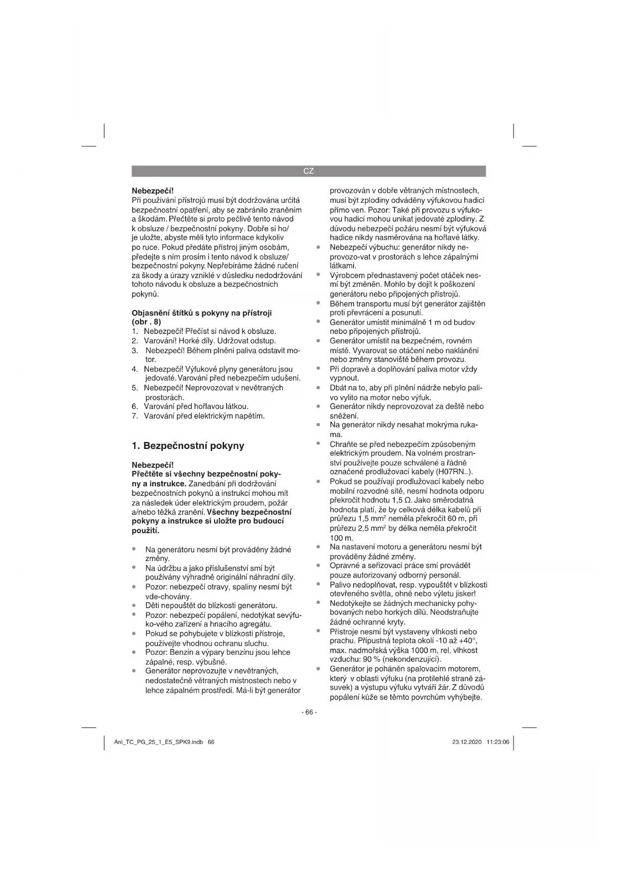 Generátor je poháněn spalovacím motorem, který v oblasti výfuku (na protilehlé straně zá- suvek) a výstupu výfuku vytváří žár. Z důvodů popálení kůže se těmto povrchům vyhýbejte. Anl_TC_PG_25_1_E5_SPK9.indb 66Anl_TC_PG_25_1_E5_SPK9.indb 66 23.12.2020 11:23:0623.12.2020 11:23:06CZ