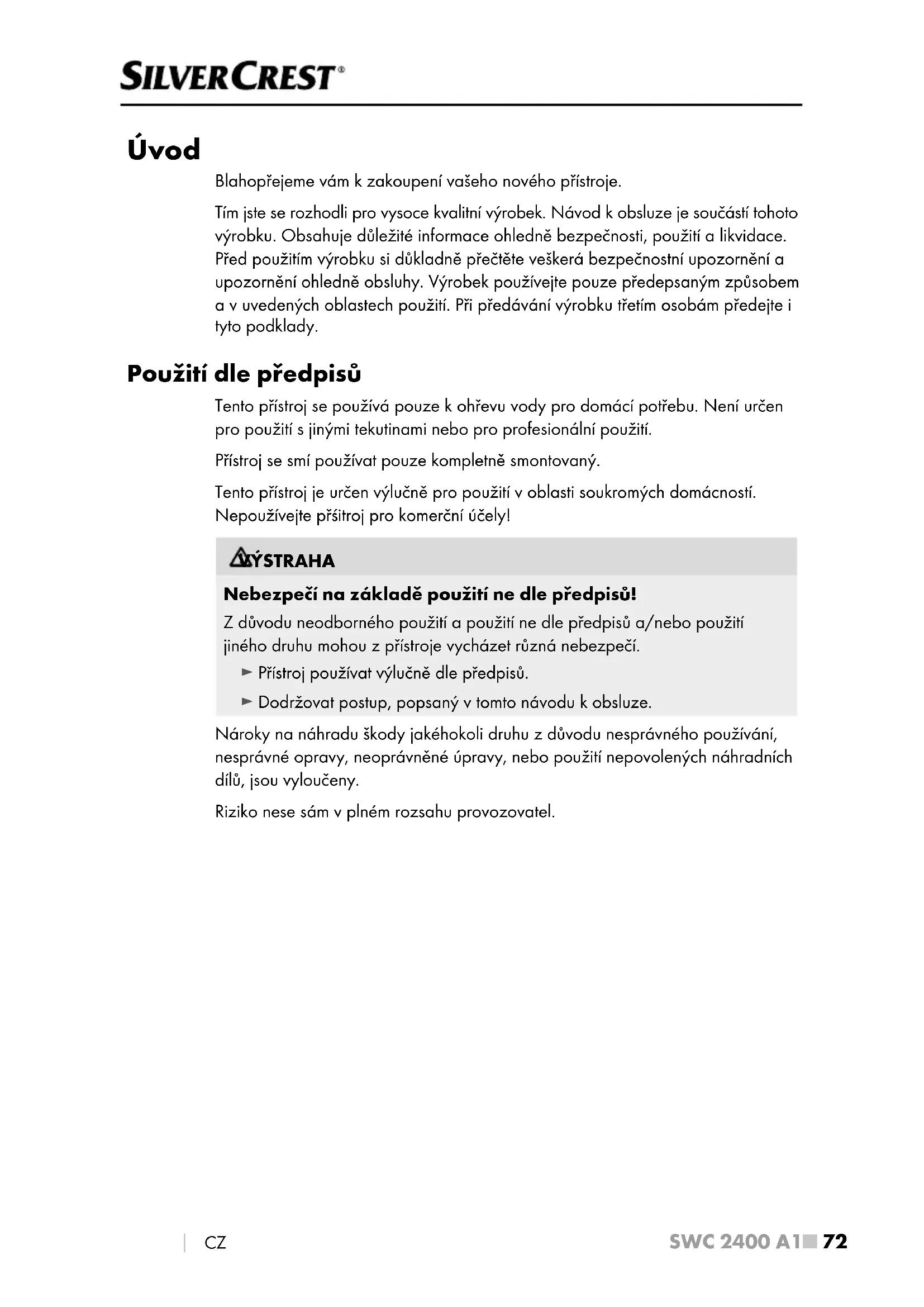 CZ Úvod Blahopřejeme vám k zakoupení vašeho nového přístroje. Tím jste se rozhodli pro vysoce kvalitní výrobek. Návod k obsluze je součástí tohoto výrobku. Obsahuje důležité informace ohledně bezpečnosti, použití a likvidace. Před použitím výrobku si důkladně přečtěte veškerá bezpečnostní upozornění a upozornění ohledně obsluhy. Výrobek používejte pouze předepsaným způsobem a v uvedených oblastech použití. Při předávání výrobku třetím osobám předejte i tyto podklady. Použití dle předpisů Tento přístroj se používá pouze k ohřevu vody pro domácí potřebu. Není určen pro použití s jinými tekutinami nebo pro profesionální použití. Přístroj se smí používat pouze kompletně smontovaný. Tento přístroj je určen výlučně pro použití v oblasti soukromých domácností. Nepoužívejte přśitroj pro komerční účely! VÝSTRAHA Nebezpečí na základě použití ne dle předpisů! Z důvodu neodborného použití a použití ne dle předpisů a/nebo použití jiného druhu mohou z přístroje vycházet různá nebezpečí. ► Přístroj používat výlučně dle předpisů. ► Dodržovat postup, popsaný v tomto návodu k obsluze. Nároky na náhradu škody jakéhokoli druhu z důvodu nesprávného používání, nesprávné opravy, neoprávněné úpravy, nebo použití nepovolených náhradních dílů, jsou vyloučeny. Riziko nese sám v plném rozsahu provozovatel.SWC 2400 A1 CZ