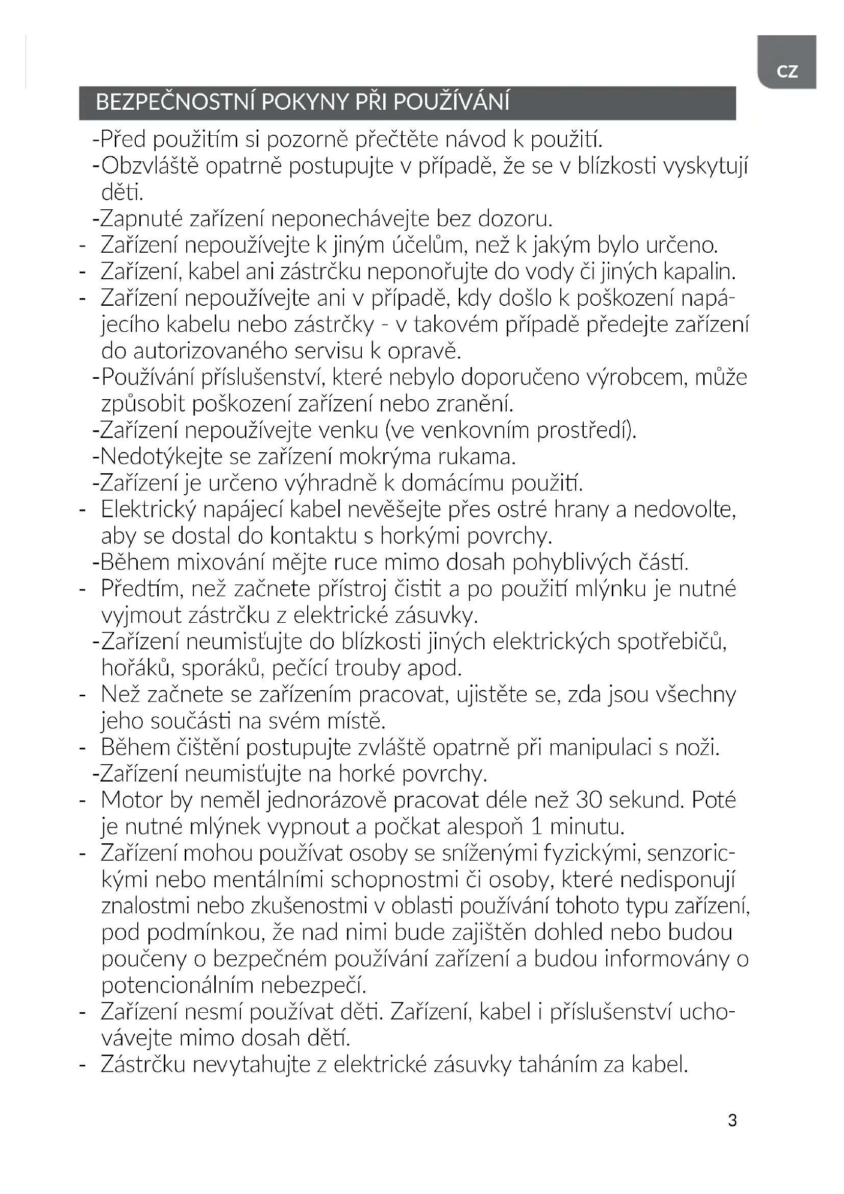 -Behem mixovani mějte ruce mimo dosah pohyblivych Časti. - Předtím, než začnete prístroj Čistit a po použití mlýnku je nutné vyjmout zástrčku z elektrické zásuvky.