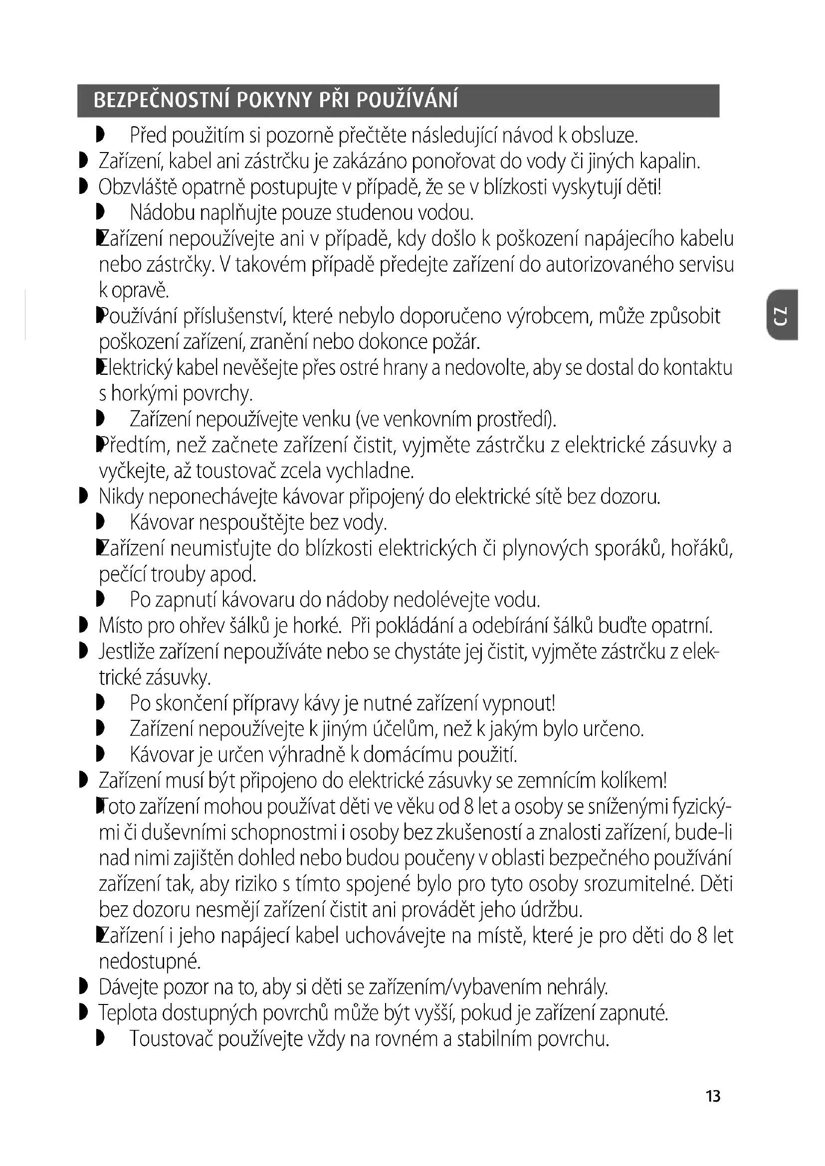 trické zásuvky. Po skončení přípravy kávy je nutné zařízení vypnout! Zařízení nepoužívejte k jiným účelům, než k jakým bylo určeno. Kávovar je určen výhradně k domácímu použití. Zařízení musí být připojeno do elektrické zásuvky se zemnícím kolíkem!