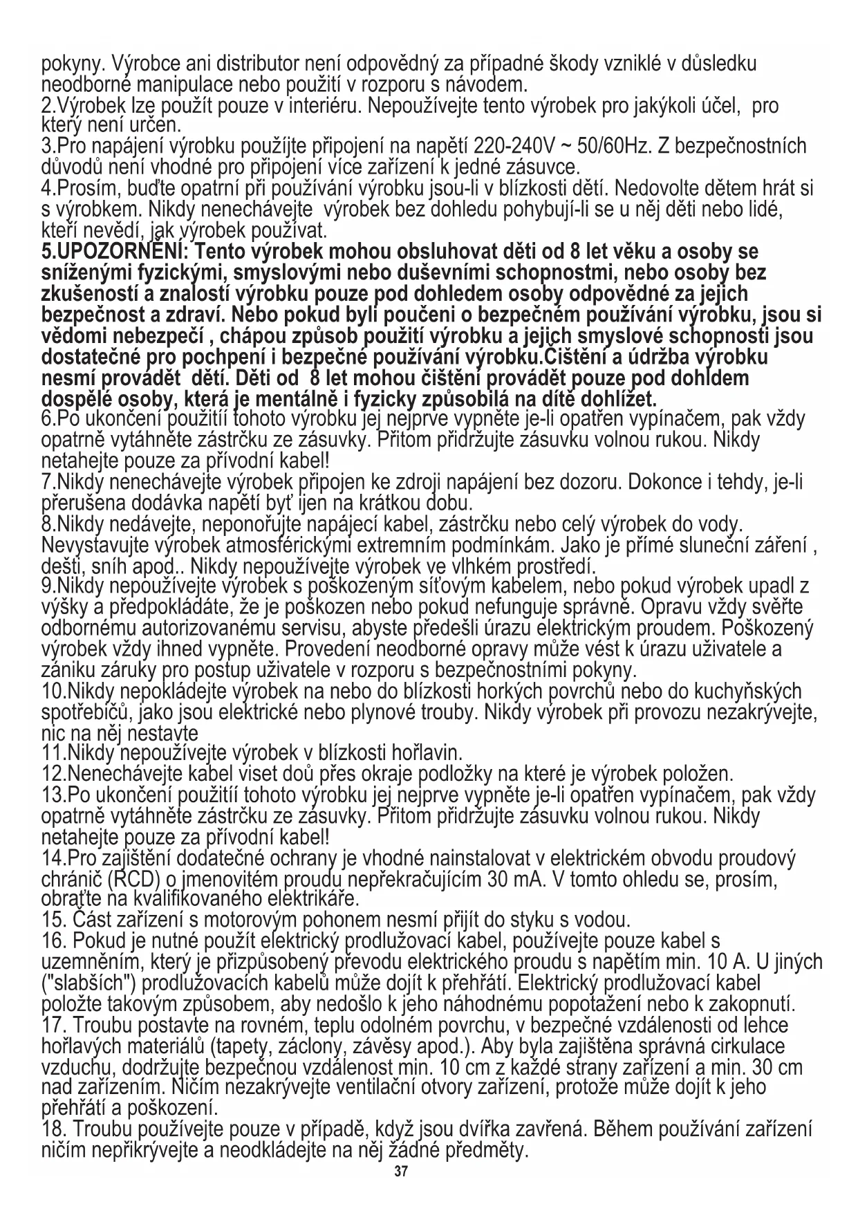 hořlavých materiálů (tapety, záclony, závěsy apod.). Aby byla zajištěna správná cirkulace vzduchu, dodržujte bezpečnou vzdálenost min. 10 cm z každé strany zařízení a min. 30 cm nad zařízením. Ničím nezakrývejte ventilační otvory zařízení, protože může dojít k jeho přehřátí a poškození. 3.Pro napájení výrobku použíjte připojení na napětí 220-240V ~ 50/60Hz. Z bezpečnostních důvodů není vhodné pro připojení více zařízení k jedné zásuvce. 13.Po ukončení použitíí tohoto výrobku jej nejprve vypněte je-li opatřen vypínačem, pak vždy opatrně vytáhněte zástrčku ze zásuvky. Přitom přidržujte zásuvku volnou rukou. Nikdy netahejte pouze za přívodní kabel! 8.Nikdy nedávejte, neponořujte napájecí kabel, zástrčku nebo celý výrobek do vody. Nevystavujte výrobek atmosférickými extremním podmínkám. Jako je přímé sluneční záření , dešti, sníh apod.. Nikdy nepoužívejte výrobek ve vlhkém prostředí. pokyny. Výrobce ani distributor není odpovědný za případné škody vzniklé v důsledku neodborné manipulace nebo použití v rozporu s návodem. 2.Výrobek lze použít pouze v interiéru. Nepoužívejte tento výrobek pro jakýkoli účel, pro který není určen. 10.Nikdy nepokládejte výrobek na nebo do blízkosti horkých povrchů nebo do kuchyňských spotřebičů, jako jsou elektrické nebo plynové trouby. Nikdy výrobek při provozu nezakrývejte, nic na něj nestavte 7.Nikdy nenechávejte výrobek připojen ke zdroji napájení bez dozoru. Dokonce i tehdy, je-li přerušena dodávka napětí byť ijen na krátkou dobu. 4.Prosím, buďte opatrní při používání výrobku jsou-li v blízkosti dětí. Nedovolte dětem hrát si s výrobkem. Nikdy nenechávejte výrobek bez dohledu pohybují-li se u něj děti nebo lidé, kteří nevědí, jak výrobek používat. 5.UPOZORNĚNÍ: Tento výrobek mohou obsluhovat děti od 8 let věku a osoby se sníženými fyzickými, smyslovými nebo duševními schopnostmi, nebo osoby bez zkušeností a znalostí výrobku pouze pod dohledem osoby odpovědné za jejich bezpečnost a zdraví. Nebo pokud byli poučeni o bezpečném používání výrobku, jsou si vědomi nebezpečí , chápou způsob použití výrobku a jejich smyslové schopnosti jsou dostatečné pro pochpení i bezpečné používání výrobku.Čištění a údržba výrobku nesmí provádět dětí. Děti od 8 let mohou čištění provádět pouze pod dohldem dospělé osoby, která je mentálně i fyzicky způsobilá na dítě dohlížet. 6.Po ukončení použitíí tohoto výrobku jej nejprve vypněte je-li opatřen vypínačem, pak vždy opatrně vytáhněte zástrčku ze zásuvky. Přitom přidržujte zásuvku volnou rukou. Nikdy netahejte pouze za přívodní kabel! 11.Nikdy nepoužívejte výrobek v blízkosti hořlavin. 12.Nenechávejte kabel viset doů přes okraje podložky na které je výrobek položen. 14.Pro zajištění dodatečné ochrany je vhodné nainstalovat v elektrickém obvodu proudový chránič (RCD) o jmenovitém proudu nepřekračujícím 30 mA. V tomto ohledu se, prosím, obraťte na kvalifikovaného elektrikáře.38