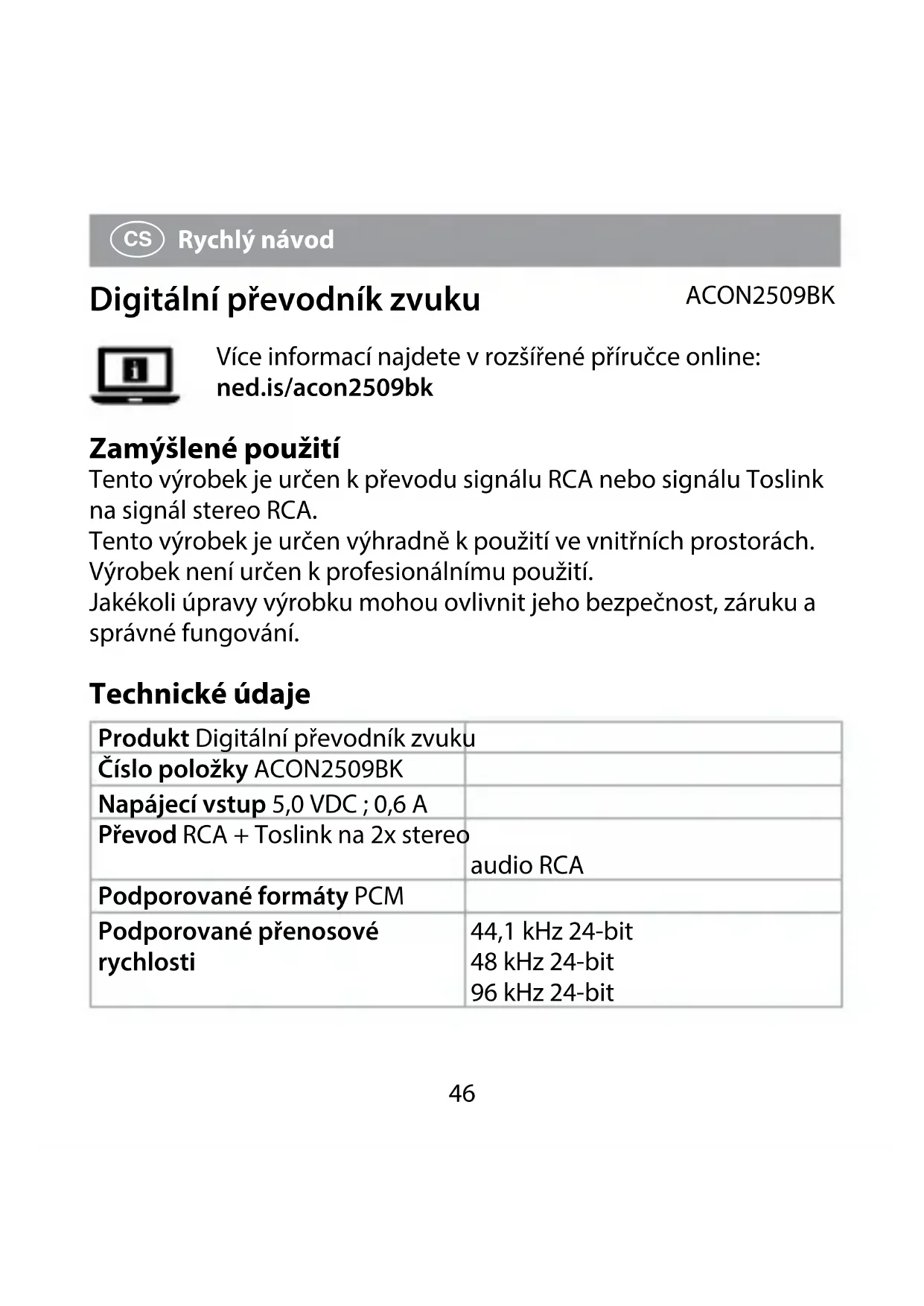 Rychlý návod Digitální převodník zvuku ACON2509BK Více informací najdete v rozšířené příručce online: ned.is/acon2509bk Zamýšlené použití Tento výrobek je určen kpřevodu signálu RCA nebo signálu Toslink na signál stereo RCA. Tento výrobek je určen výhradně k použití ve vnitřních prostorách. Výrobek není určen k profesionálnímu použití. Jakékoli úpravy výrobku mohou ovlivnit jeho bezpečnost, záruku a správné fungování. Technické údaje Produkt Digitální převodník zvuku Číslo položky ACON2509BK Napájecí vstup 5,0 VDC ; 0,6 A Převod RCA + Toslink na 2x stereo audio RCA Podporované formáty PCM Podporované přenosové rychlosti 44,1 kHz 24-bit 48 kHz 24-bit 96 kHz 24-bit47 Hlavní části (obrázek A)