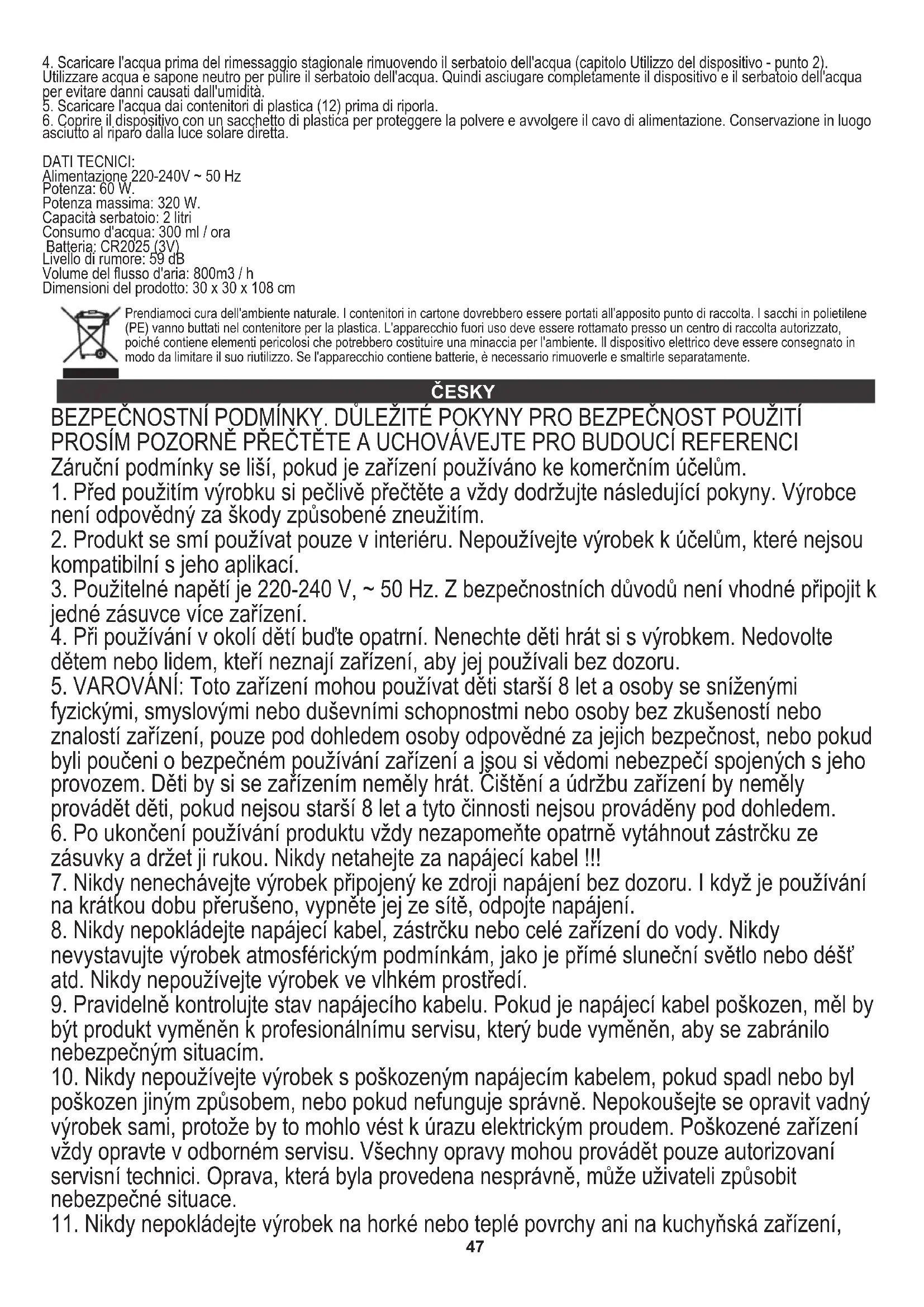 6. Zakryjte zařízení plastovým sáčkem, abyste chránili prach, a naviňte napájecí kabel. Skladujte na suchém místě mimo přímé sluneční světlo. TECHNICKÁ DATA: Napájení 220-240 V ~ 50 Hz Příkon: 60 W. Max. Výkon: 320 W. Objem nádrže: 2 litry Spotřeba vody: 300 ml / hod Baterie: CR2025 (3V) Úroveň hluku: 59 dB Objem vzduchu: 800 m3 / h Rozměry produktu: 30 x 30 x 108 cm Ochrana životního prostředí. Kartón odevzdejte do sběru. Polyetylénové sáčky (PE) vyhazujte do kontejneru na plasty. Vysloužilý přístroj odevzdejte do příslušného sběrného dvoru, protože některé části zařízení mohou představovat pro životní prostředí nebezpečí. Elektrický přístroj odevzdejte tak, aby se omezilo jeho opětovné používání. Pokud jsou v přístroji baterie, vyjměte je a odevzdejte do příslušného sběrného místa zvlášť. Přístroj nevyhazujte do popelnic ani kontejneru na směsný odpad!! NEDERLANDS