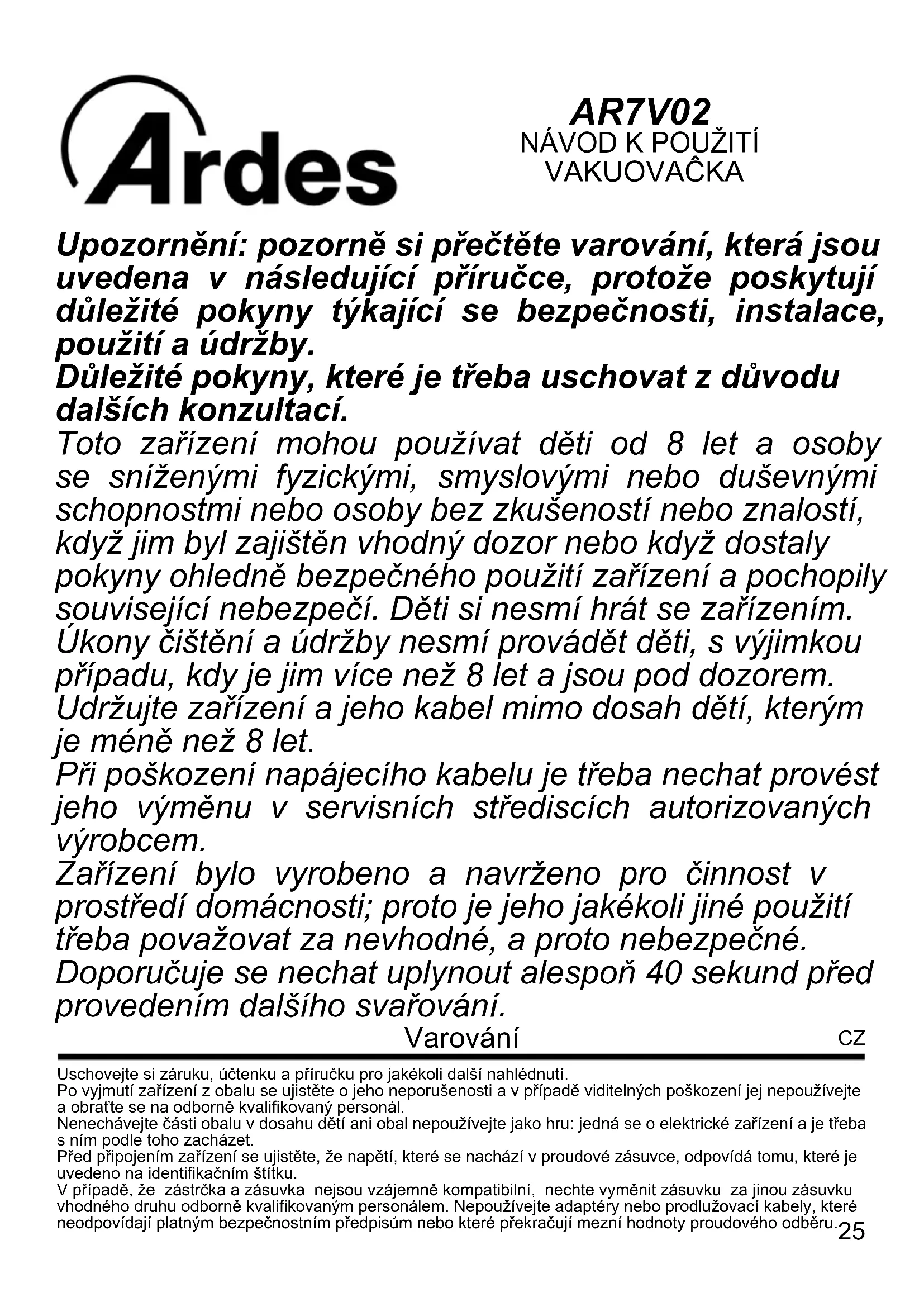 VAKUOVAĈKA Upozornění: pozorně si přečtěte varování, která jsou uvedena v následující příručce, protože poskytují důležité pokyny týkající se bezpečnosti, instalace, použití a údržby. Důležité pokyny, které je třeba uschovat z důvodu dalších konzultací. Toto zařízení mohou používat děti od 8 let a osoby se sníženými fyzickými, smyslovými nebo duševnými schopnostmi nebo osoby bez zkušeností nebo znalostí, když jim byl zajištěn vhodný dozor nebo když dostaly pokyny ohledně bezpečného použití zařízení a pochopily související nebezpečí. Děti si nesmí hrát se zařízením. Úkony čištění a údržby nesmí provádět děti, s výjimkou případu, kdy je jim více než 8 let a jsou pod dozorem. Udržujte zařízení a jeho kabel mimo dosah dětí, kterým je méně než 8 let. Při poškození napájecího kabelu je třeba nechat provést jeho výměnu v servisních střediscích autorizovaných výrobcem. Zařízení bylo vyrobeno a navrženo pro činnost v prostředí domácnosti; proto je jeho jakékoli jiné použití třeba považovat za nevhodné, a proto nebezpečné. Doporučuje se nechat uplynout alespoň 40 sekund před provedením dalšího svařování.