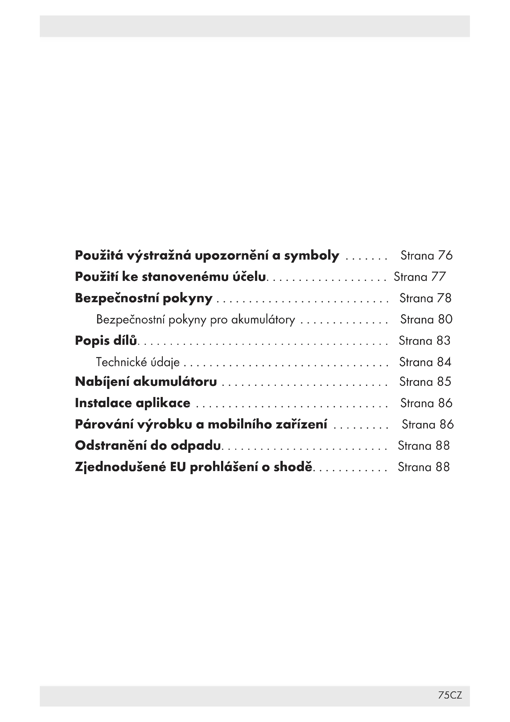 Použitá výstražná upozornění a symboly V tomto návodu k obsluze se používají následující výstražná upozornění: NEBEZPEČÍ! Tento symbol se signální slovem „NEBEZPEČÍ“ označuje ohrožení s vysokým stupněm rizika, které má, pokud se mu nezabrání, za následek těžké zranění nebo smrt. VAROVÁNÍ! Tento symbol se signální slovem „VAROVÁNÍ“ označuje ohrožení se středním stupněm rizika, které může mít, pokud se mu nezabrání, za následek těžké zranění. OPATRNĚ! Tento symbol se signální slovem „OPATRNĚ“ označuje ohrožení s nízkým stupněm rizika, které může mít, pokud se mu nezabrání, za následek malé nebo lehké zranění. VÝSTRAHA! Tento symbol se signálním slovem „VÝSTRAHA“ označuje nebezpečí možného poškození majetku. UPOZORNĚNÍ: Tento symbol se signálním slovem „UPOZORNĚNÍ“ poskytuje další užitečné informace.77CZ VAROVÁNÍ! NEBEZPEČÍ VÝBUCHU! Varování, které je opatřeno tímto označením a slovy „VAROVÁNÍ! NEBEZPEČÍ VÝBUCHU!“, poukazuje na možné nebezpečí exploze. Pokud se takové varování nedodržuje, může to s sebou přinášet vážná zranění nebo smrt a případné věcné škody. Postupujte podle pokynů v tomto varování, abyste zabránili těžkým zraněním, ohrožení života či nebezpečí vzniku škod na majetku! Tato příkazová značka upozorňuje na nošení vhodné ochranné rukavice! Postupujte podle pokynů v tomto varování pro zamezení poranění rukou objekty nebo kontaktu s horkými nebo chemickými látkami. Tento symbol znamená, že před použitím výrobku je nutno dodržovat návod k obsluze. Použití ke stanovenému účelu Tento výrobek spadá do kategorie informační elektroniky. Jakmile budete mít výrobek připojen k mobilnímu zařízení, můžete použít funkce v plném rozsahu. Výrobek zaznamenává kroky, kilometry, spálené kalorie, trvání činností a trvání spánku. Výrobek je vhodný pro použití s následujícími systémy: IOS 8.0 nebo novější, Android™ verze 6.0 nebo vyšší, Bluetooth V 4.2. Výrobek je určen pro soukromé účely, komerční využití není dovoleno.78 CZ Bezpečnostní pokyny SEZNAMTE SE PŘED POUŽITÍM VÝROBKU SE VŠEMI BEZPEČNOSTNÍMI POKYNY A POKYNY PRO OBSLUHU! KDYŽ PŘEDÁVÁTE TENTO VÝROBEK JINÝM LIDEM, PŘEDEJTE JIM I VŠECHNY DOKUMENTY! V případě poškození v důsledku nedodržení tohoto návodu k obsluze se Vaše záruka ruší! Za následné škody se nepřebírá žádná odpovědnost! V případě škody na majetku nebo zranění způsobené nesprávným používáním nebo nedodržením bezpečnostních pokynů se nepřebírá žádná odpovědnost! Před každým použitím: Výrobek zkontrolujte na poškození. Poškozený výrobek nepoužívejte. Tento výrobek mohou používat děti starší 8let i osoby se sníženými fyzickými, smyslovými či mentálními schopnostmi nebo s nedostatkem zkušeností a znalostí, pokud jsou pod dohledem nebo byly poučeny ohledně bezpečného používání přístroje a chápou z toho vyplývající rizika. Děti si nesmí s výrobkem hrát. Děti nesmí provádět čištění a údržbu bez dohledu.79CZ m NEBEZPEČÍ! Nebezpečí zadušení! Nenechte děti hrát si bez dozoru sbalicími materiály. Obalový materiál představuje nebezpečí udušení. Děti často podceňují s tím spojená nebezpečí. Vždy udržujte balicí materiál mimo dosah dětí. Balicí materiál není hračka. Nikdy výrobek neotvírejte. Neodborné opravy mohou vést k významným nebezpečím pro uživatele. Nechávejte opravy provést vždy vhodnému odborníkovi. Neobsluhujte výrobek během řízení vozidla. Je nebezpečné odvrátit pohled ze silnice a nechat se rozptylovat. Výrobek není vhodný pro zdravotní použití. Výrobek pomáhá při výpočtu uběhnuté vzdálenosti a kalorií spálených během tréningu. Než začnete s pravidelným tréningem, bezpodmínečně konzultujte svého lékaře. Chraňte výrobek před silnými nárazy, vibracemi, přímým slunečním zářením a nečistotami. Záruka se nevztahuje na škody způsobené nesprávným použitím, nedodržením návodu k obsluze či zásahy ze nepovolaných na výrobku. Nezavádějte do výrobku žádné předměty a udržujte ostré předměty dostatečně daleko od výrobku. Pokud máte implantovaný kardiostimulátor nebo defibrilátor poraďte se před nošením výrobku se svým lékařem.80 CZ Na výrobek nestavte žádné těžké předměty. Na výrobek nevyvíjejte žádný tlak. Vyhýbejte se silným magnetickým polím (např. reproduktorům). Nedodržení tohoto pokynu může vést k nepřesným měřením. Sůl a teplá voda může způsobit korozi kovových částí. Odstraňte výrobek před návštěvou sauny, protože se rozdílem teplot můře tvořit kondenzace. Riziko poškození výrobku. Bezpečnostní pokyny pro akumulátory m NEBEZPEČÍ! Uchovávejte akumulátory mimo dosah dětí. V případě spolknutí vyhledejte ihned lékaře! m NEBEZPEČÍ VÝBUCHU! Vestavěný akumulátor nemůže být odebrán nebo nahrazen uživatelem. Nezkratujte akumulátory, ani je neotevírejte. Přehřátí, nebezpečí požáru nebo roztržení může být následkem. Neházejte tento výrobek se zabudovaným akumulátorem nikdy do ohně nebo do vody. Nevystavujte tento výrobek se zabudovaným akumulátorem mechanické zátěži. Riziko vytečení akumulátorů Vyhněte se extrémním podmínkám a teplotám, které by mohly mít vliv na tento výrobek se zabudovaným akumulátorem, např. na radiátorech/přímé sluneční světlo.81CZ Zabraňte kontaktu vyteklých chemikálií s kůží, očima a sliznicemi! Opláchněte místa, která přišla do styku s kyselinou z baterie, ihned čistou vodou a bez prodlení vyhledejte lékaře!