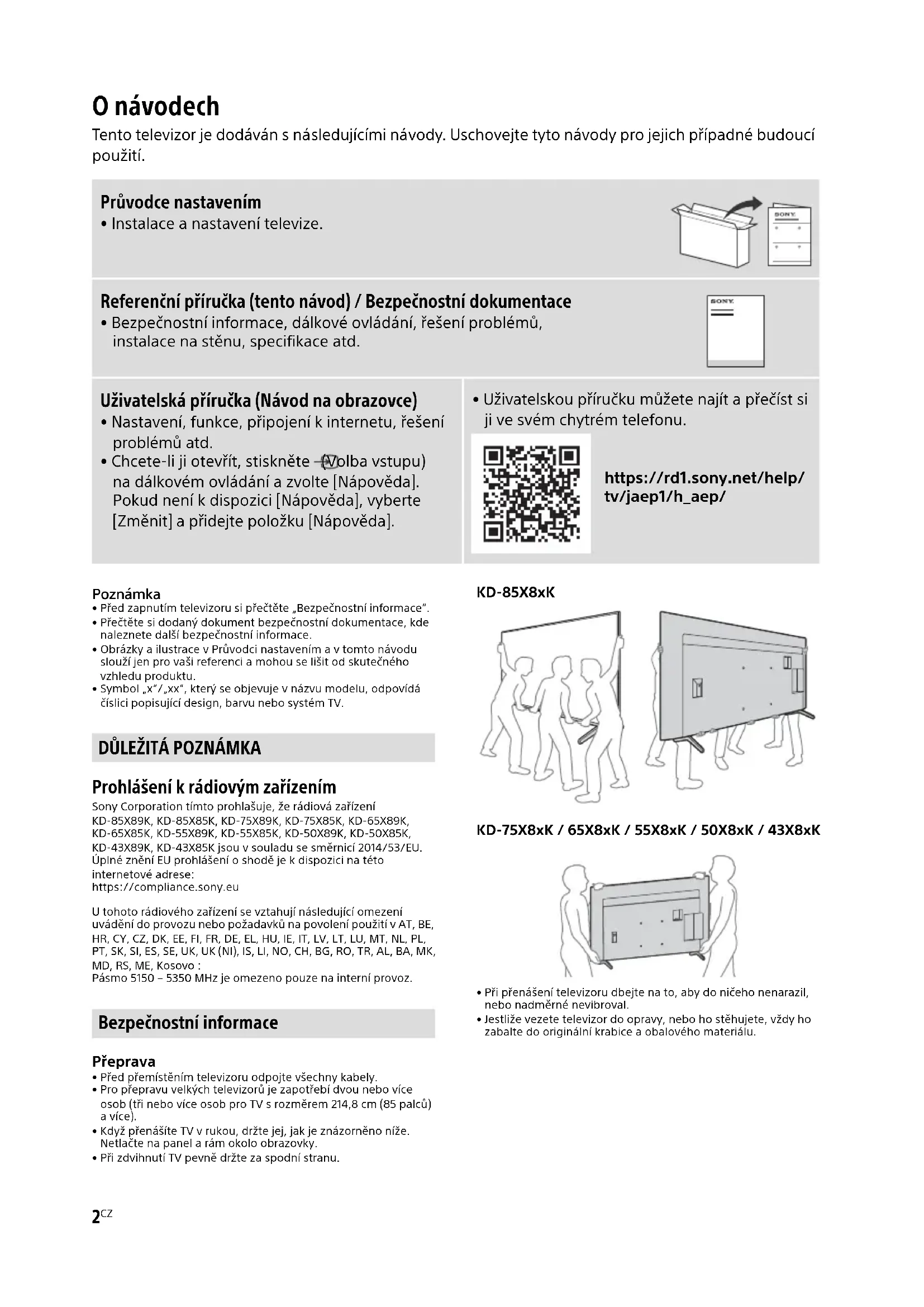 - Symbol „x“/„xx“, který se objevuje v názvu modelu, odpovídá číslici popisující design, barvu nebo systém TV. Prohlášení k rádiovým zařízením Sony Corporation tímto prohlašuje, že rádiová zařízení KD-85X89K, KD-85X85K, KD-75X89K, KD-75X85K, KD-65X89K, KD-65X85K, KD-55X89K, KD-55X85K, KD-50X89K, KD-50X85K, KD-43X89K, KD-43X85K jsou v souladu se směrnicí 2014/53/EU. Úplné znění EU prohlášení o shodě je k dispozici na této internetové adrese: https://compliance.sony.eu U tohoto rádiového zařízení se vztahují následující omezení uvádění do provozu nebo požadavků na povolení použití v AT, BE, HR, CY, CZ, DK, EE, FI, FR, DE, EL, HU, IE, IT, LV, LT, LU, MT, NL, PL, PT, SK, SI, ES, SE, UK, UK (NI), IS, LI, NO, CH, BG, RO, TR, AL, BA, MK, MD, RS, ME, Kosovo : Pásmo 5150 – 5350 MHz je omezeno pouze na interní provoz. Přeprava