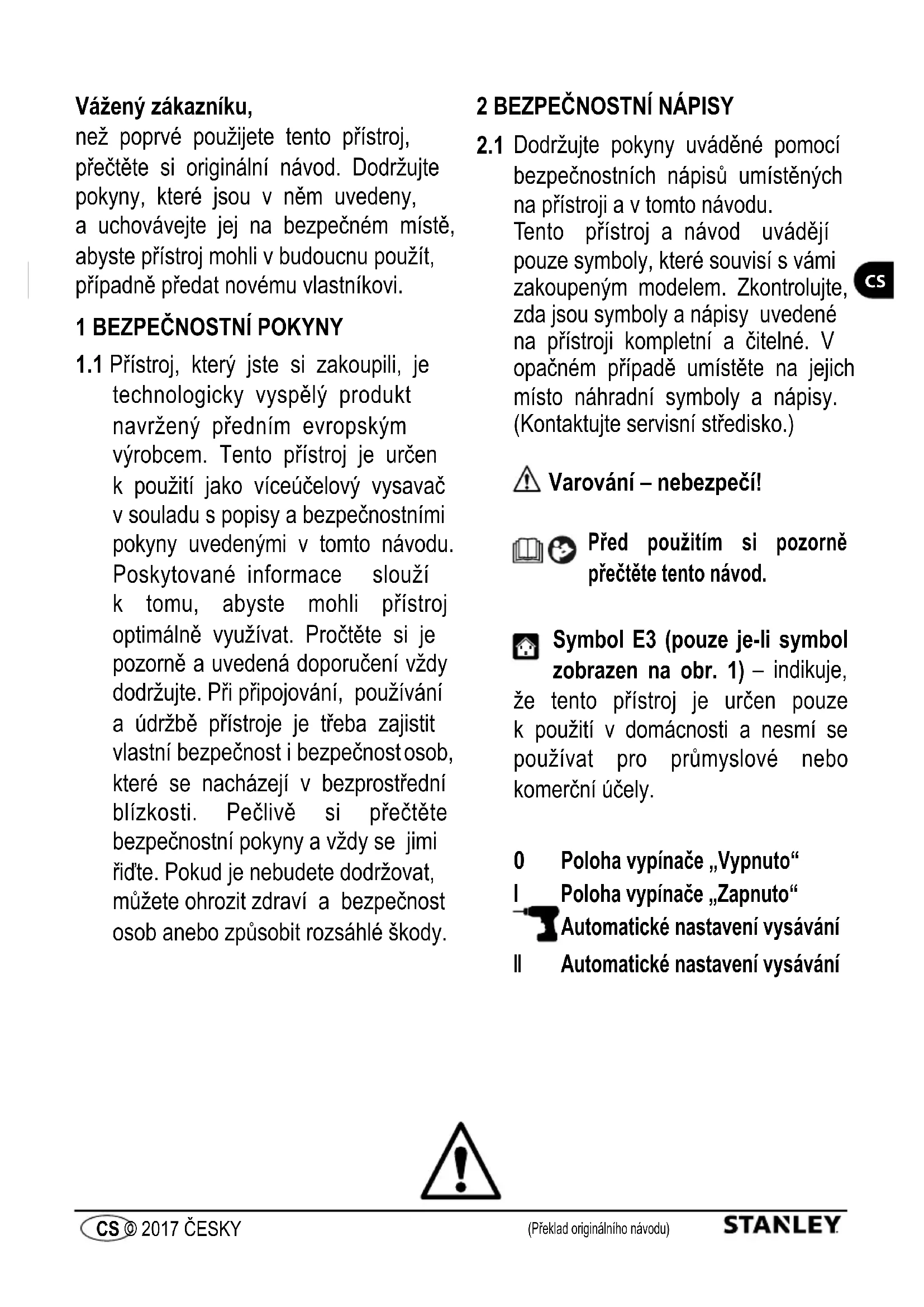 Dodržujte pokyny uváděné pomocí bezpečnostních nápisů umístěných na přístroji a v tomto návodu. Tento přístroj a návod uvádějí pouze symboly, které souvisí s vámi zakoupeným modelem. Zkontrolujte, zda jsou symboly a nápisy uvedené na přístroji kompletní a čitelné. V opačném případě umístěte na jejich místo náhradní symboly a nápisy. (Kontaktujte servisní středisko.) Varování – nebezpečí! Před použitím si pozorně přečtěte tento návod. Symbol E3 (pouze je-li symbol zobrazen na obr. 1) – indikuje, že tento přístroj je určen pouze k použití v domácnosti a nesmí se používat pro průmyslové nebo komerční účely.