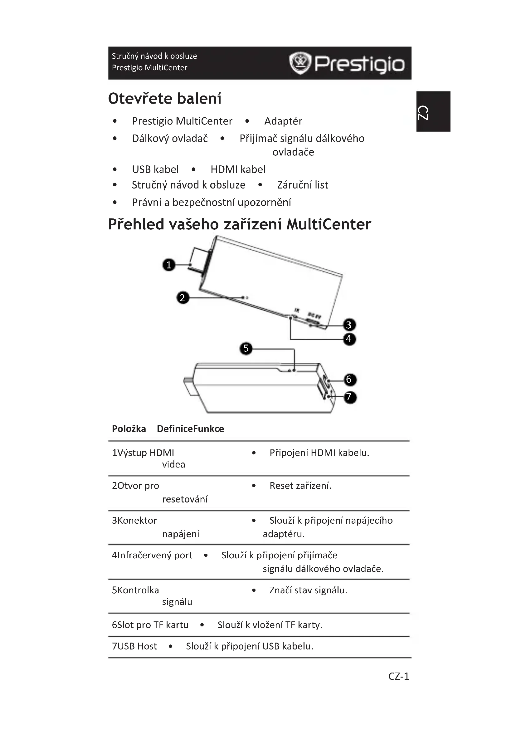 - RozhraníPrůvodcespuštěnímvámnabídnevolbujazyka PAD2411 QSG.indd 21 2013/12/16 15:35:10CZ Stručný návod k obsluze Prestigio MultiCenter CZ-4 systémuzeseznamudostupnýchjazykůavolbučasového pásma.(DŮLEŽITÉ:vyžadujevětšinaaplikací). Technické parametry Položka Specifikace OS Android4.2 CPU 1,5GHzdvoujádrovýA9 Grafickýprocesor DvoujádrovýMali400 PaměťRAM 1GBDDR3 Úložiště 4GB WiFi 802.11b/g/n MiraCast Y TFkarta Až32GB USB2.0 1× Rozměry 90×34×16mm ProduktyodspolečnostiPrestigiojsouneustále aktualizoványazlepšovány,takžesemůževzhled vašehozařízeníajehofunkcedrobnělišitodtoho,coje prezentovánovtomtoStručnémnávodukobsluze. SpolečnostPrestigiotímtoprohlašuje,žetotozařízení MultiCentervyhovujezákladnímpožadavkůmadalším příslušnýmnařízenímstanovenýmsměrnicíEU1999/5/ES. Úplnézněníprohlášeníoshodějekdispozicinaadrese: http://www.prestigio.com/compliance. PAD2411 QSG.indd 22 2013/12/16 15:35:10Schnellstartanleitung Prestigio MultiCenter