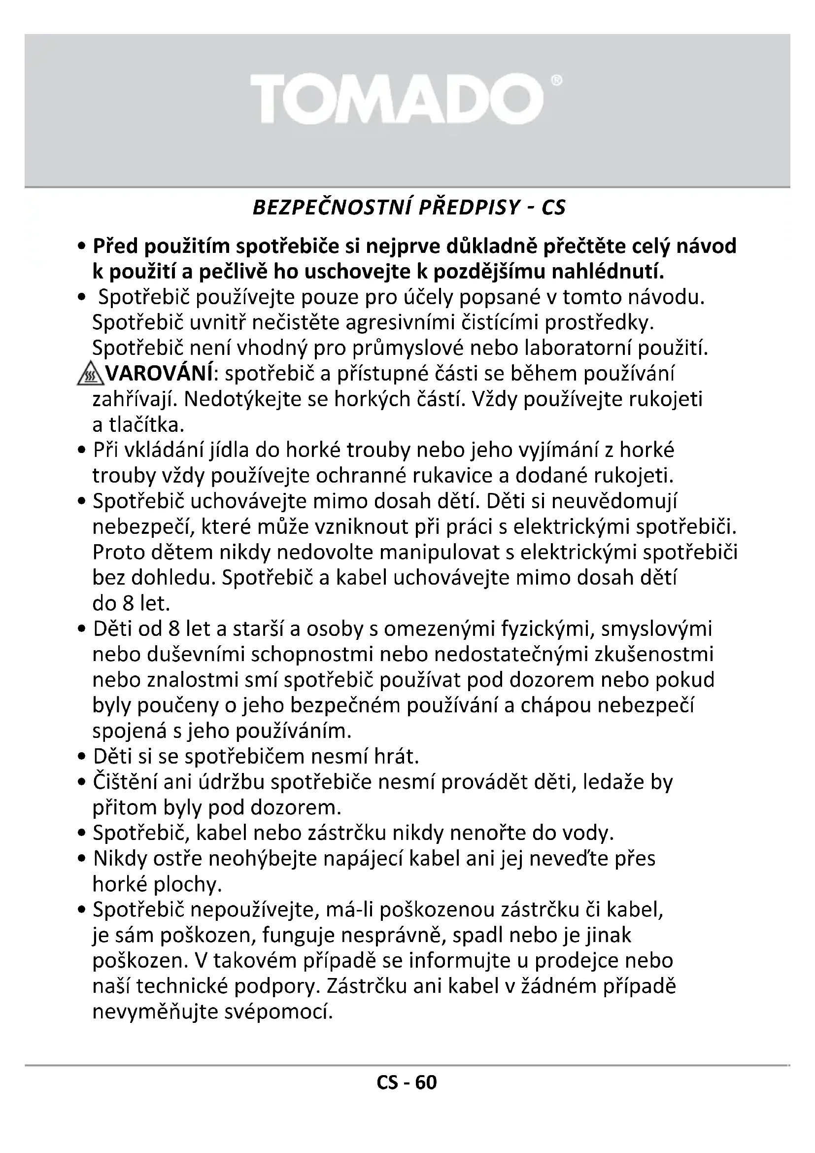 Stáhněte si návod pro váš Trouba ve formátu PDF zdarma! Najděte svůj návod TEO6000B - Tomado a vezměte svůj elektronický přístroj zpět do rukou. Na této stránce jsou zveřejněny všechny dokumenty potřebné k používání vašeho zařízení. TEO6000B značky Tomado.