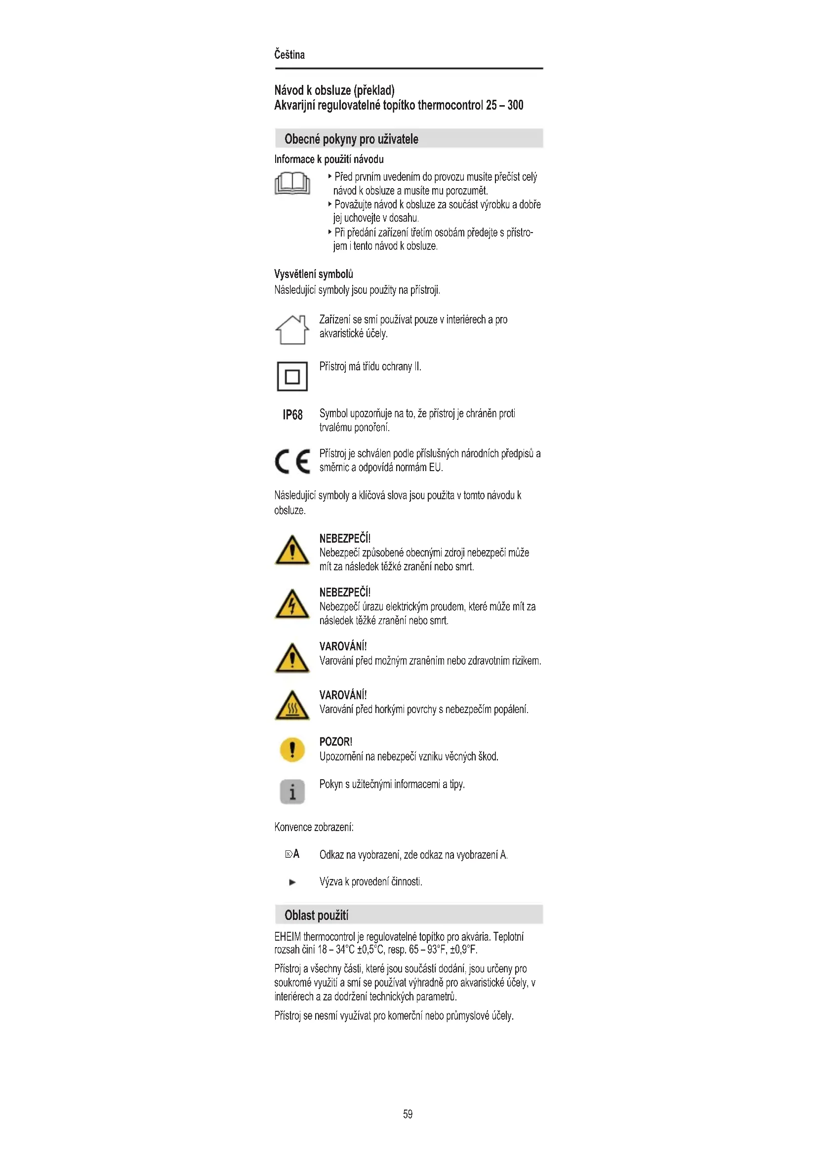 Oblast použití EHEIM thermocontrol je regulovatelné topítko pro akvária. Teplotní rozsah činí 18 – 34°C ±0,5°C, resp. 65 – 93°F, ±0,9°F. Přístroj a všechny části, které jsou součástí dodání, jsou určeny pro soukromé využití a smí se používat výhradně pro akvaristické účely, v interiérech a za dodržení technických parametrů. Přístroj se nesmí využívat pro komerční nebo průmyslové účely.Čeština