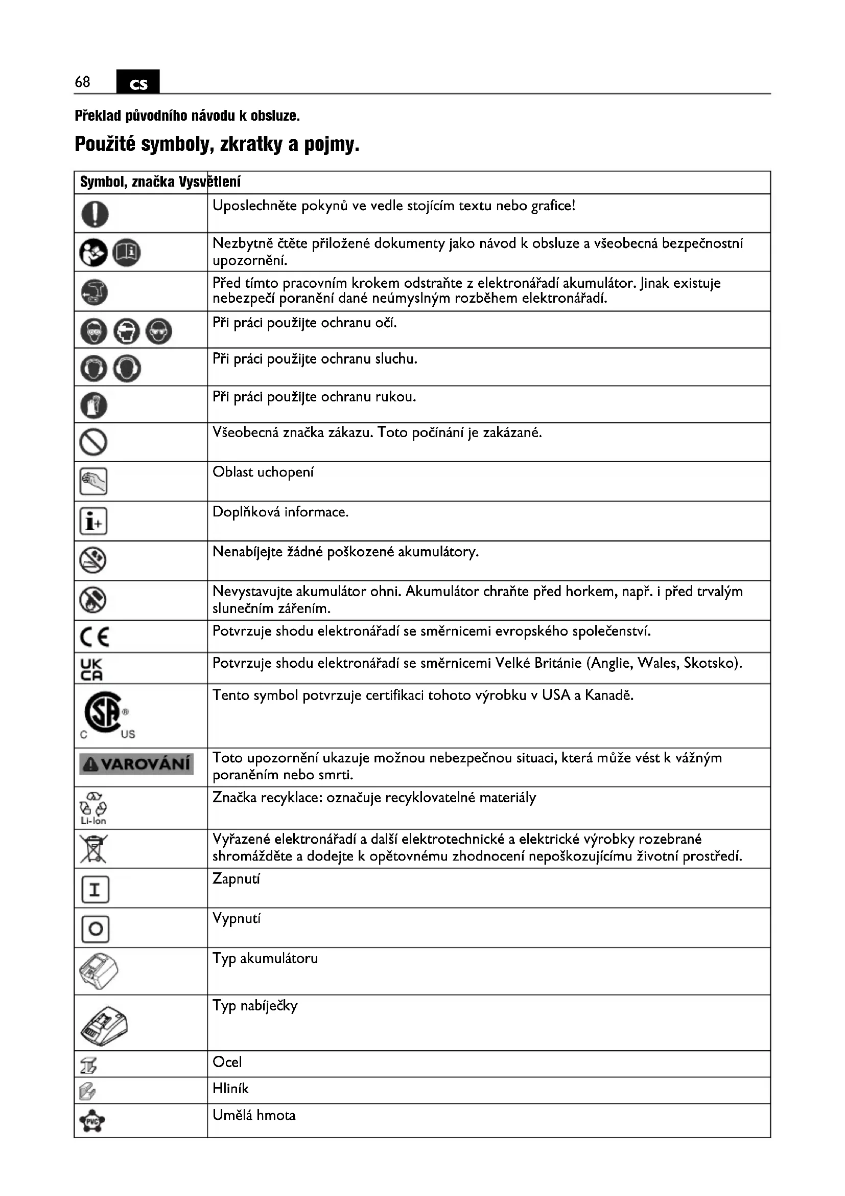 Překlad původního návodu k obsluze. Použité symboly, zkratky a pojmy. Symbol, značka Vysvětlení Uposlechněte pokynů ve vedle stojícím textu nebo grafice! Nezbytně čtěte přiložené dokumenty jako návod k obsluze a všeobecná bezpečnostní upozornění. Před tímto pracovním krokem odstraňte z elektronářadí akumulátor. Jinak existuje nebezpečí poranění dané neúmyslným rozběhem elektronářadí. Při práci použijte ochranu očí. Při práci použijte ochranu sluchu. Při práci použijte ochranu rukou. Všeobecná značka zákazu. Toto počínání je zakázané. Oblast uchopení Doplňková informace. Nenabíjejte žádné poškozené akumulátory. Nevystavujte akumulátor ohni. Akumulátor chraňte před horkem, např. i před trvalým slunečním zářením. Potvrzuje shodu elektronářadí se směrnicemi evropského společenství. Potvrzuje shodu elektronářadí se směrnicemi Velké Británie (Anglie, Wales, Skotsko). Tento symbol potvrzuje certifikaci tohoto výrobku v USA a Kanadě. Toto upozornění ukazuje možnou nebezpečnou situaci, která může vést k vážným poraněním nebo smrti. Značka recyklace: označuje recyklovatelné materiály Vyřazené elektronářadí a další elektrotechnické a elektrické výrobky rozebrané shromážděte a dodejte k opětovnému zhodnocení nepoškozujícímu životní prostředí. Zapnutí Vypnutí Typ akumulátoru Typ nabíječky Ocel Hliník Umělá hmota69
