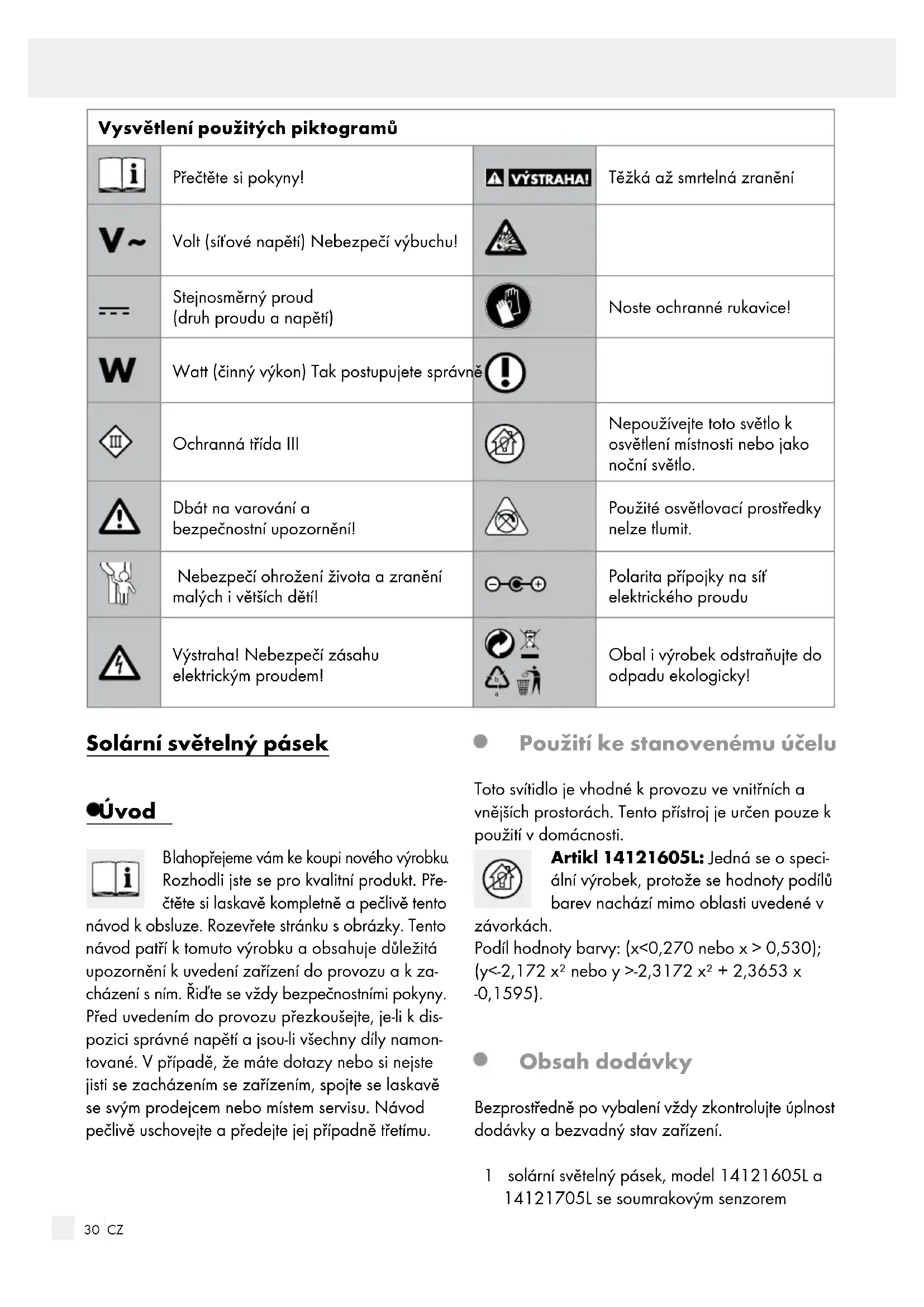 Rozhodli jste se pro kvalitní produkt. Pře- čtěte si laskavě kompletně a pečlivě tento návod k obsluze. Rozevřete stránku s obrázky. Tento návod patří k tomuto výrobku a obsahuje důležitá upozornění k uvedení zařízení do provozu a k za- cházení s ním. Řiďte se vždy bezpečnostními pokyny. Před uvedením do provozu přezkoušejte, je-li k dis- pozici správné napětí a jsou-li všechny díly namon- tované. V případě, že máte dotazy nebo si nejste jisti se zacházením se zařízením, spojte se laskavě se svým prodejcem nebo místem servisu. Návod pečlivě uschovejte a předejte jej případně třetímu. Použití ke stanovenému účelu Toto svítidlo je vhodné k provozu ve vnitřních a vnějších prostorách. Tento přístroj je určen pouze k použití v domácnosti. Artikl 14121605L: Jedná se o speci- ální výrobek, protože se hodnoty podílů barev nachází mimo oblasti uvedené v závorkách. Podíl hodnoty barvy: (x<0,270 nebo x > 0,530); (y<-2,172 x² nebo y >-2,3172 x² + 2,3653 x -0,1595). Obsah dodávky Bezprostředně po vybalení vždy zkontrolujte úplnost dodávky a bezvadný stav zařízení. 1 solární světelný pásek, model 14121605L a 14121705L se soumrakovým senzorem31 CZ Úvod / Bezpečnost Úvod 1 solární panel 4 silikonové kroužky 1 trubka stojanu 1 bodec 1 návod k obsluze Popis dílů