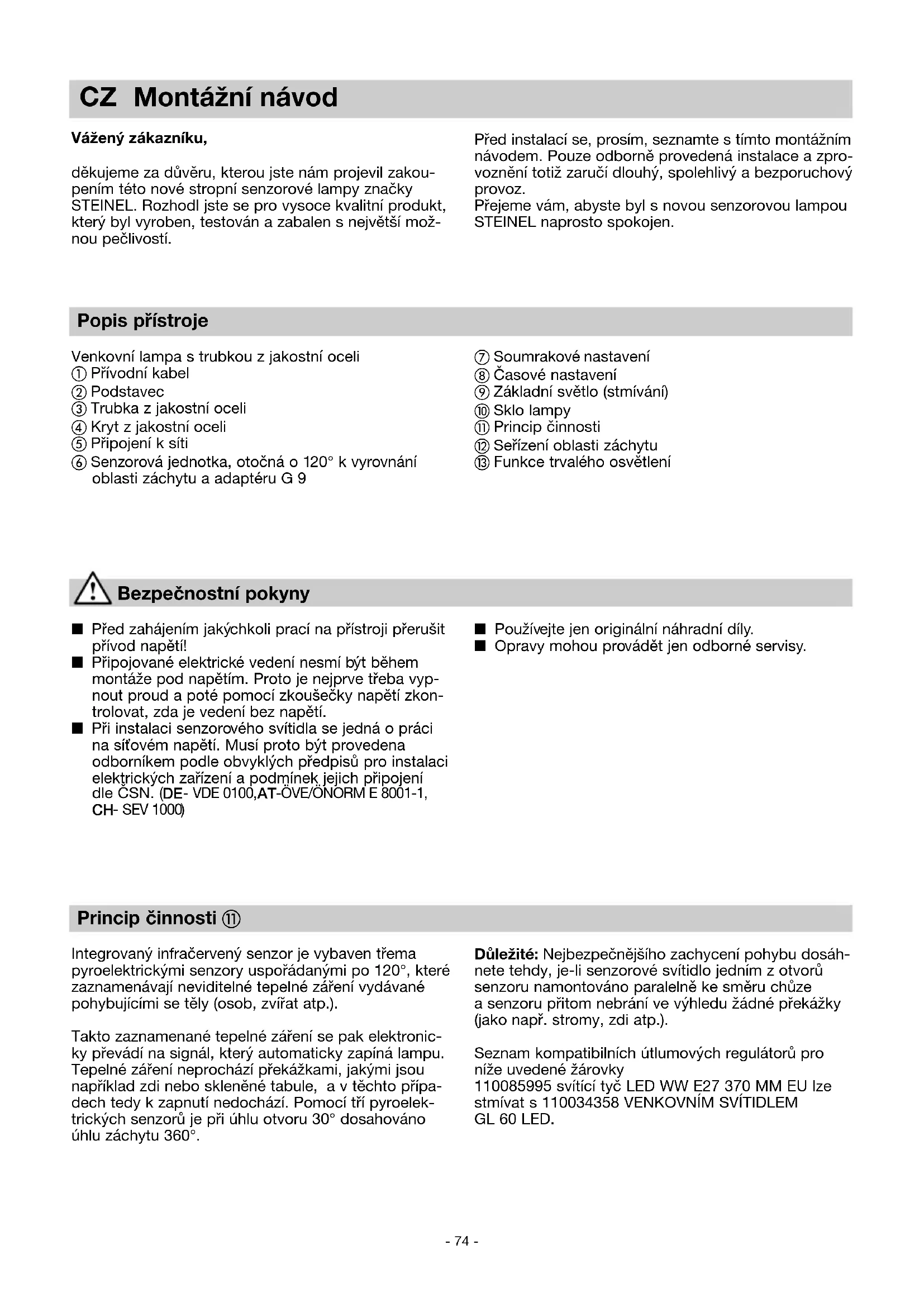 Csak az EU-országok esetében: A használt elektromos és elektronikus berendezésekre vonatkozó hatályos európai irányelvek értelmében és azok nemzeti jogrendszerbe történő átültetése szerint a már nem működőképes elektromos berendezéseket külön kell gyűjteni és környezetbarát újrahasznosításu-król kell gondoskodni. A fényforrást a végfelhasználó kicserélheti. HU- 74 - Princip činnosti 햽 Integrovaný infračervený senzor je vybaven třema pyroelektrickými senzory uspořádanými po 120°, které zaznamenávají neviditelné tepelné záření vydávané pohybujícími se těly (osob, zvířat atp.). Takto zaznamenané tepelné záření se pak elektronic- ky převádí na signál, který automaticky zapíná lampu. Tepelné záření neprochází překážkami, jakými jsou například zdi nebo skleněné tabule, a v těchto přípa- dech tedy k zapnutí nedochází. Pomocí tří pyroelek- trických senzorů je při úhlu otvoru 30° dosahováno úhlu záchytu 360°. Popis přístroje Venkovní lampa s trubkou z jakostní oceli 햲 Přívodní kabel 햳 Podstavec 햴 Trubka z jakostní oceli 햵 Kryt z jakostní oceli 햶 Připojení k síti 햷 Senzorová jednotka, otočná o 120° k vyrovnání oblasti záchytu a adaptéru G 9 CZ Montážní návod Vážený zákazníku, děkujeme za důvěru, kterou jste nám projevil zakou- pením této nové stropní senzorové lampy značky STEINEL. Rozhodl jste se pro vysoce kvalitní produkt, který byl vyroben, testován a zabalen s největší mož- nou pečlivostí. Bezpečnostní pokyny n Před zahájením jakýchkoli prací na přístroji přerušit přívod napětí! n Připojované elektrické vedení nesmí být během montáže pod napětím. Proto je nejprve třeba vyp- nout proud a poté pomocí zkoušečky napětí zkon- trolovat, zda je vedení bez napětí. n Při instalaci senzorového svítidla se jedná o práci na síťovém napětí. Musí proto být provedena odborníkem podle obvyklých předpisů pro instalaci elektrických zařízení a podmínek jejich připojení dle ČSN. (