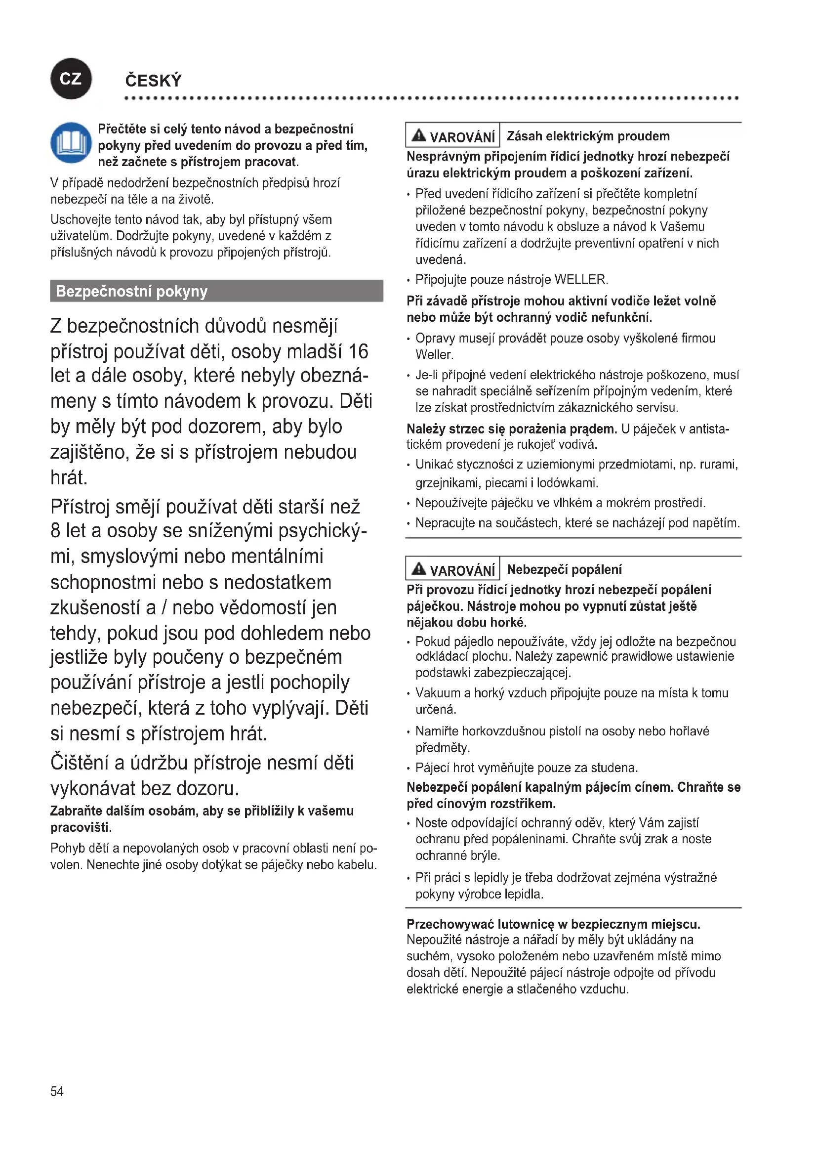 mi, smyslovými nebo mentálními schopnostmi nebo s nedostatkem zkušeností a / nebo vědomostí jen tehdy, pokud jsou pod dohledem nebo jestliže byly poučeny o bezpečném používání přístroje a jestli pochopily nebezpečí, která z toho vyplývají. Děti si nesmí s přístrojem hrát. Čištění a údržbu přístroje nesmí děti vykonávat bez dozoru. Zabraňte dalším osobm, aby se přiblížily k vašemu pracovišti. Pohyb dětí a nepovolaných osob v pracovní oblasti není po- volen. Nenechte jiné osoby dotýkat se páječky nebo kabelu. VAROVÁNÍ Zsah elektrickým proudem Nesprvným připojením řídicí jednotky hrozí nebezpečí razu elektrickým proudem a poškození zařízení.