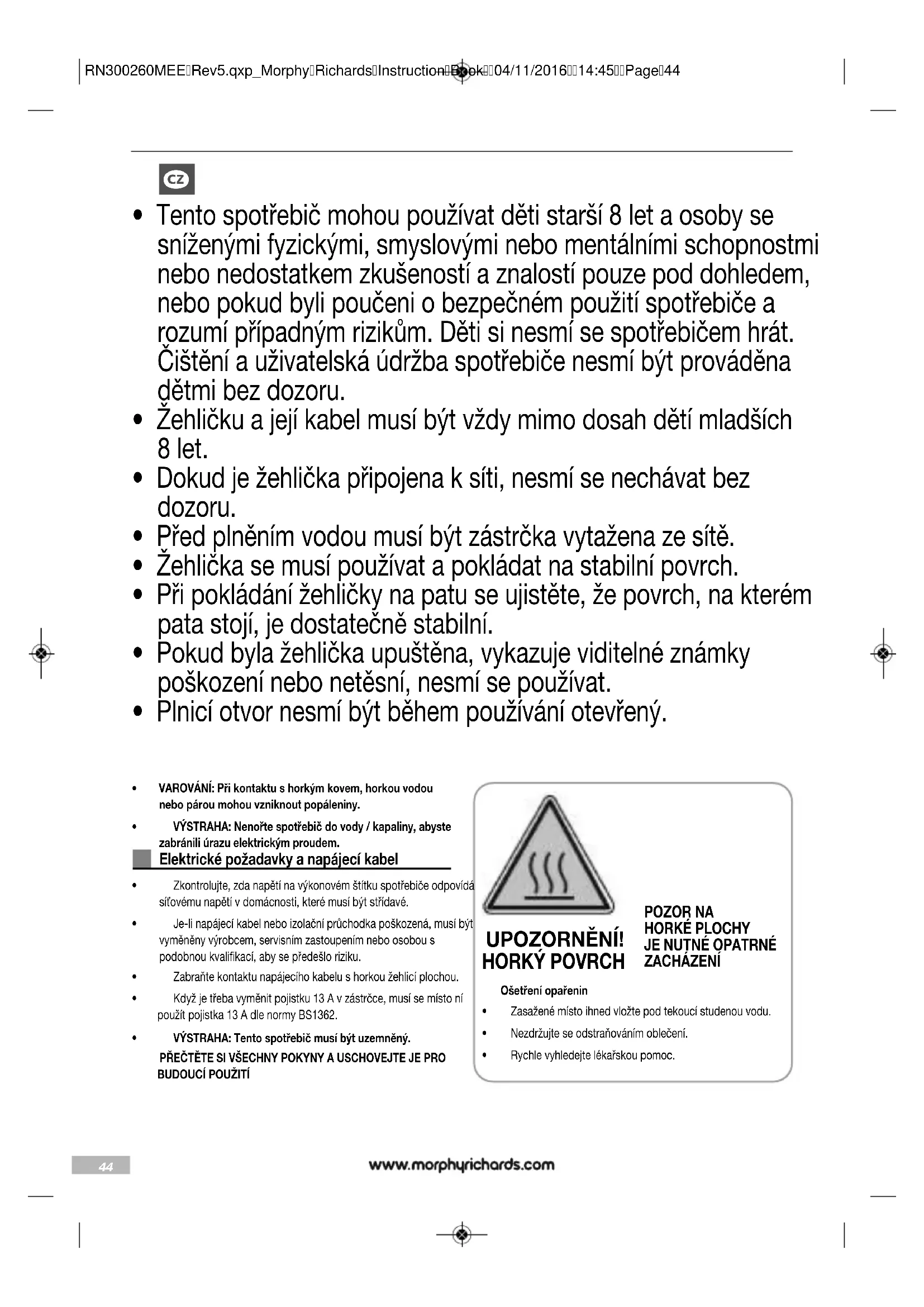Když skončíte s žehlením, vypojte žehličku ze zásuvky, vylijte z ní všechnu vodu a nastavte spínač páry do polohy ‘ ’. Když vychladne, žehličku uskladněte na patě, kolem které volně omotáte napájecí kabel. Samočištění V žehličce je vestavěn čisticí systém, jehož úkolem je chránit vodní ventil, parní komoru a parní otvory před textilními vlákny a volnými minerálními usazeninami. 1 Naplňte žehličku z poloviny vodou. 2 Položte žehličku na patu. 3 Přepněte stavitelný spínač páry (1) do polohy ‘MAX’. 4 Zapojte napájecí kabel do zásuvky. 5 Nastavte volič teploty (9) do polohy ‘MAX’. Viz krok 2 v rámci „Použití žehličky pro žehlení s napařováním“. 6 Kontrolka teploty (10) svítí, dokud není dosaženo požadované teploty, a poté zhasne. Vyčkejte na ještě jeden cyklus - kontrolka teploty se rozsvítí a zhasne. 7 Odpojte žehličku ze síťové zásuvky. 8 Zatímco je žehlička stále velmi horká, držte ji vodorovně nad dřezem. RN300260MEERev5.qxp_MorphyRichardsInstructionBook04/11/201614:45Page4647 9 Zatímco držíte stavitelný spínač páry (1) v samočisticí poloze, lehce pohybujte žehličkou sem a tam, dokud se zásobník vody nevyprázdní. VÝSTRAHA: Z otvorů na žehlicí ploše bude vycházet pára a vřící horká voda. Tím se vyplaví vodní kámen a minerály usazené uvnitř parní komory. 10 Po dokončení čištění nastavte stavitelný spínač páry zpět do polohy ‘O’. 11 Položte napařovací žehličku na patu a nechte ji zcela vychladnout. 12 Otřete žehlicí plochu (6) studeným vlhkým hadrem. Po dokončení čištění vyprázdněte zbytek vody. VÝSTRAHA: Udržujte ruce a tělo mimo dosah horké vody. VÝSTRAHA: Nepokoušejte se odstraňovat vodní kámen ze žehlicí plochy pomocí výrobků na odstraňování vodního kamene. Kontaktujte nás Linka podpory Pokud máte se svým přístrojem problémy, kontaktujte nás na lince podpory, budeme vám patrně schopni pomoci lépe, než v obchodu, kde jste přístroj zakoupili. Před telefonátem si připravte název výrobku, modelové číslo a sériové číslo, urychlíte tak vyřízení svého dotazu. Promluvte si s námi Pokud máte nějako dotazy nebo komentáře, nebo chcete získat některé vhodné tipy, abyste svůj produkt mohli využívat co nejlépe, spojte se s námi online: Blog: www.morphyrichards.co.uk/blog Facebook: www.facebook.com/morphyrichardsuk Twitter: www.twitter.com/loveyourmorphy Webové stránky: www.morphyrichards.com